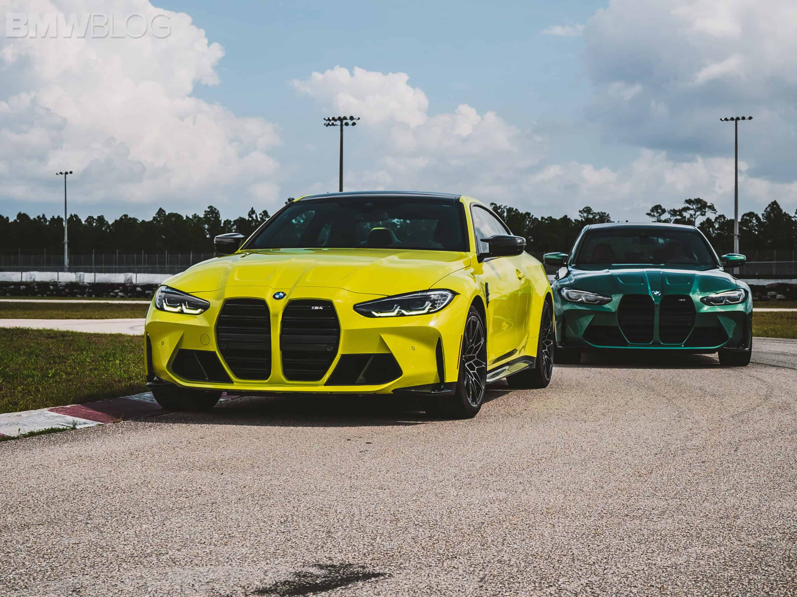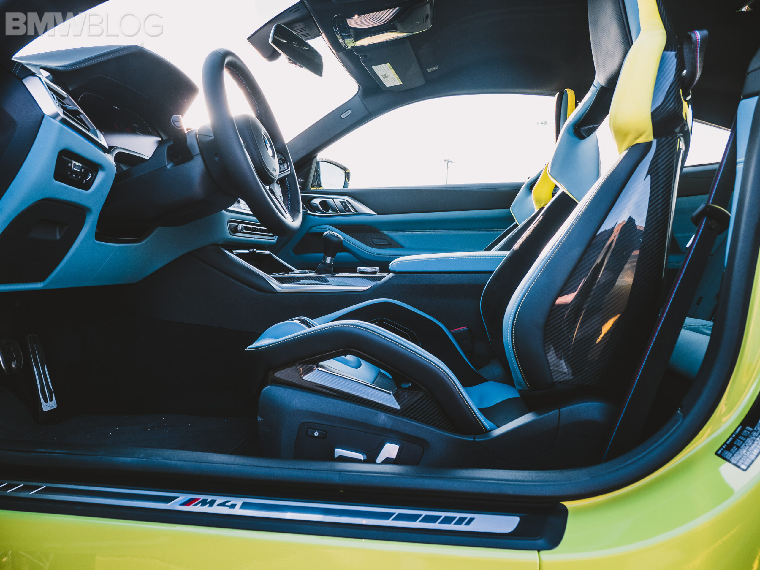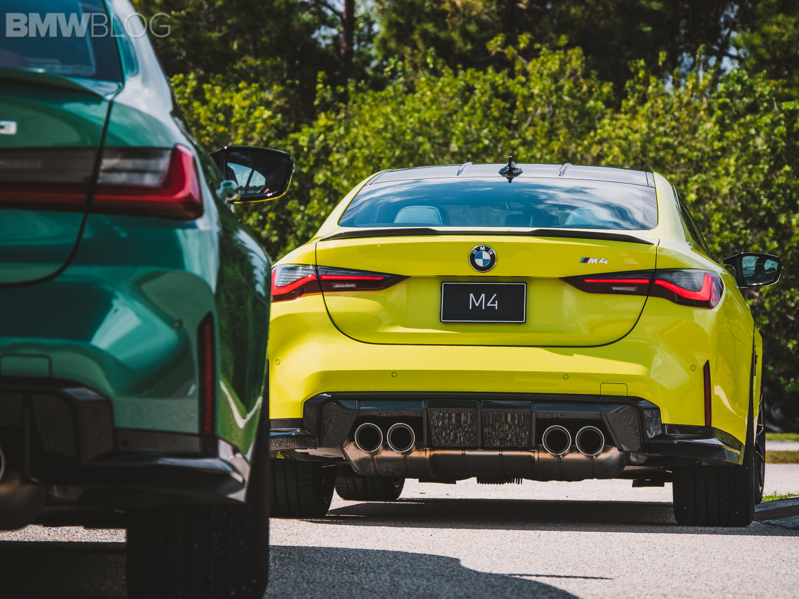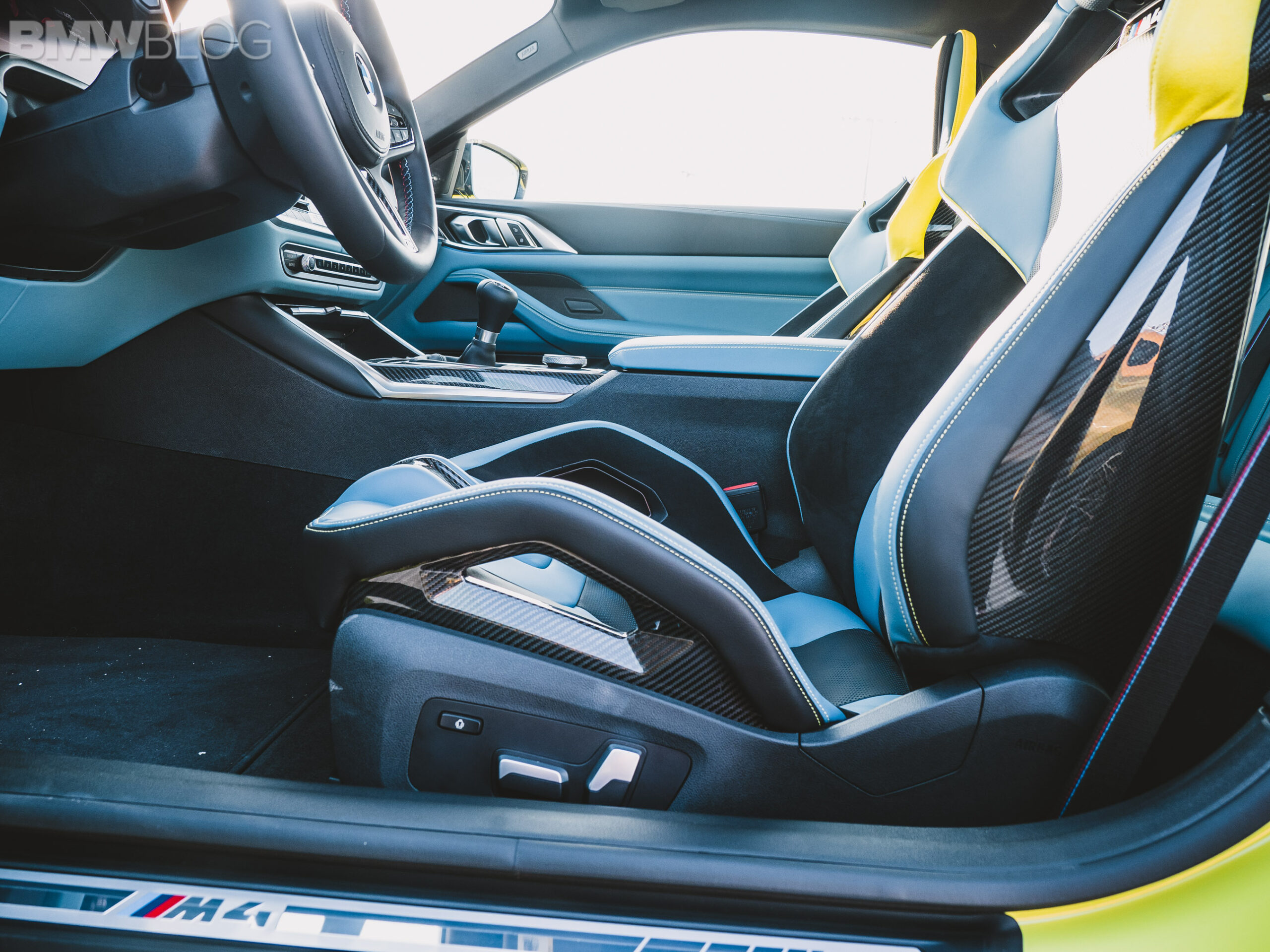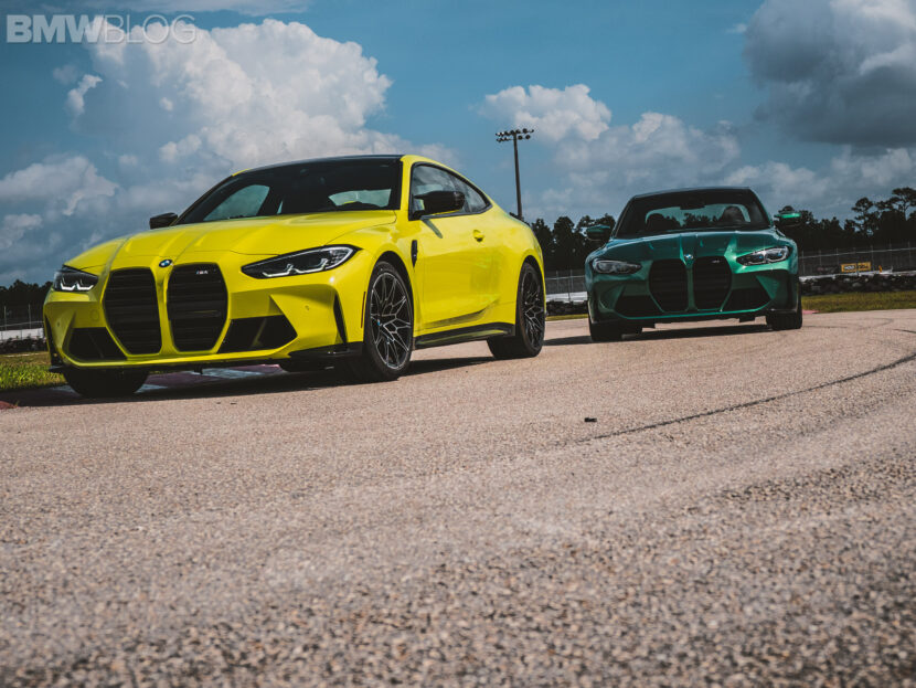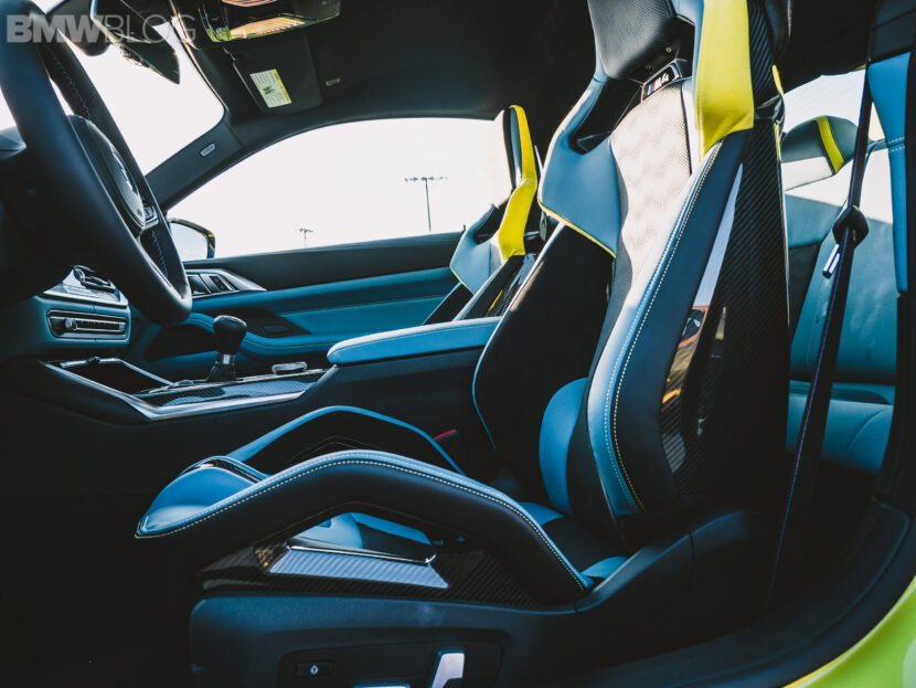 The two cars presented in Palm Beach were both rear-wheel drive and with the six speed manual. Whereas the G80 M3 in Isle of Man Green was in a stock form – no carbon fiber aero package, standard seats – the G82 M4 in Sao Paulo Yellow was decked out with the M Carbon Package, along with the carbon fiber sport seats with a BMW Individual leather.
