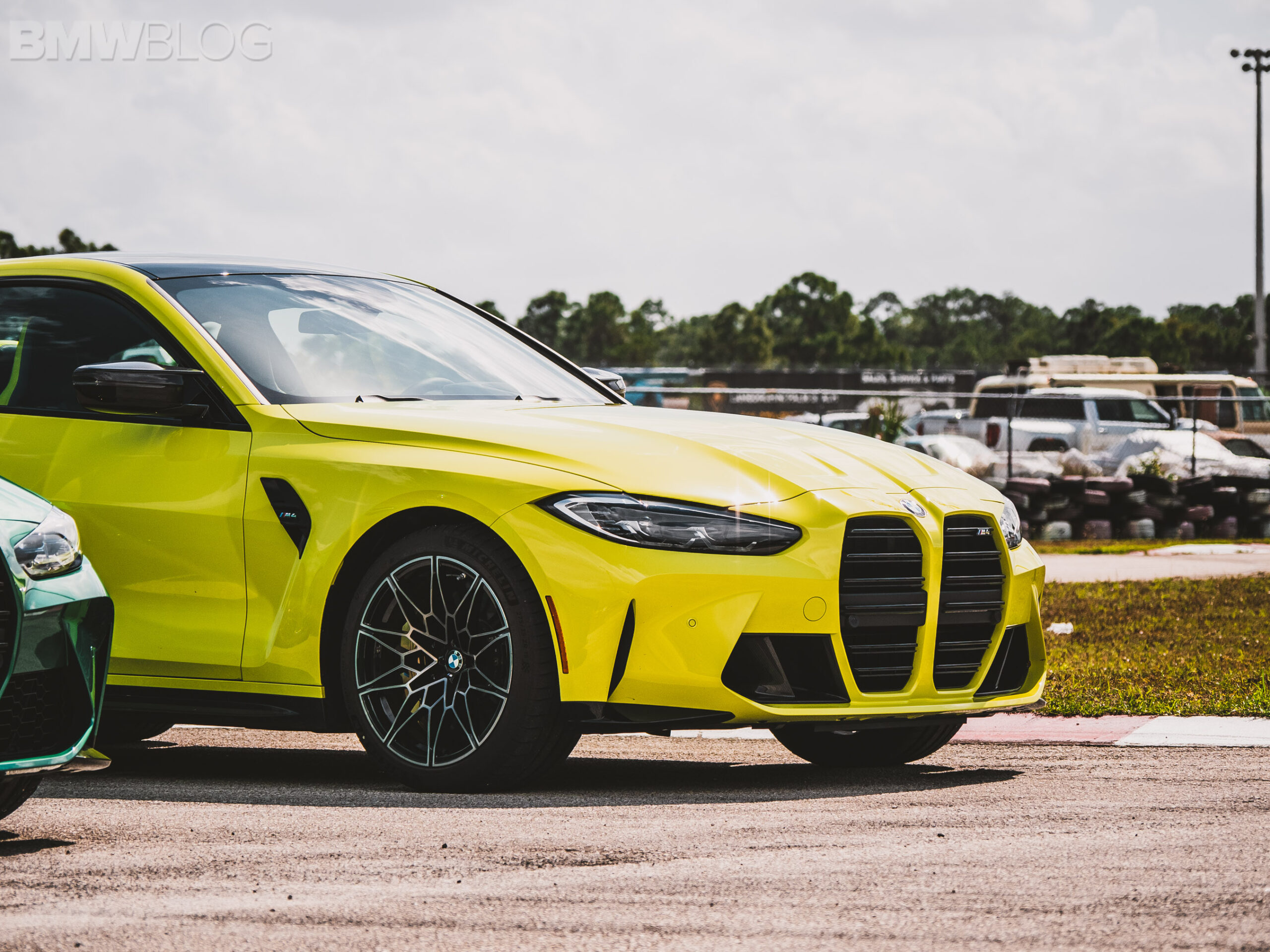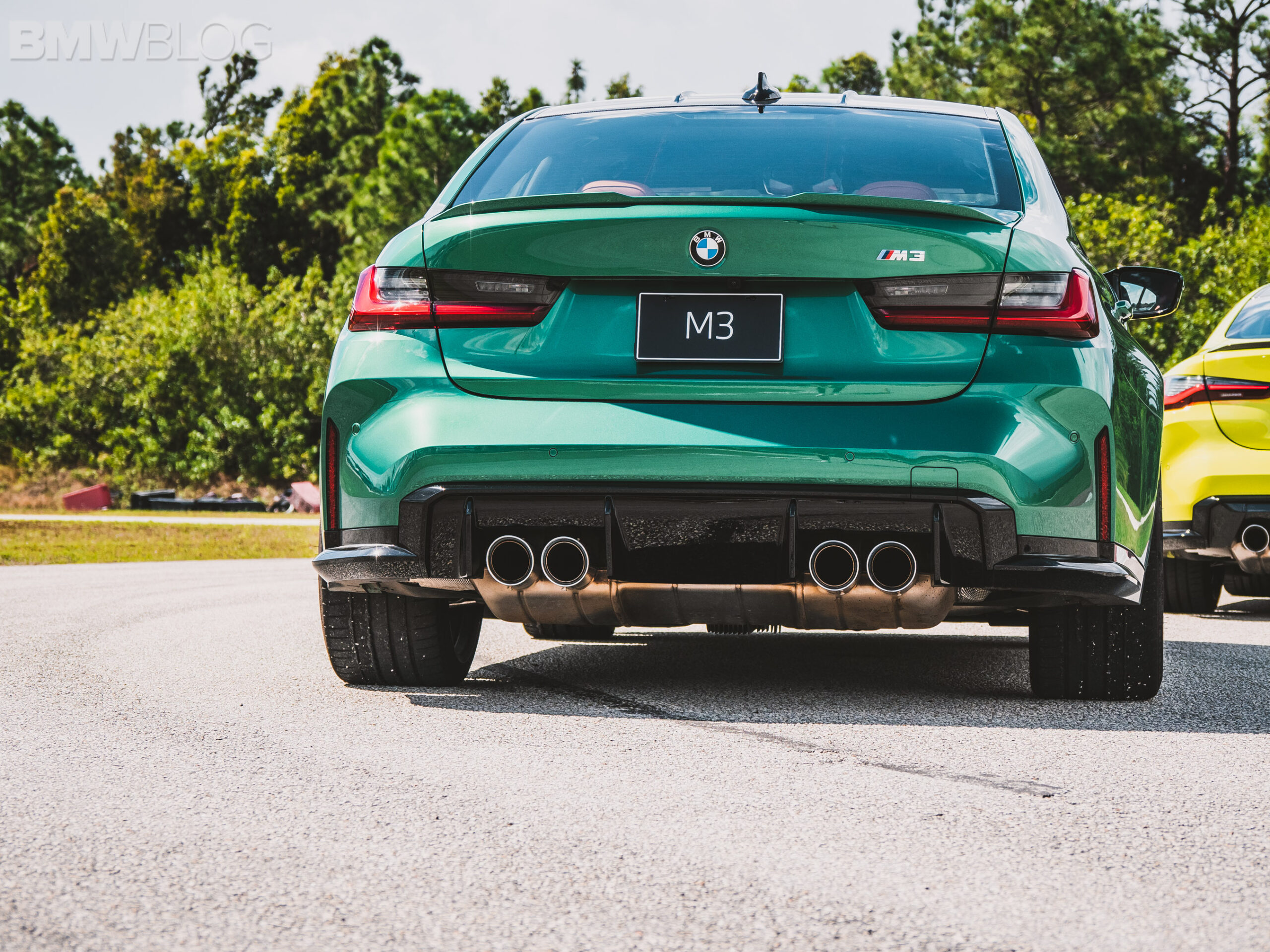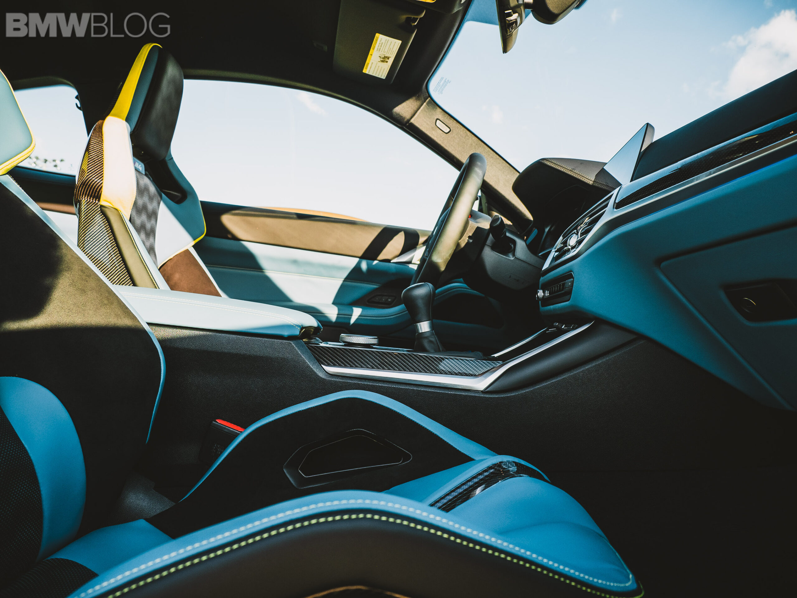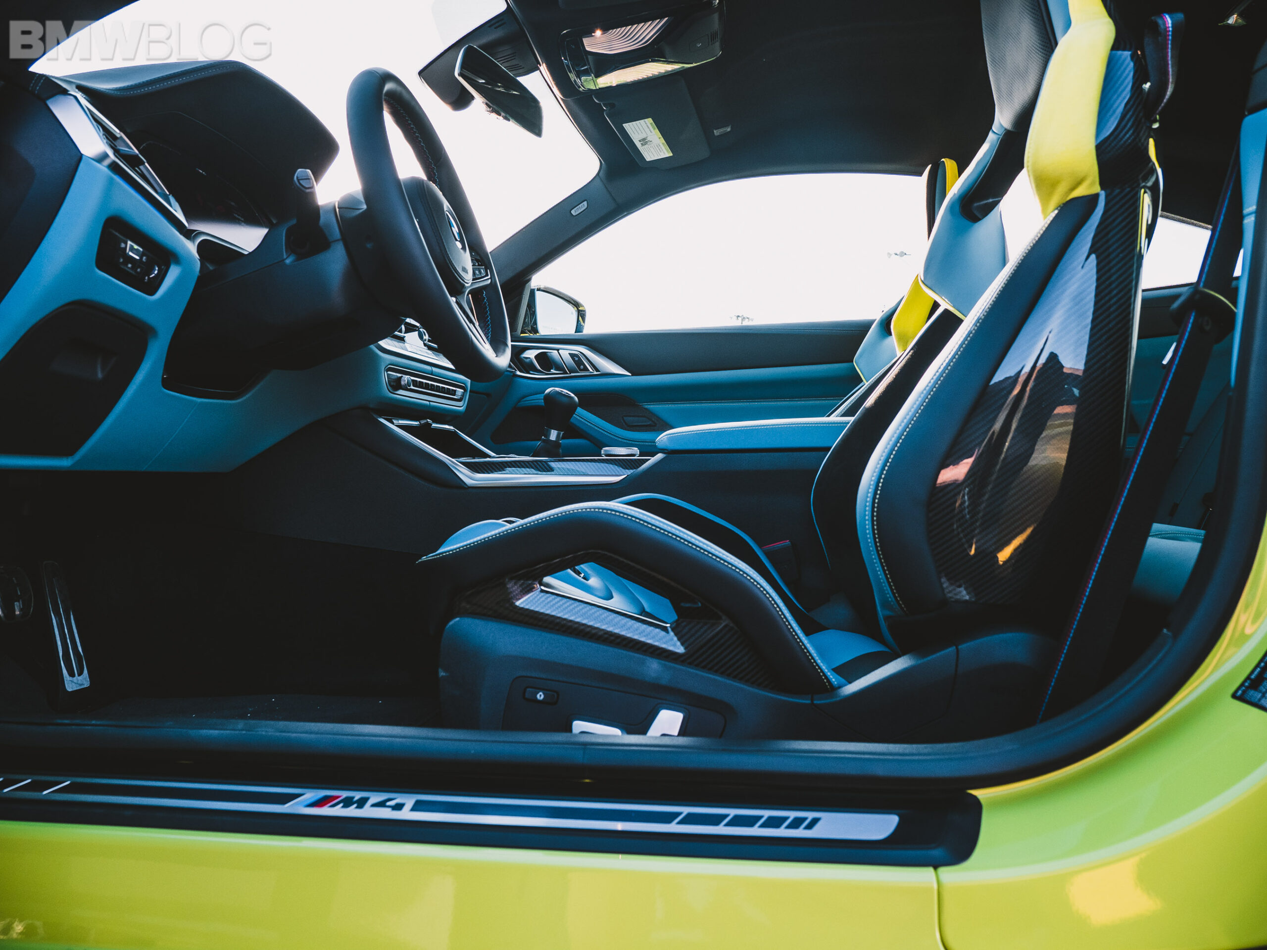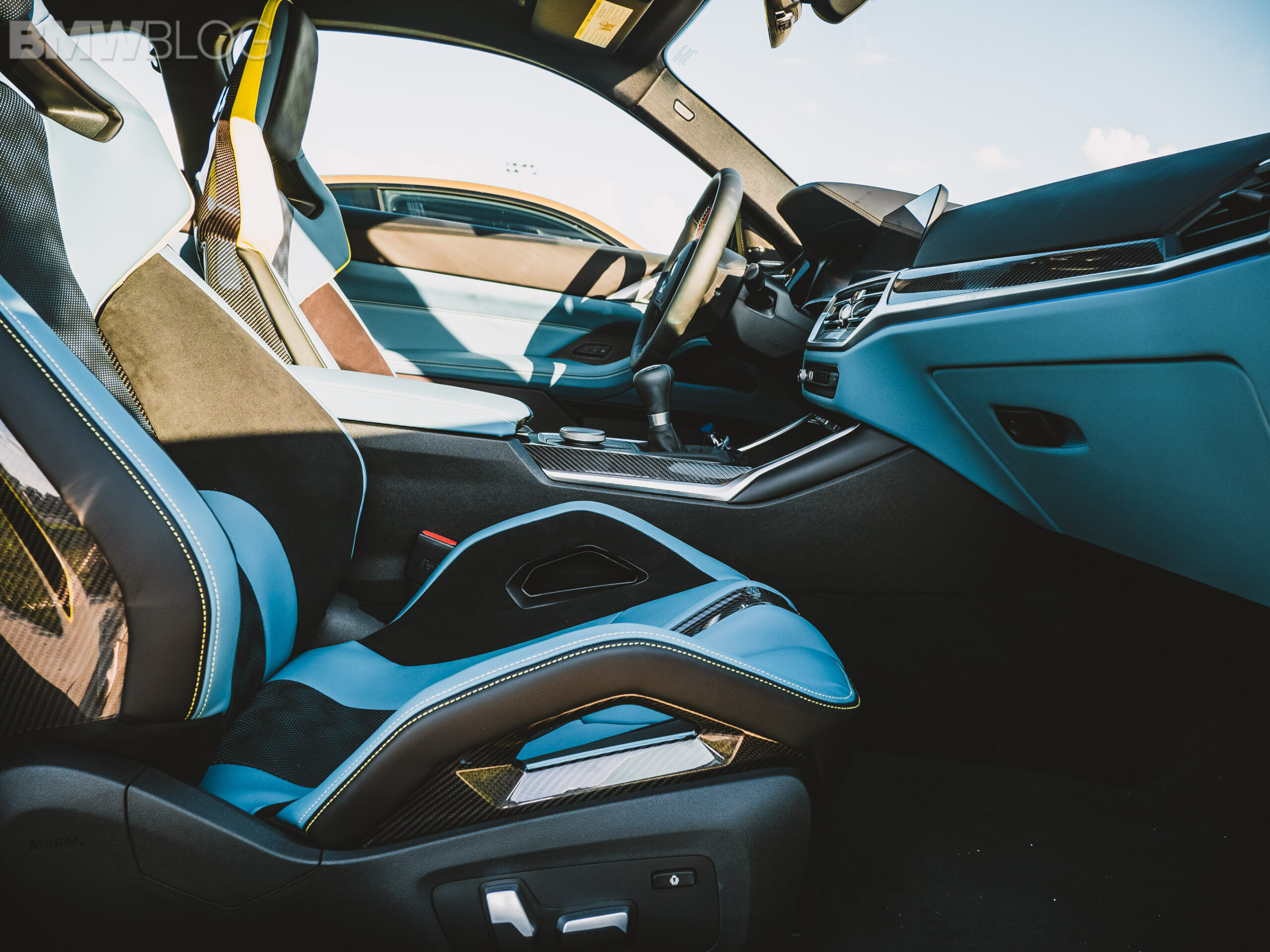 The two cars presented in Palm Beach were both rear-wheel drive and with the six speed manual. Whereas the G80 M3 in Isle of Man Green was in a stock form – no carbon fiber aero package, standard seats – the G82 M4 in Sao Paulo Yellow was decked out with the M Carbon Package, along with the carbon fiber sport seats with a BMW Individual leather.