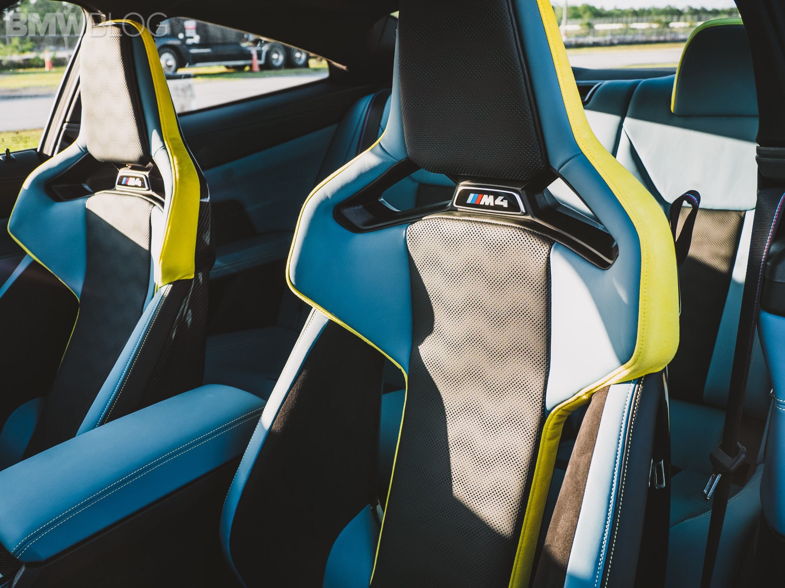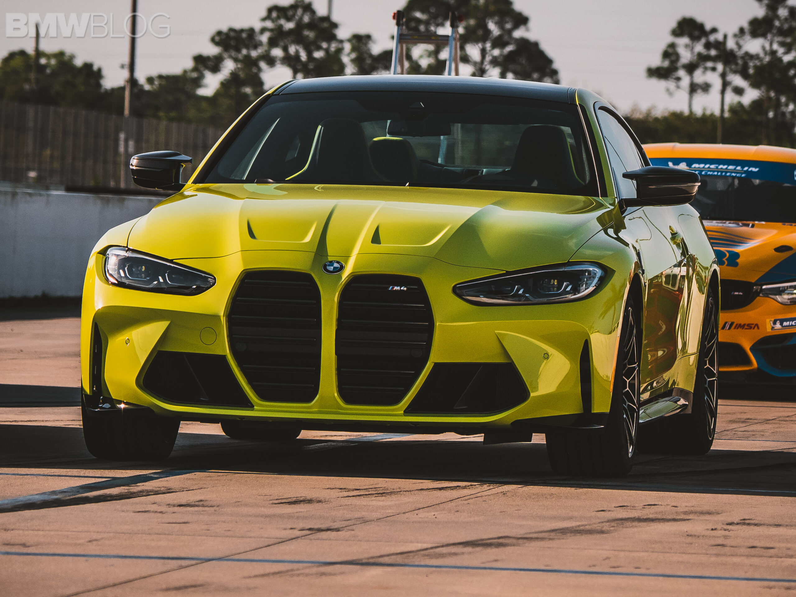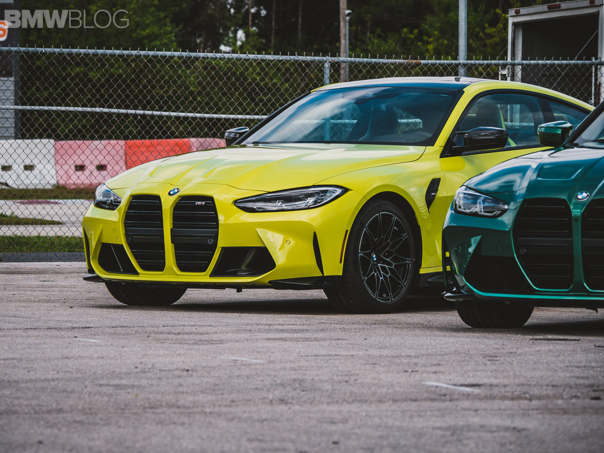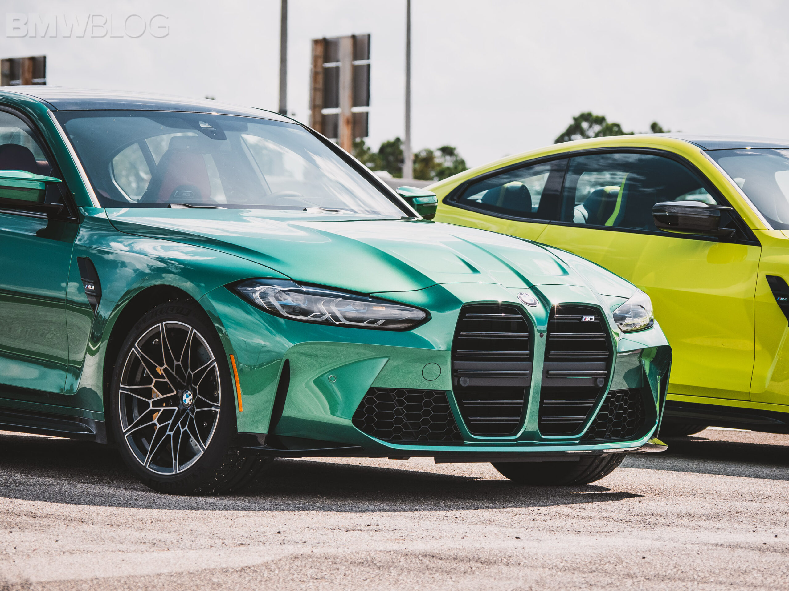 The two cars presented in Palm Beach were both rear-wheel drive and with the six speed manual. Whereas the G80 M3 in Isle of Man Green was in a stock form – no carbon fiber aero package, standard seats – the G82 M4 in Sao Paulo Yellow was decked out with the M Carbon Package, along with the carbon fiber sport seats with a BMW Individual leather.
