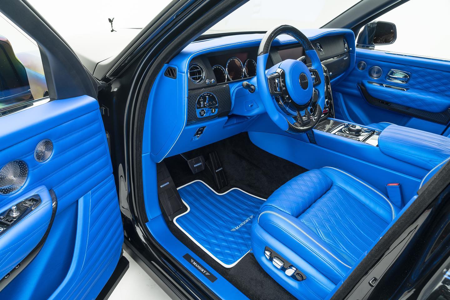 Everything inside is done to Mansory spec, from the quilted leather on the seats to the same motif applied to the doors. Even the rich standard Cullinan floor mats were changed out with some Mansory-spec ones. and almost everything is wrapped int he same shade of blue. The notable exceptions are the steering wheel (which also has some carbon fiber bits) and the dash. There’s no mention of any upgrade happening under the hood but Mansory did mention this Cullinan can do 0-100 km/h in about 5 seconds.