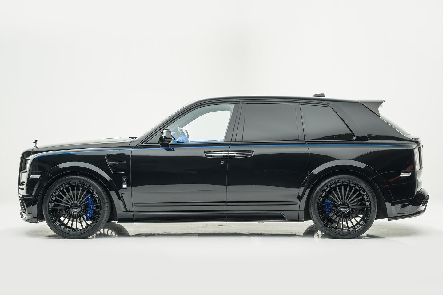 The luxury SUV is wearing a black on black finish on the outside with a single stand out feature: the coach stripe, which in this case has been done in a striking shade of blue. And you simply can’t miss it in that sea of black. The front bumper was changed too, the side sills as well , while the front fenders are now featuring side gills. The blue color for the stripe wasn’t a coincidence either. Open the doors and you’re welcome by a sea of blue, creating quite a powerful contrast.