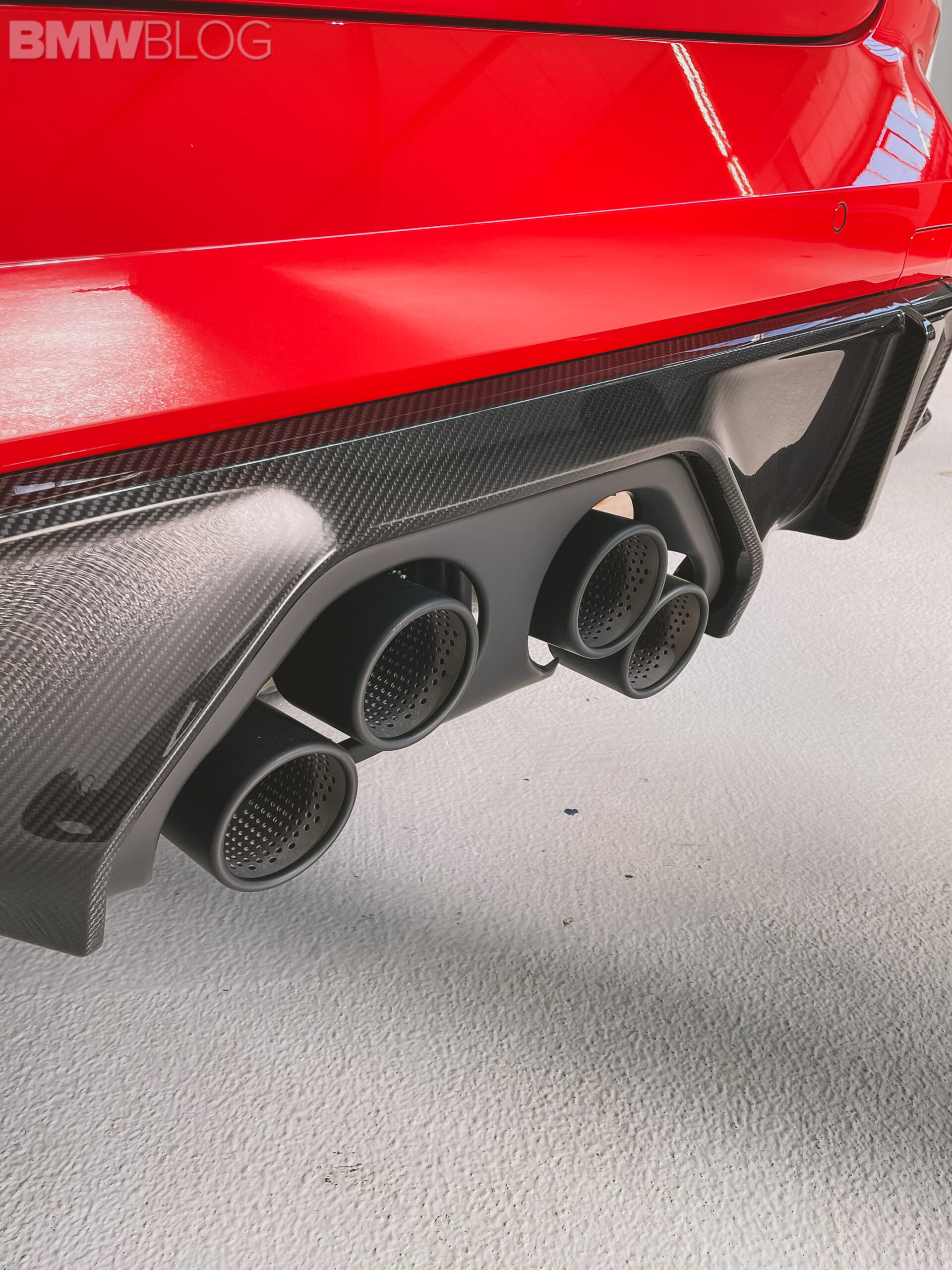 Here is the first sound clip of the M Performance Exhaust system for the new 2021 BMW M3 and M4. We also included a comparison clip with the regular exhaust for the 2021 BMW M3 and M4. The M Performance Exhaust system for the new M3 and M4 is the first of its kind. It features a triangular layout of its titanium pipes and is placed in the middle of the diffuser. The lightweight exhaust system has flap control and weighs around five kilograms less than standard exhaust. It also delivers a sportier sound, thanks to the exhaust gas routing.