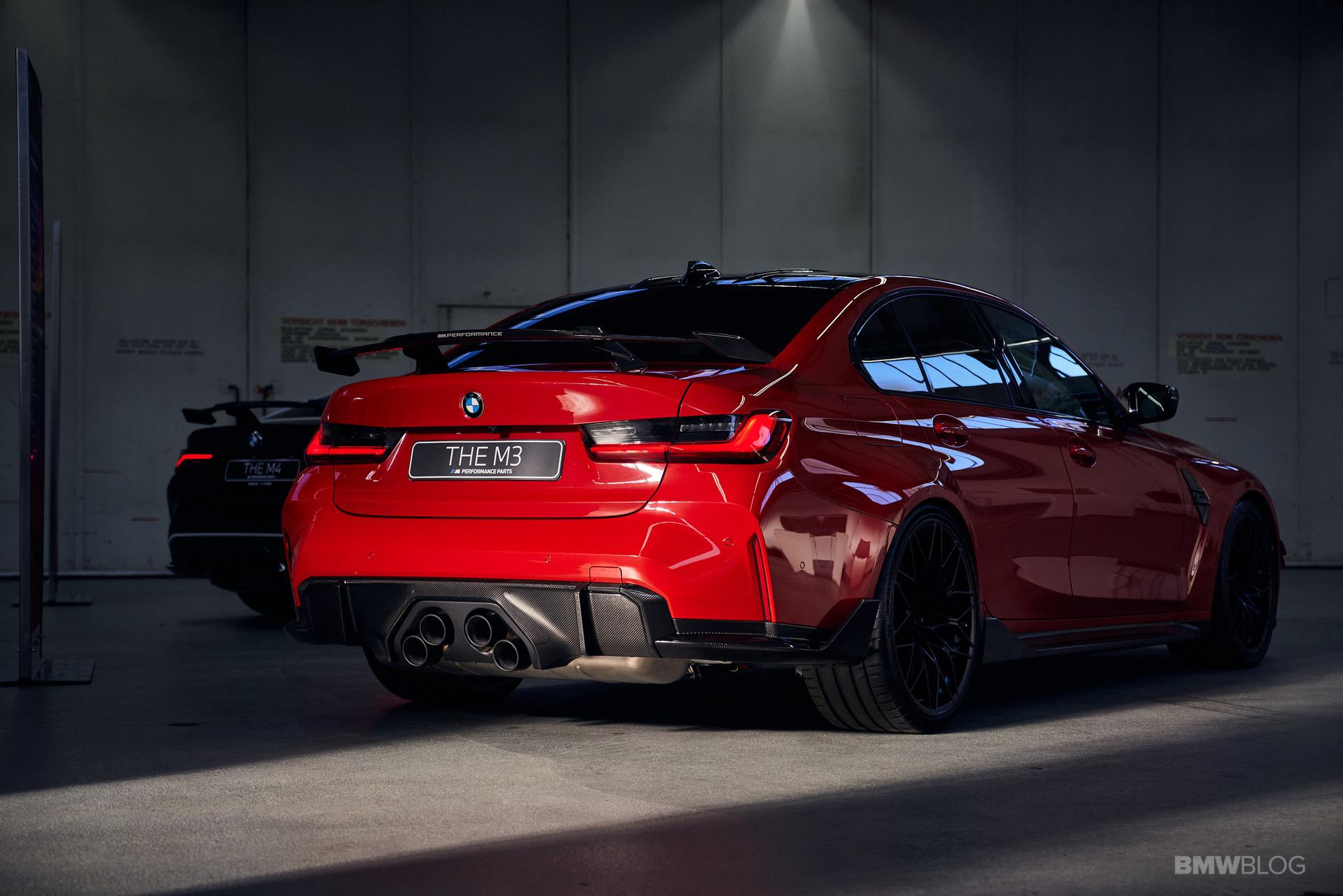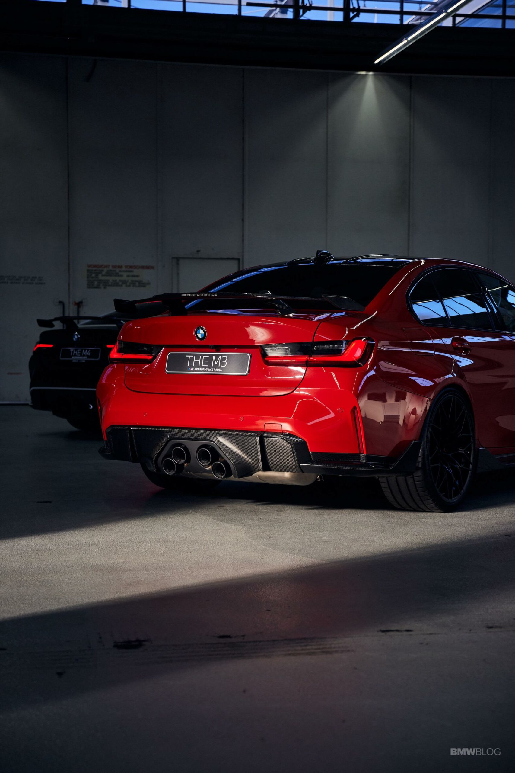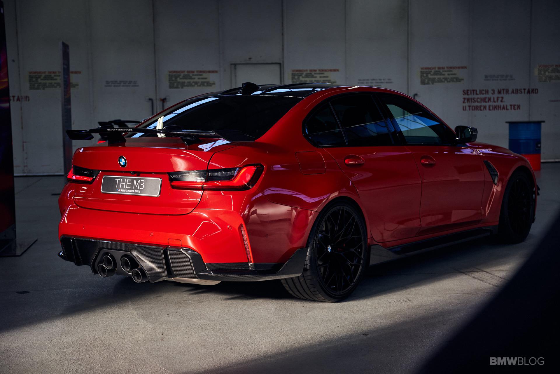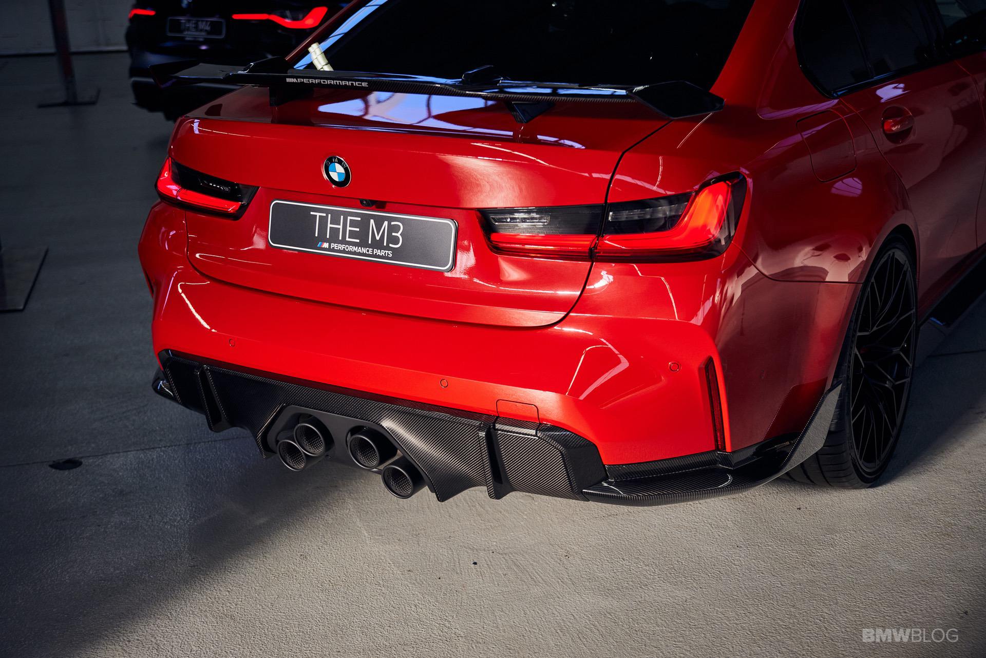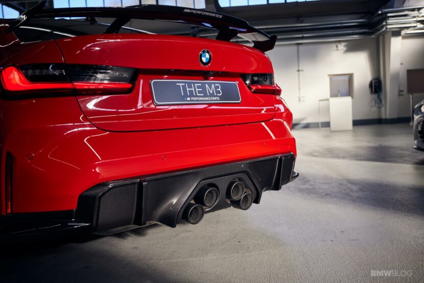 After featuring the new BMW M4 with M Performance Parts just yesterday, today we have another photo gallery. This time is the G80 M3 Sedan which is adorned with M Performance Parts. It also features the Toronto Red color. At the center of those new M Performance Parts is the exhaust system. For the first time, the aftermarket exhaust sports a triangular layout of its titanium pipes and is placed in the middle of the diffuser. The lightweight exhaust system has flap control and weighs around five kilograms less than standard exhaust. It also delivers a sportier sound (video here), thanks to the exhaust gas routing. In addition, the exhaust system is around seven kilograms lighter than the standard version.