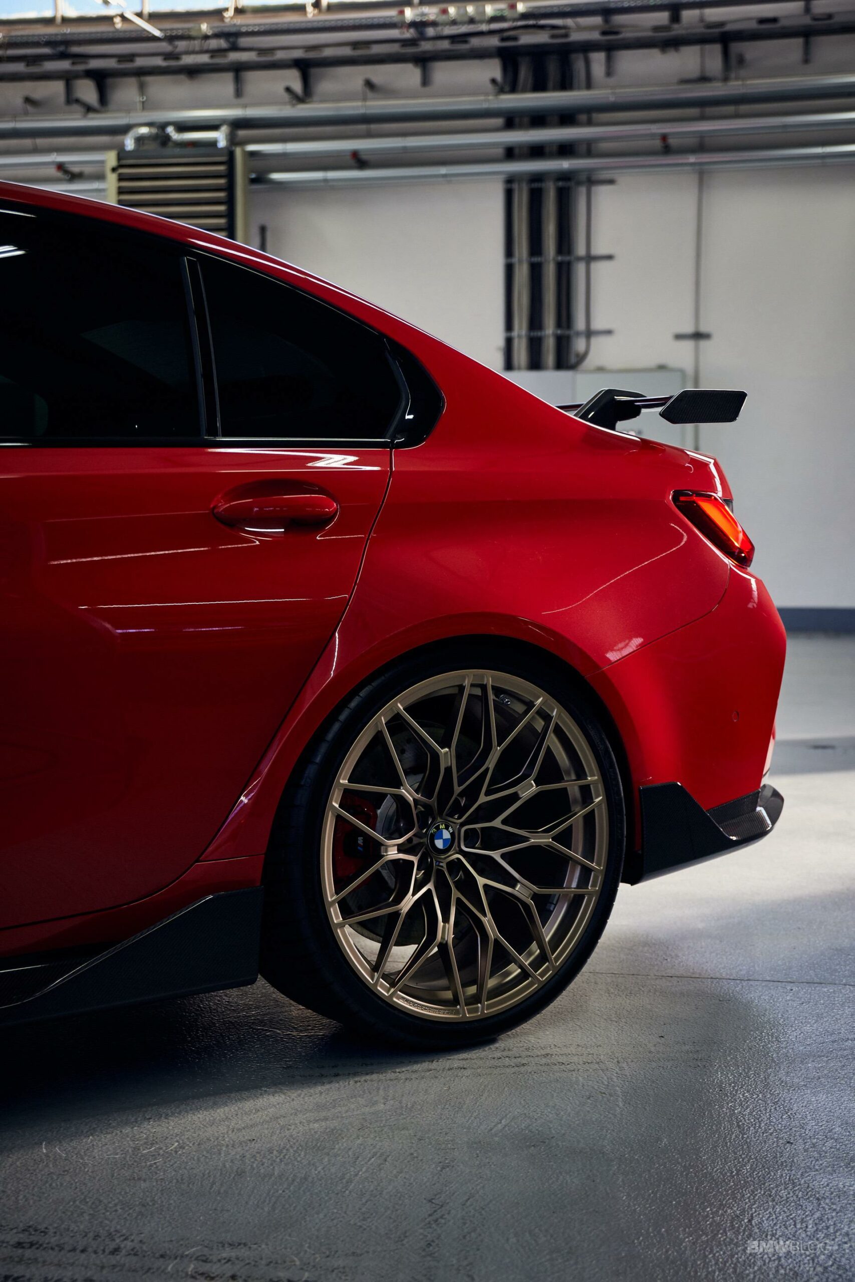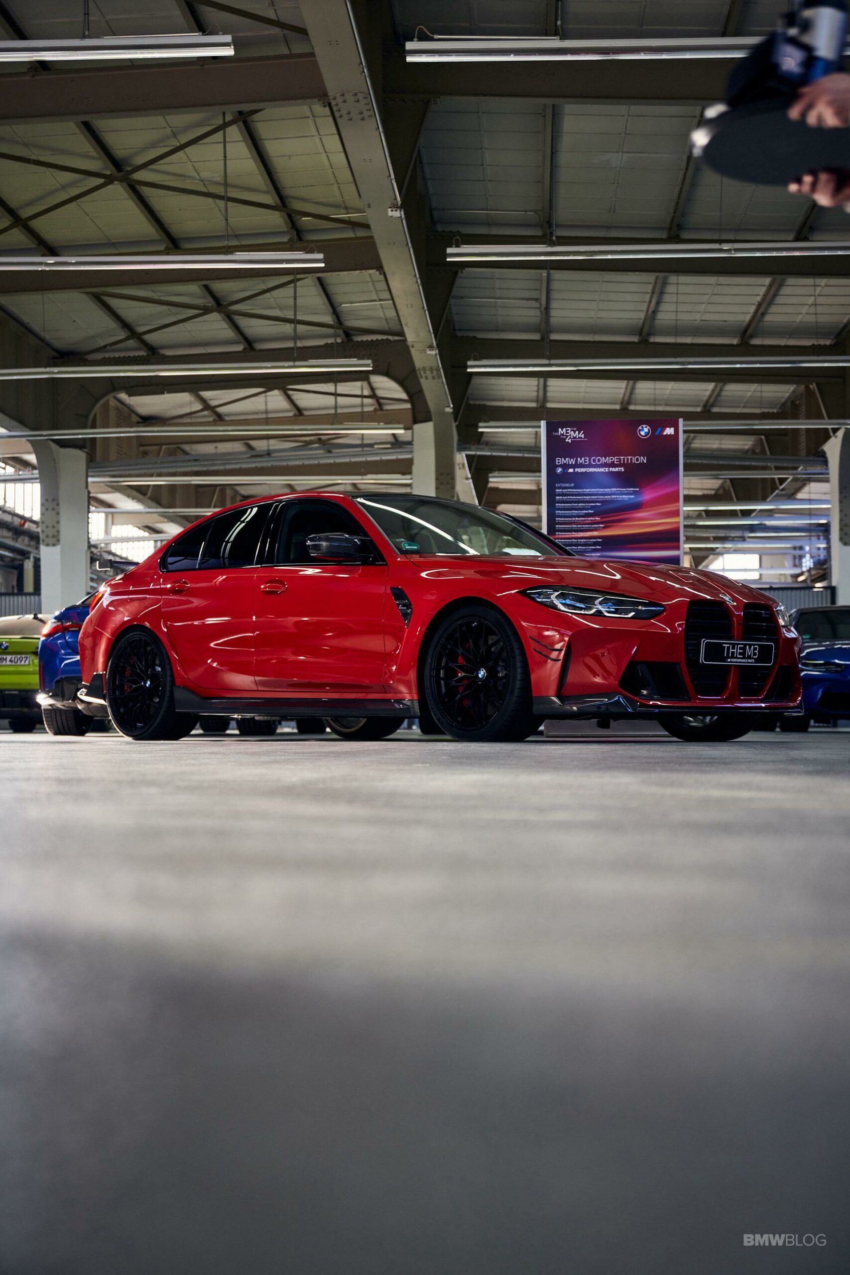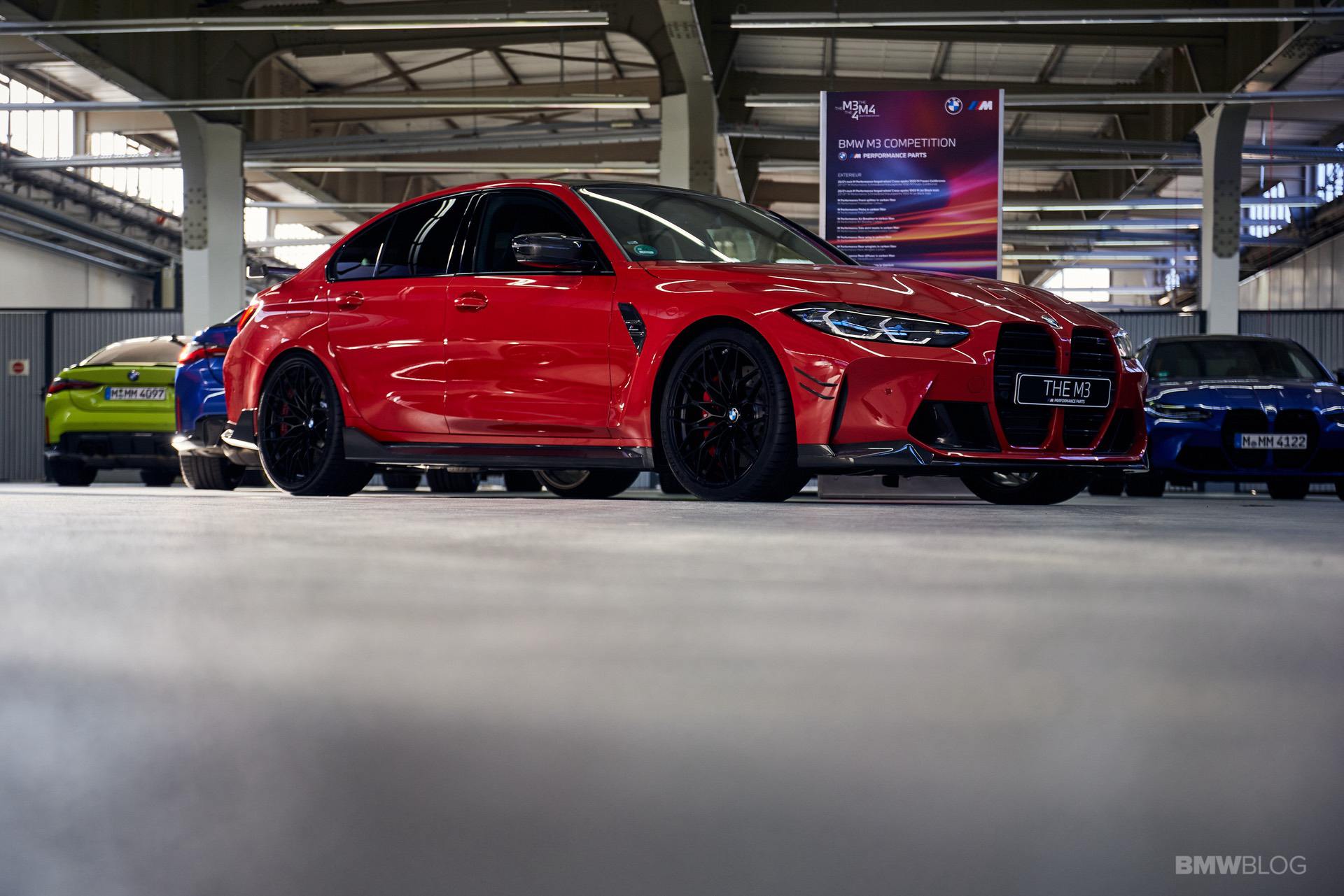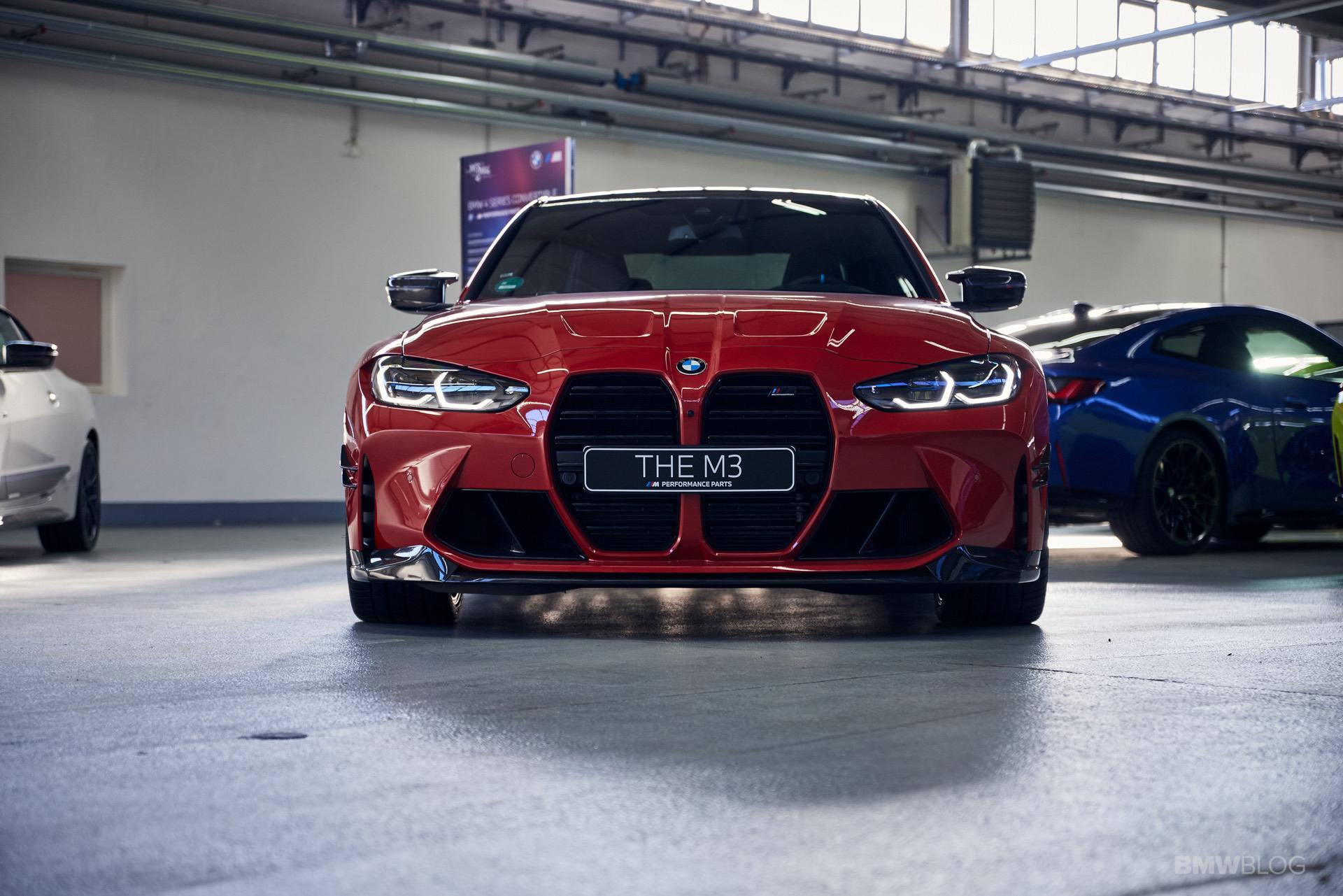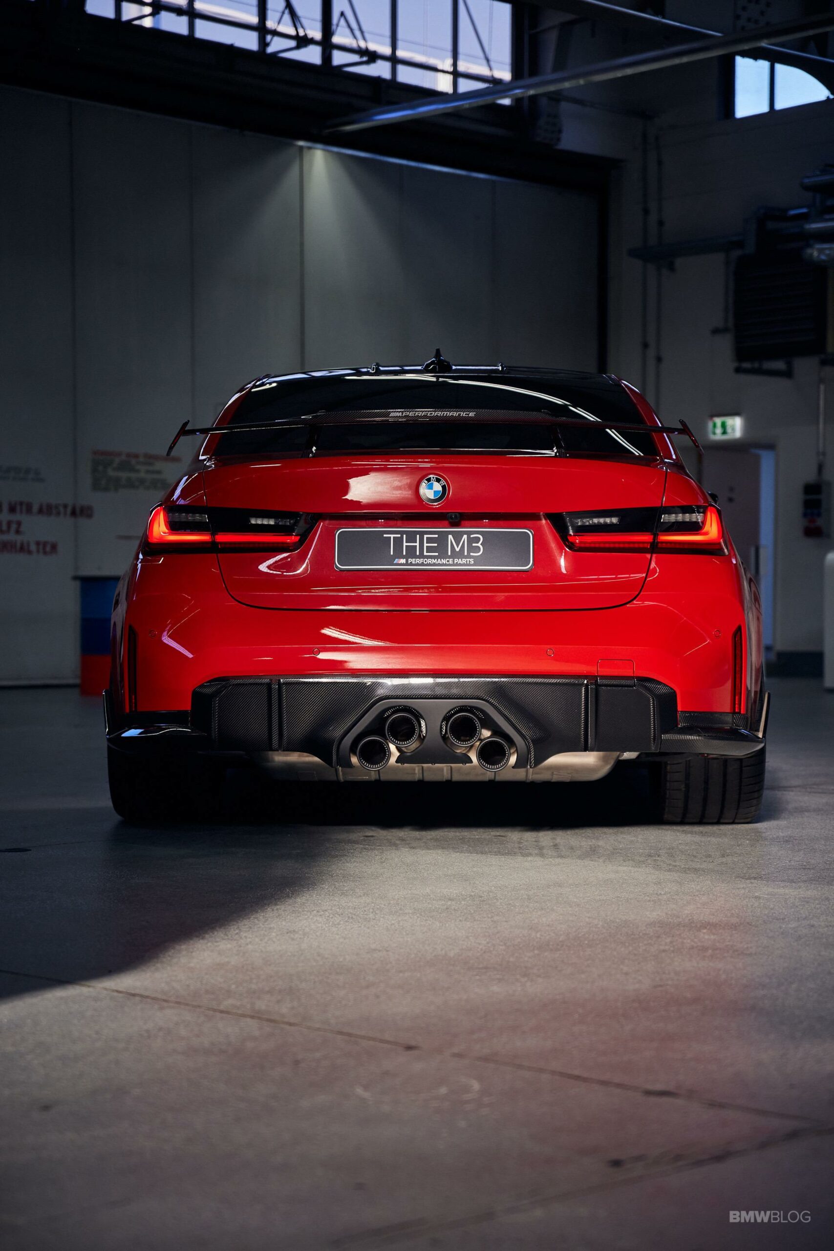After featuring the new BMW M4 with M Performance Parts just yesterday, today we have another photo gallery. This time is the G80 M3 Sedan which is adorned with M Performance Parts. It also features the Toronto Red color. At the center of those new M Performance Parts is the exhaust system. For the first time, the aftermarket exhaust sports a triangular layout of its titanium pipes and is placed in the middle of the diffuser. The lightweight exhaust system has flap control and weighs around five kilograms less than standard exhaust. It also delivers a sportier sound (video here), thanks to the exhaust gas routing. In addition, the exhaust system is around seven kilograms lighter than the standard version.