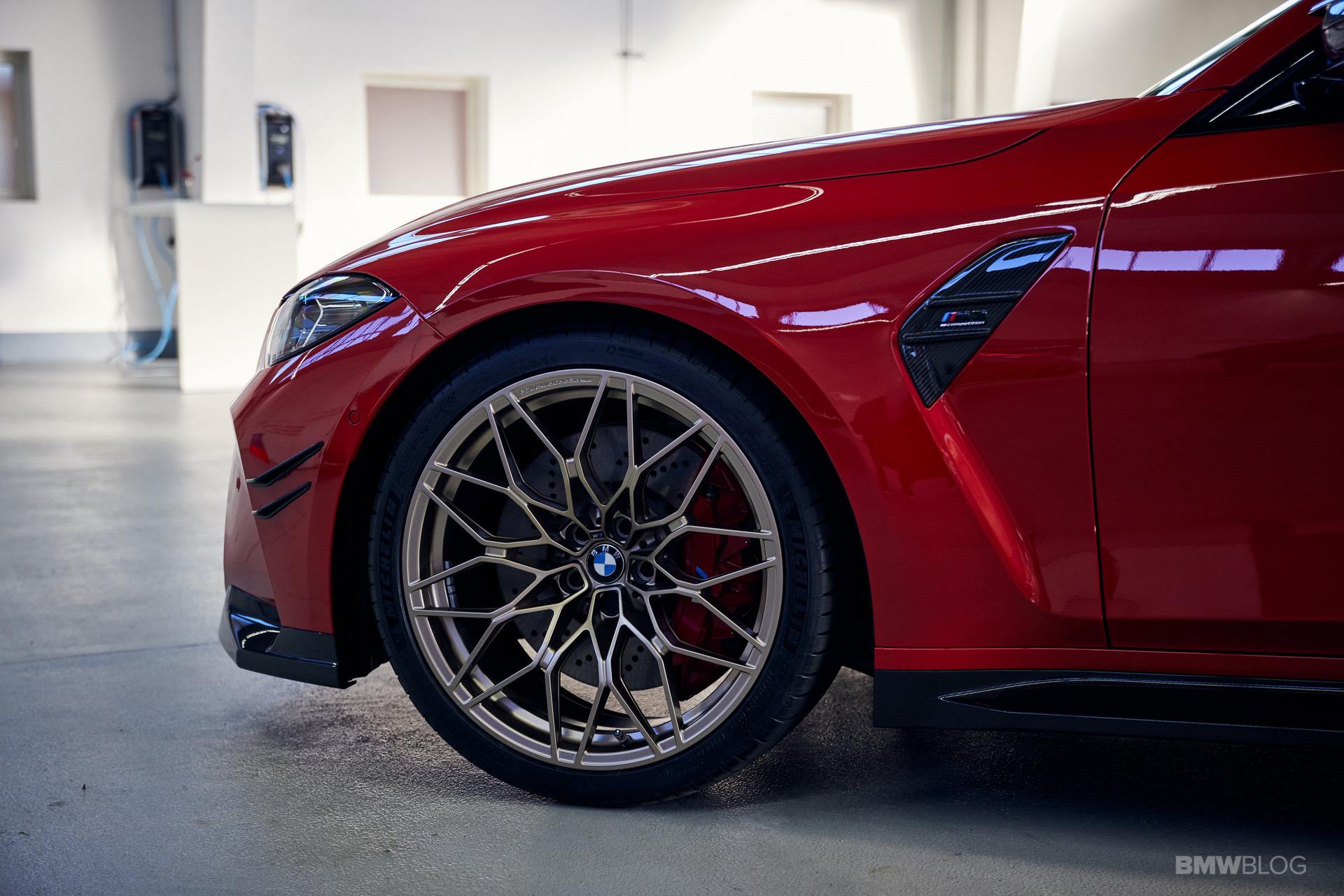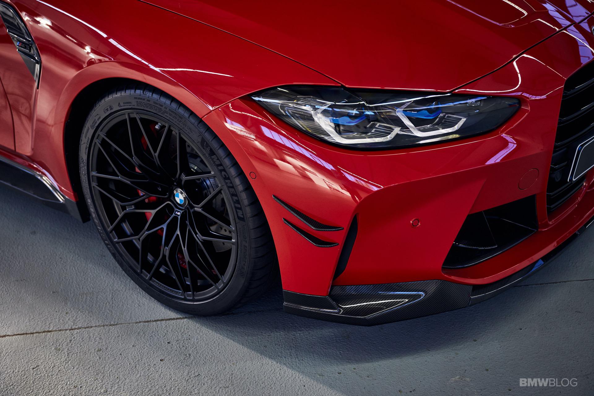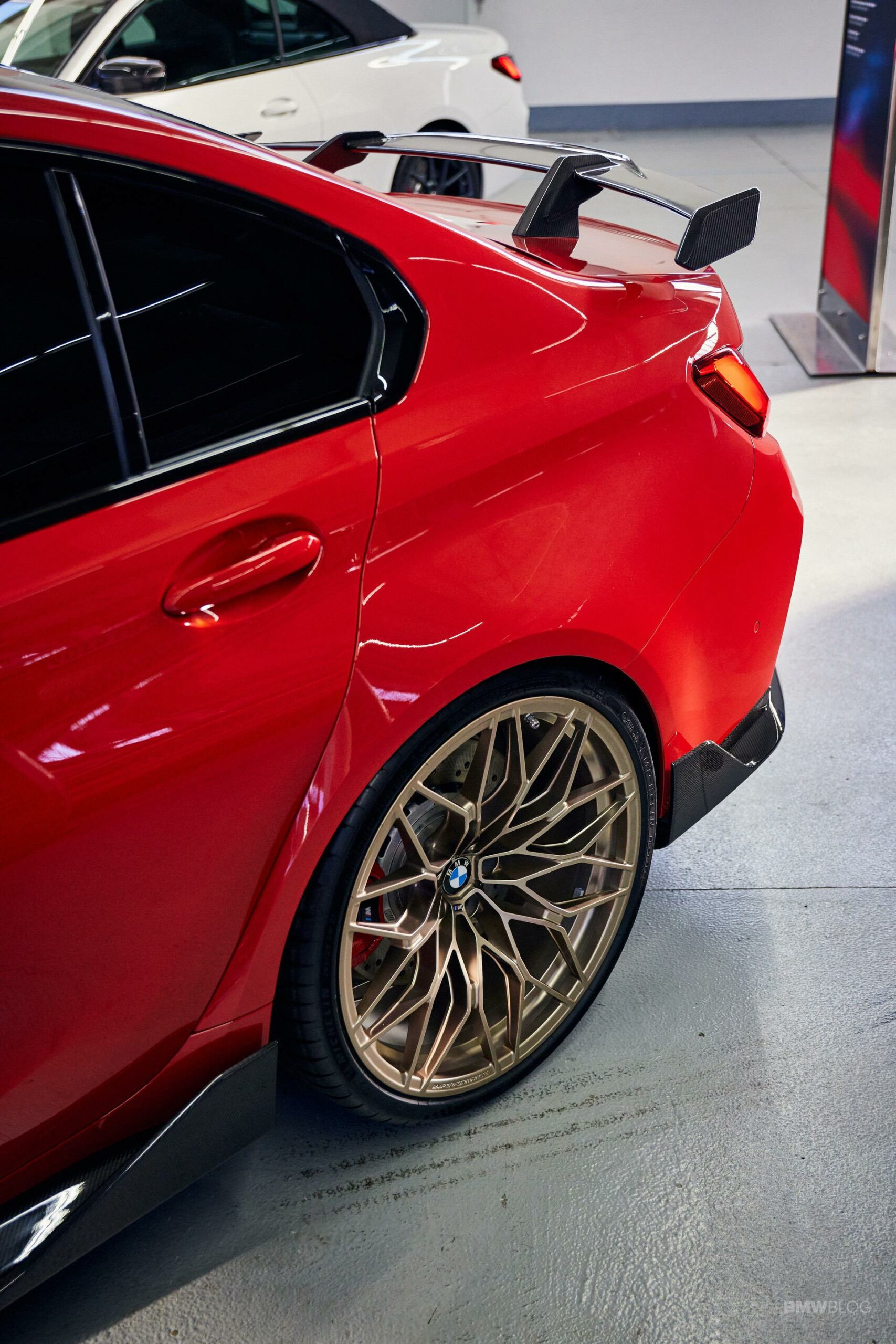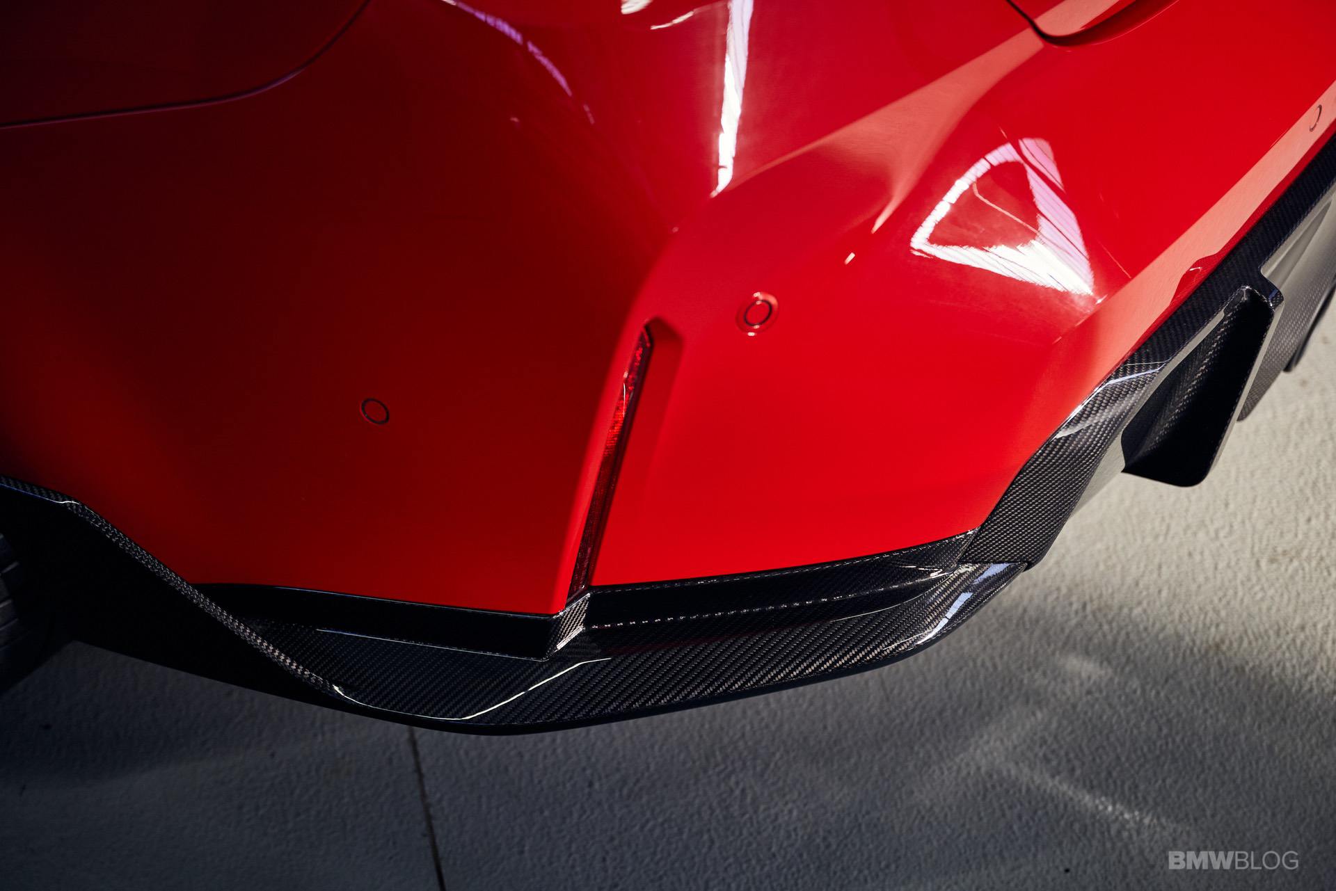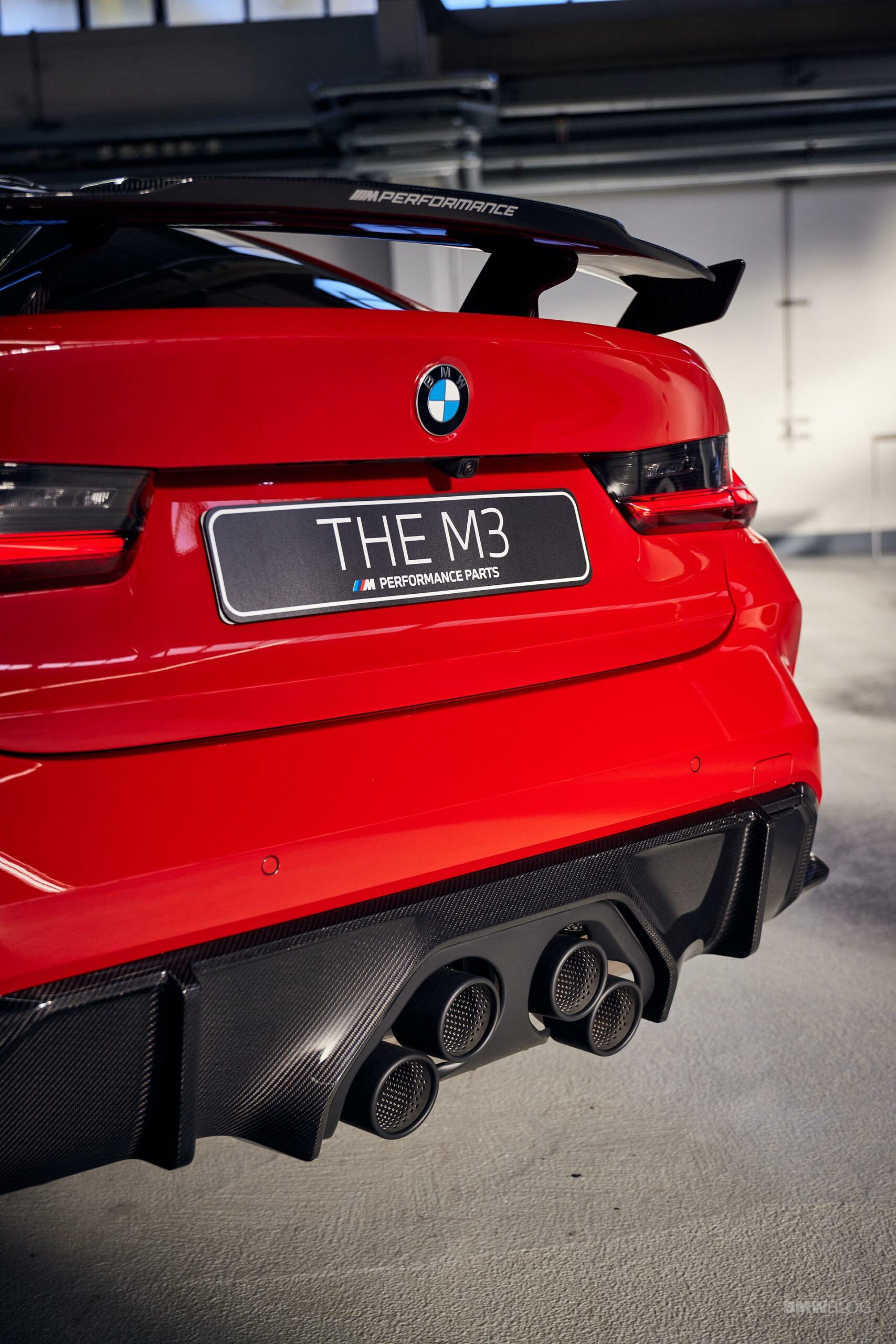 After featuring the new BMW M4 with M Performance Parts just yesterday, today we have another photo gallery. This time is the G80 M3 Sedan which is adorned with M Performance Parts. It also features the Toronto Red color. At the center of those new M Performance Parts is the exhaust system. For the first time, the aftermarket exhaust sports a triangular layout of its titanium pipes and is placed in the middle of the diffuser. The lightweight exhaust system has flap control and weighs around five kilograms less than standard exhaust. It also delivers a sportier sound (video here), thanks to the exhaust gas routing. In addition, the exhaust system is around seven kilograms lighter than the standard version.