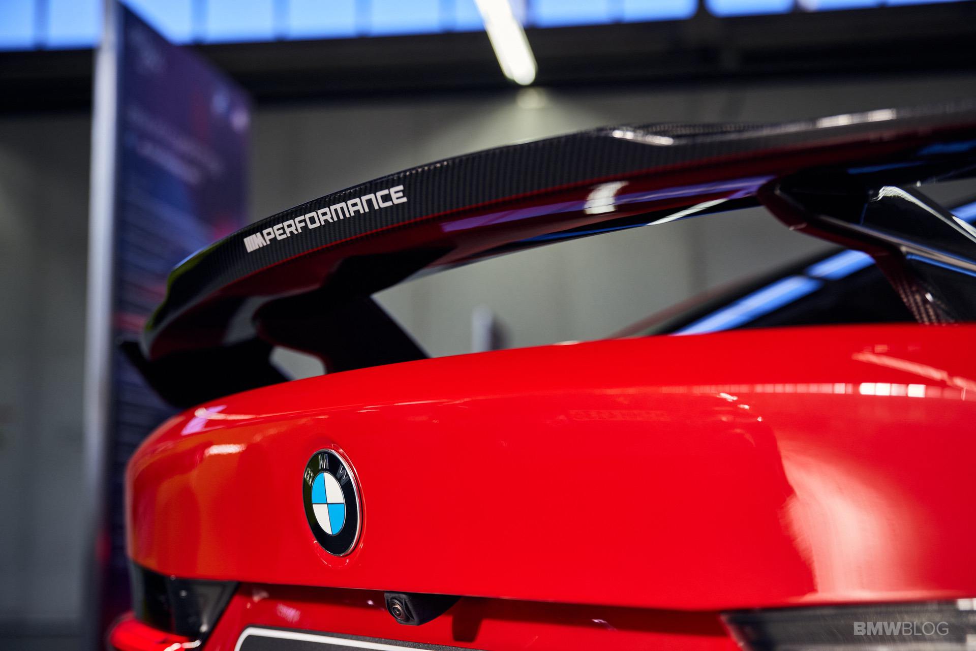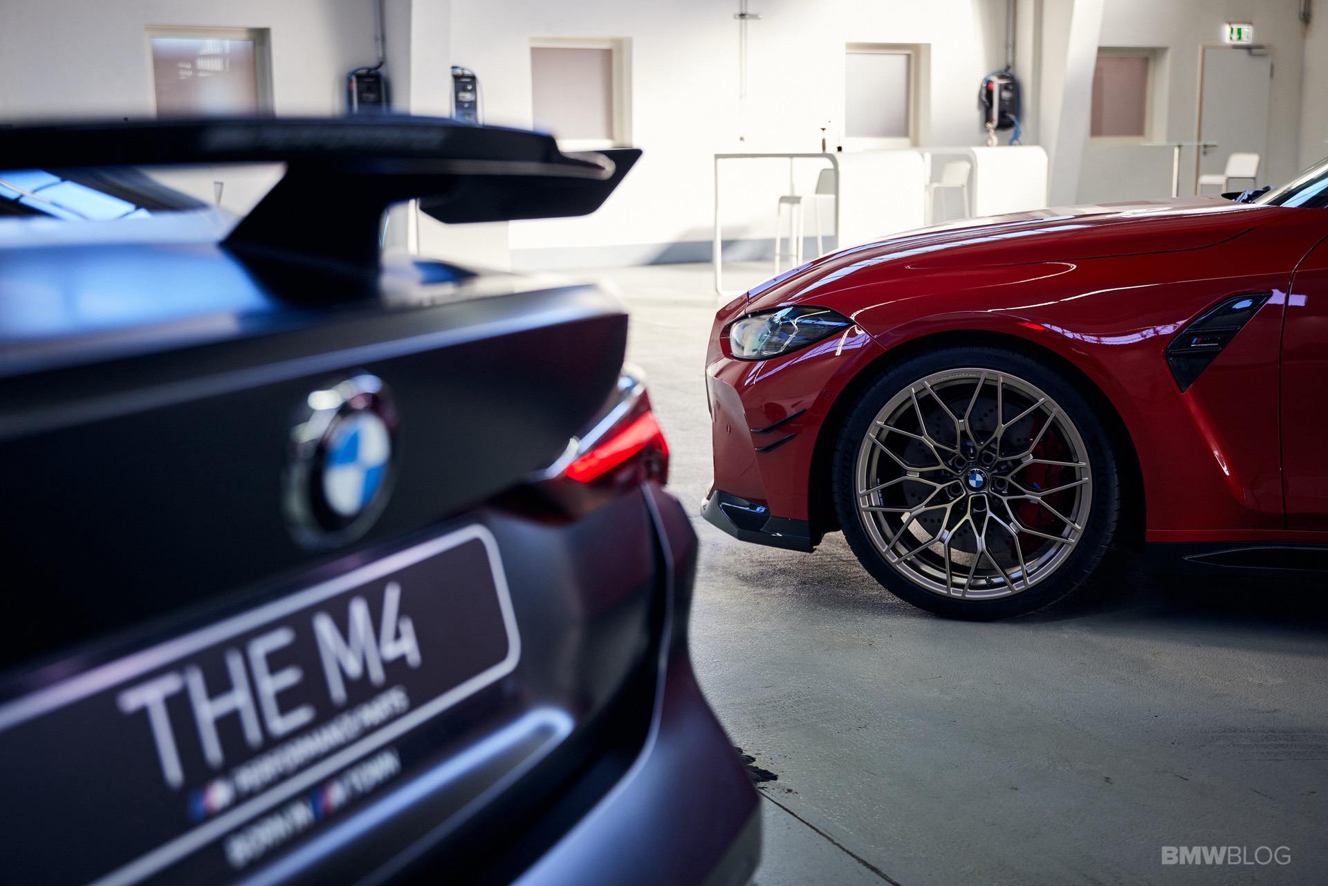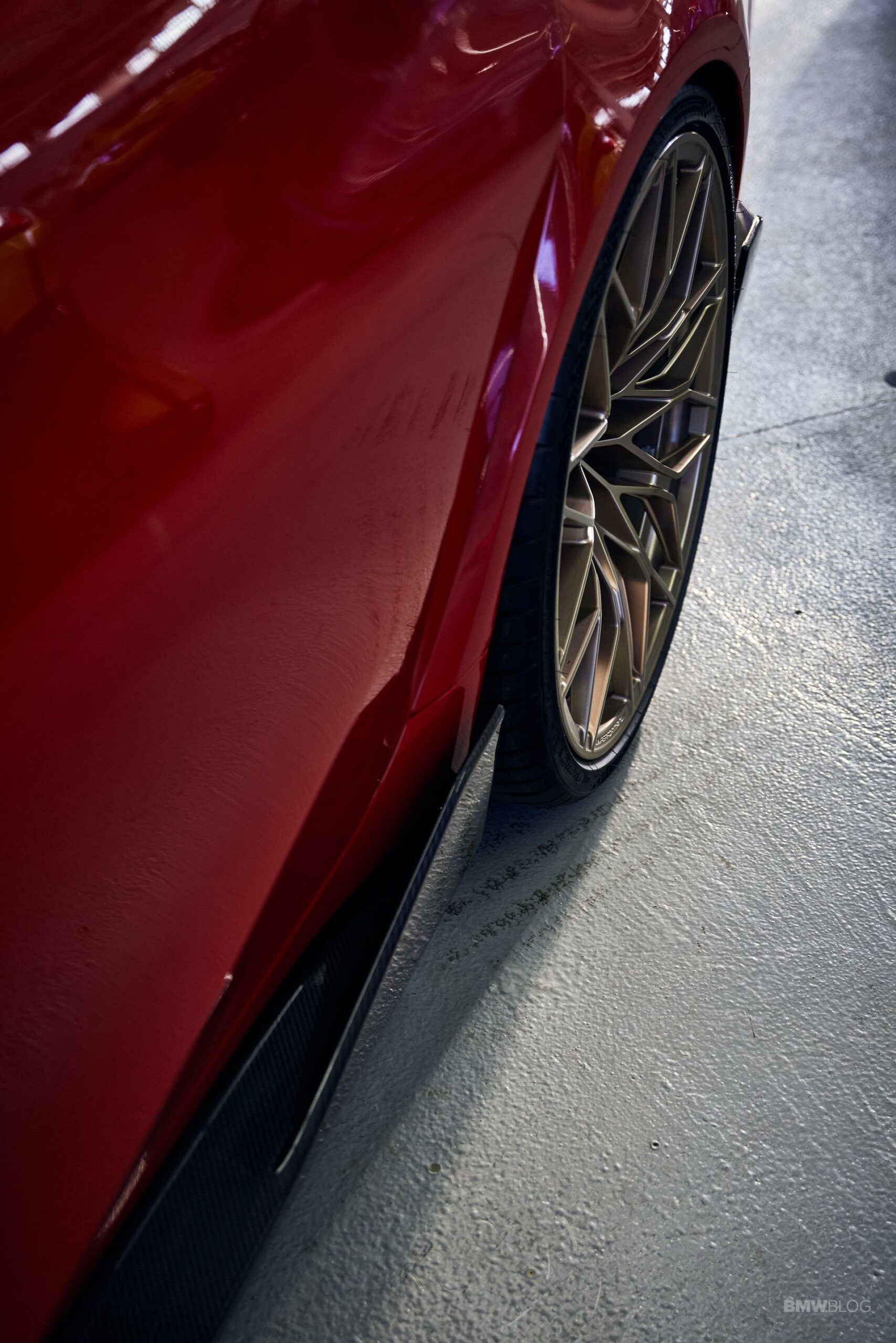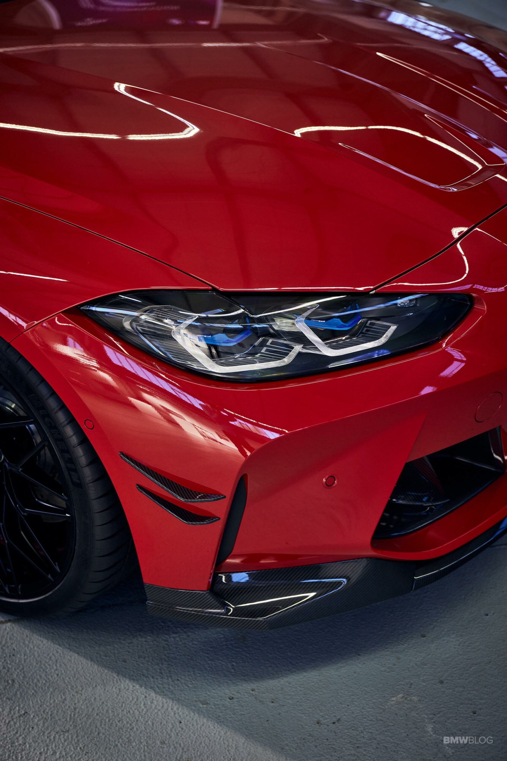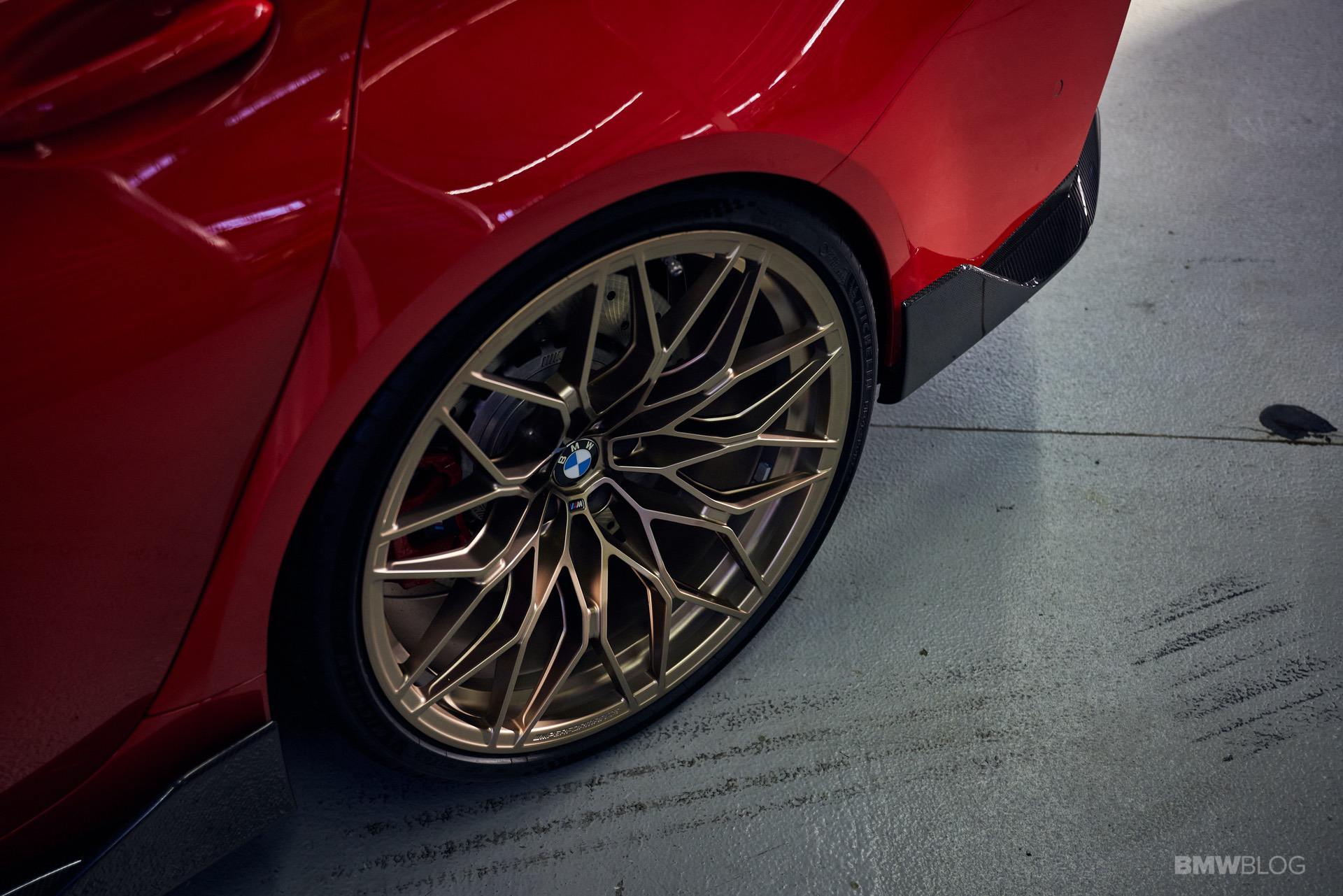 After featuring the new BMW M4 with M Performance Parts just yesterday, today we have another photo gallery. This time is the G80 M3 Sedan which is adorned with M Performance Parts. It also features the Toronto Red color. At the center of those new M Performance Parts is the exhaust system. For the first time, the aftermarket exhaust sports a triangular layout of its titanium pipes and is placed in the middle of the diffuser. The lightweight exhaust system has flap control and weighs around five kilograms less than standard exhaust. It also delivers a sportier sound (video here), thanks to the exhaust gas routing. In addition, the exhaust system is around seven kilograms lighter than the standard version.