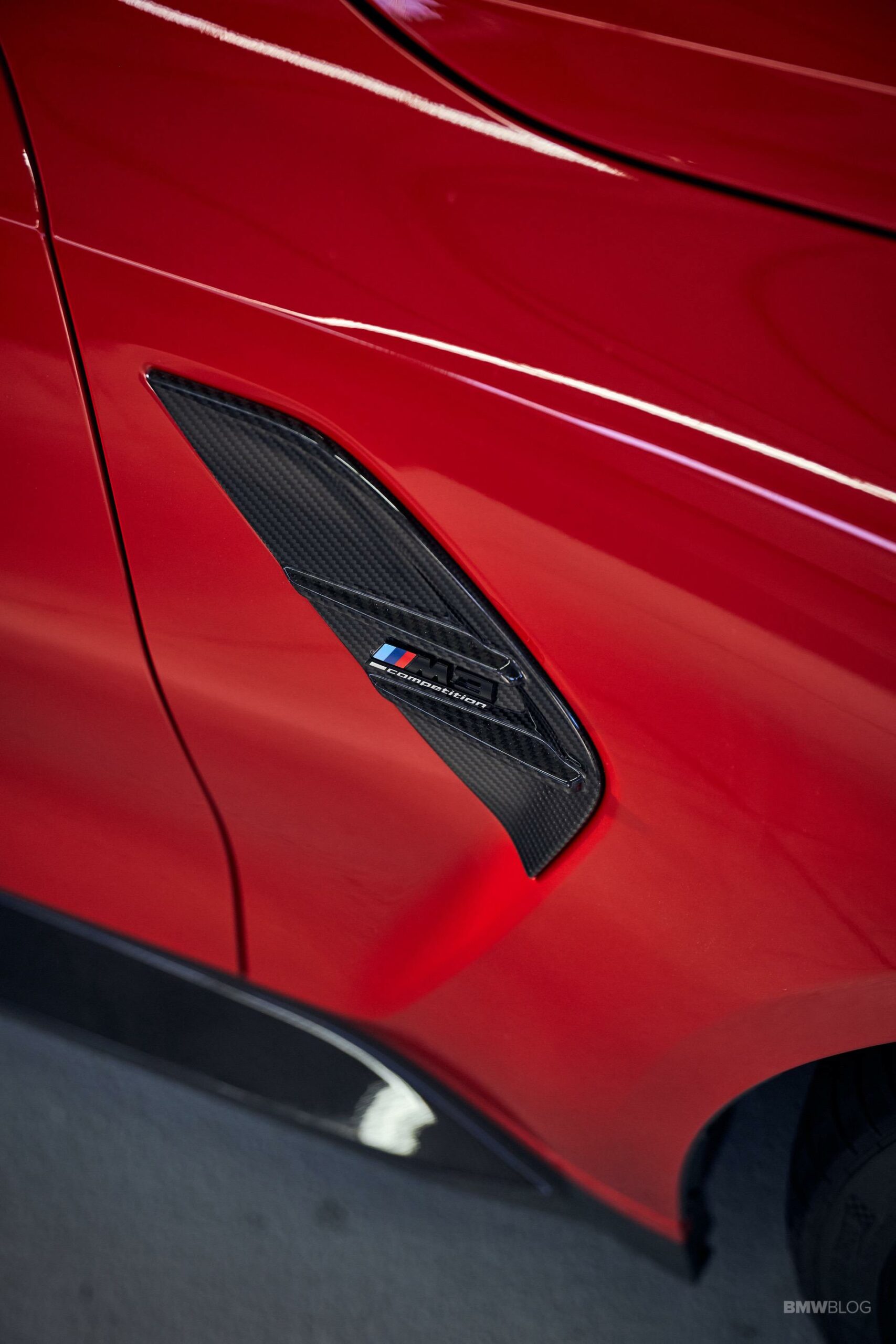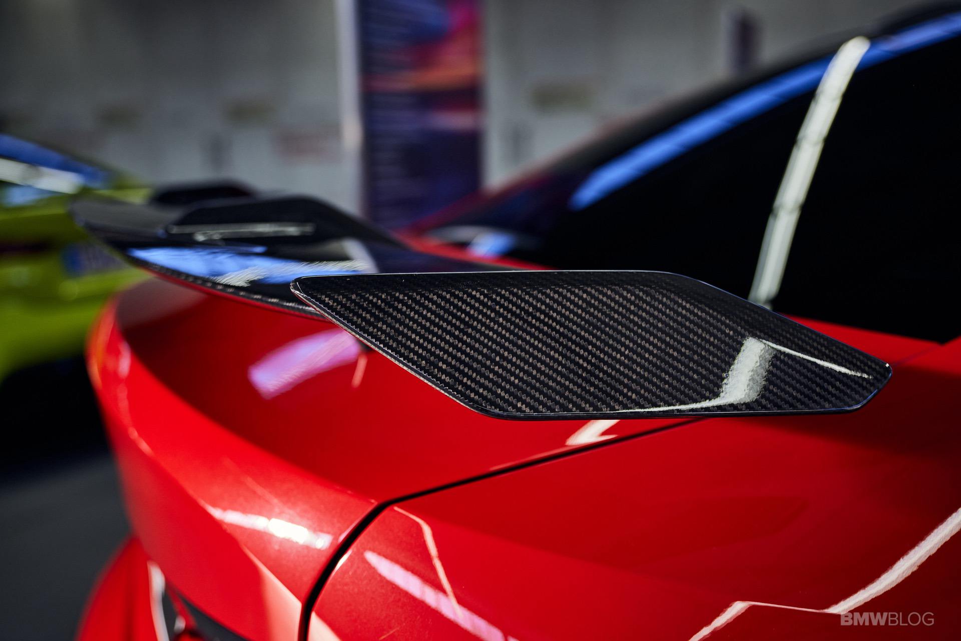 Next, we have the extensive offering of aero parts. It all starts at the front with the M Performance carbon front attachment, the M Performance carbon front splitter and the carbon M Performance Aero Flicks. Viewed from the side, you can immediately spot the M Performance carbon air breathers and M Performance carbon side skirt trims. At the rear, the M Performance carbon rear winglets and the distinctive M Performance carbon rear spoiler add the perfect finishing touches.