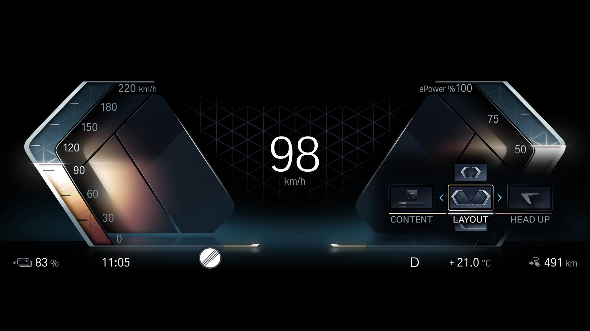 Lastly, the Gallery layout minimizes the gauges and allows for a much larger center screen, filled with either media information, navigation, or anything else the driver wants. All three layouts are distinguished with a different color pallete and graphics.
