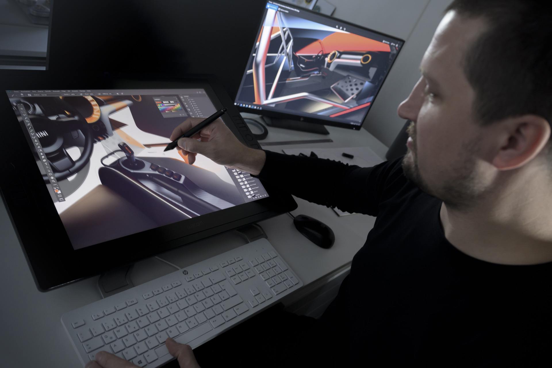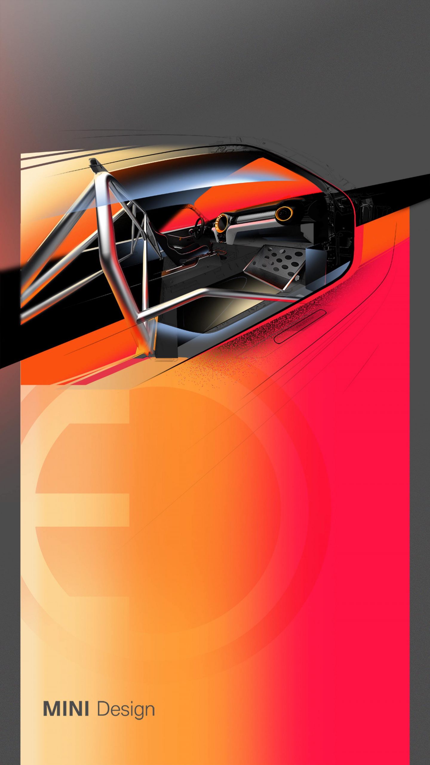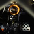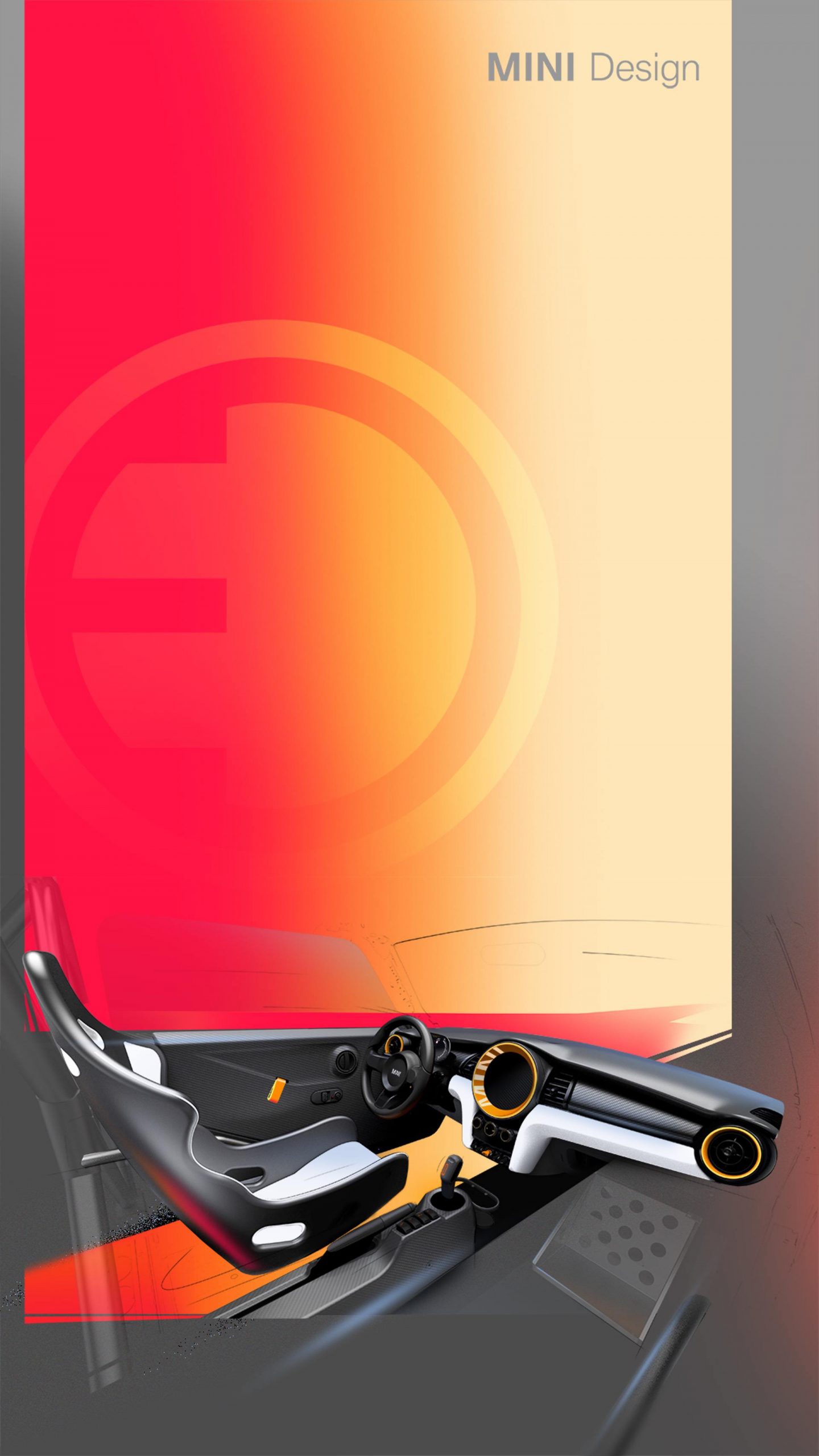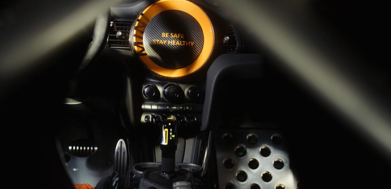 Things get even weirder inside, though. Everything seems to be exposed carbon fiber, including the steering wheel and center console. It ditches the typical infotainment system for a carbon fiber circle that reads “Be Safe, Stay Healthy”. There’s a roll cage in the rear, which is obviously function, rather than the red “brace” in the back of the MINI JCW GP, which is purely aesthetic. Like the JCW GP, though, the MINI Electric Pacesetter has no back seats. Naturally.
