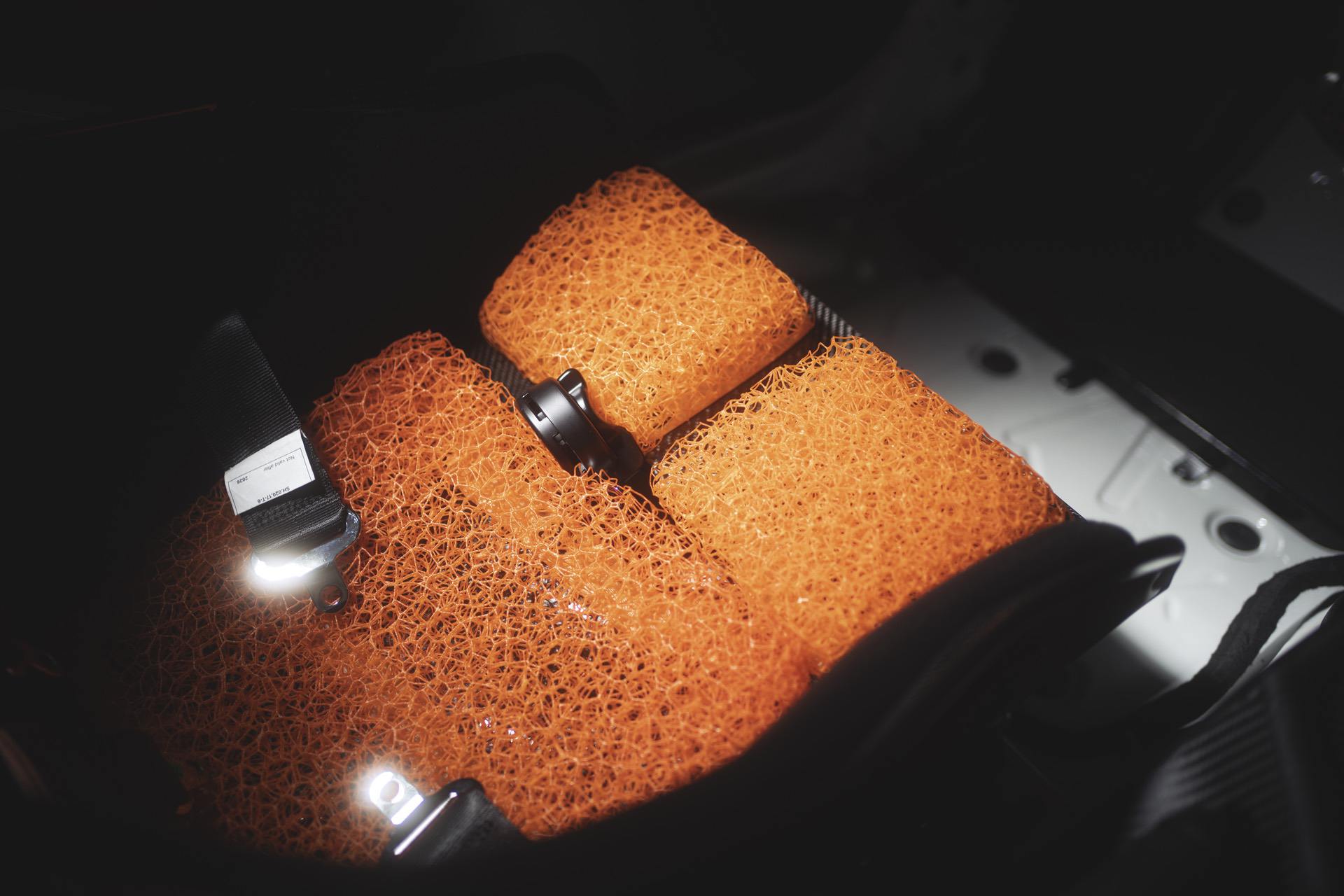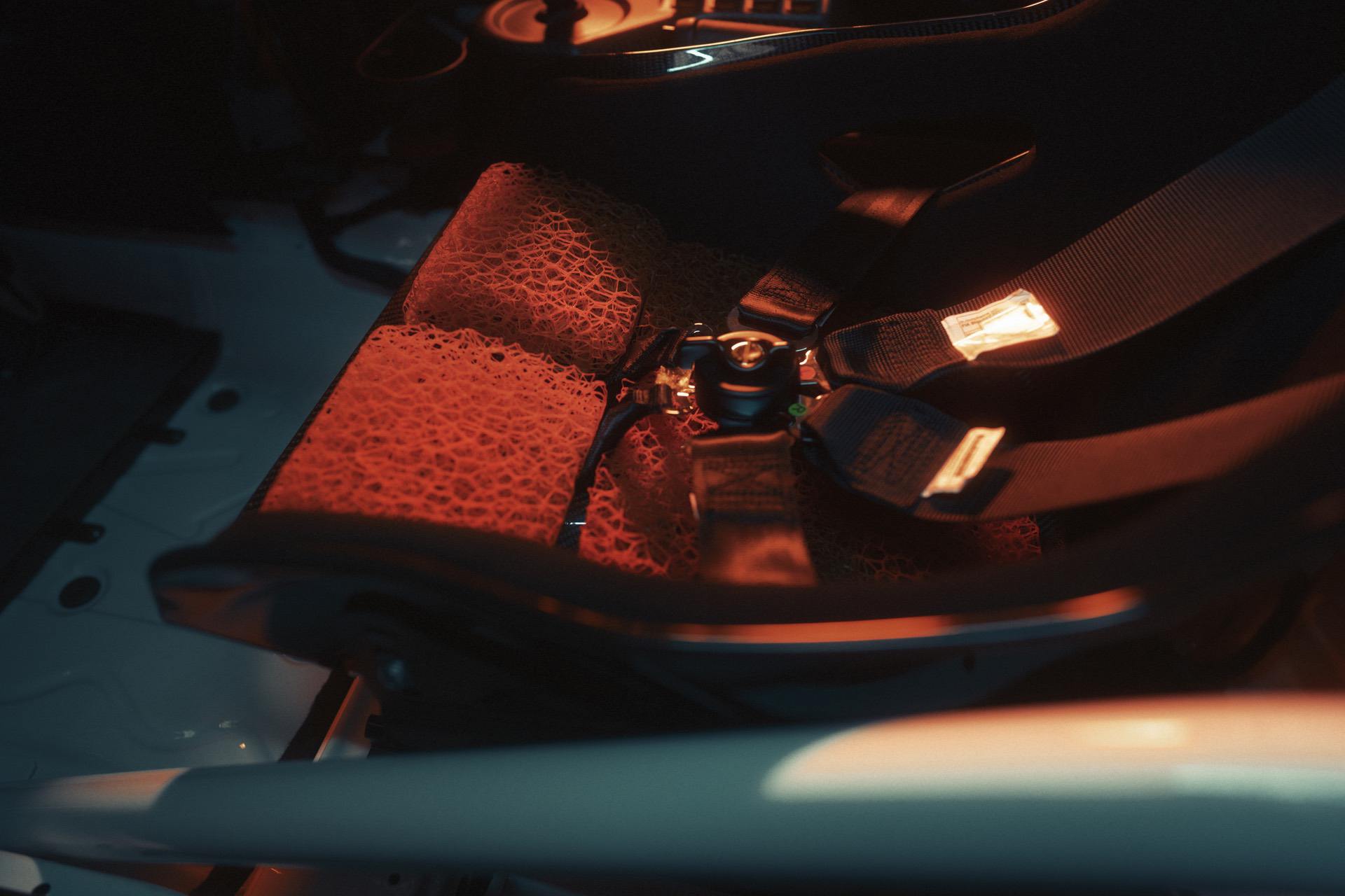 However, the most interesting aspect of the interior is its seat design. The racing buckets, complete with four-point harnesses, are also made from rigid carbon fiber but feature 3D-printed removable cushions, which has a semi-organic looking composition.