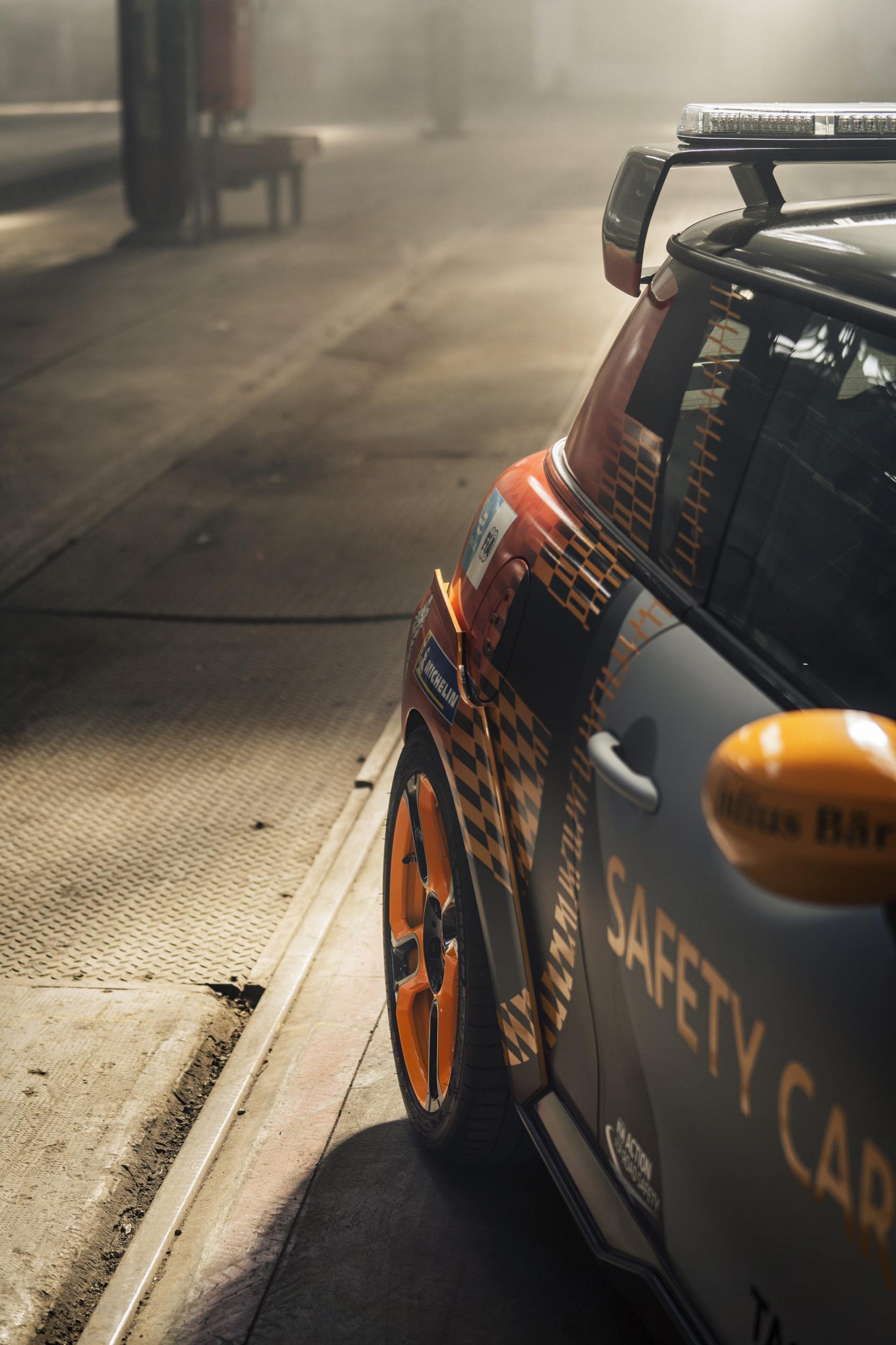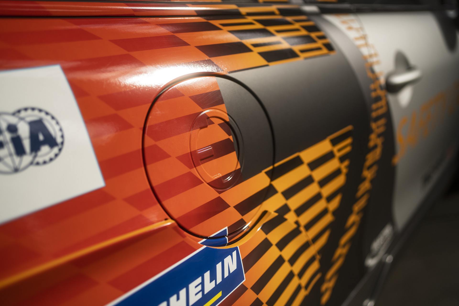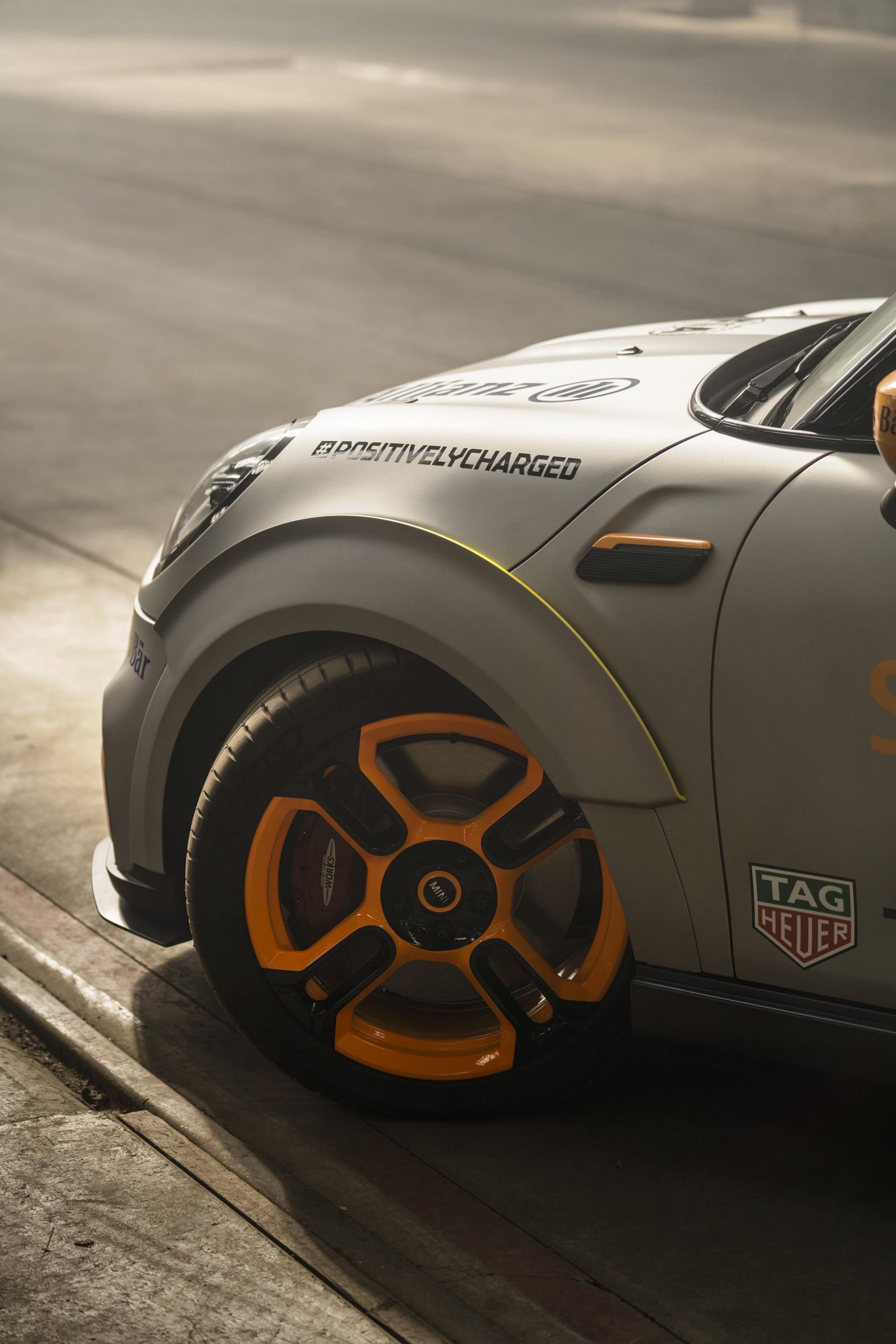 One look at the Pacesetter and it’s clear that the JCW GP was the basis for its styling. It gets similar fender blades, albeit painted rather than exposed carbon fiber, it has similar wheels, just in a different color scheme, and it has the same roof spoiler, only with a massive light bar on top. The Pacesetter wears a very cool electric-looking livery, with the MINI Electric plug logo on its roof, and the LED lights in the hood “scoop” are very slick. I actually think this looks cooler than the JCW GP.
