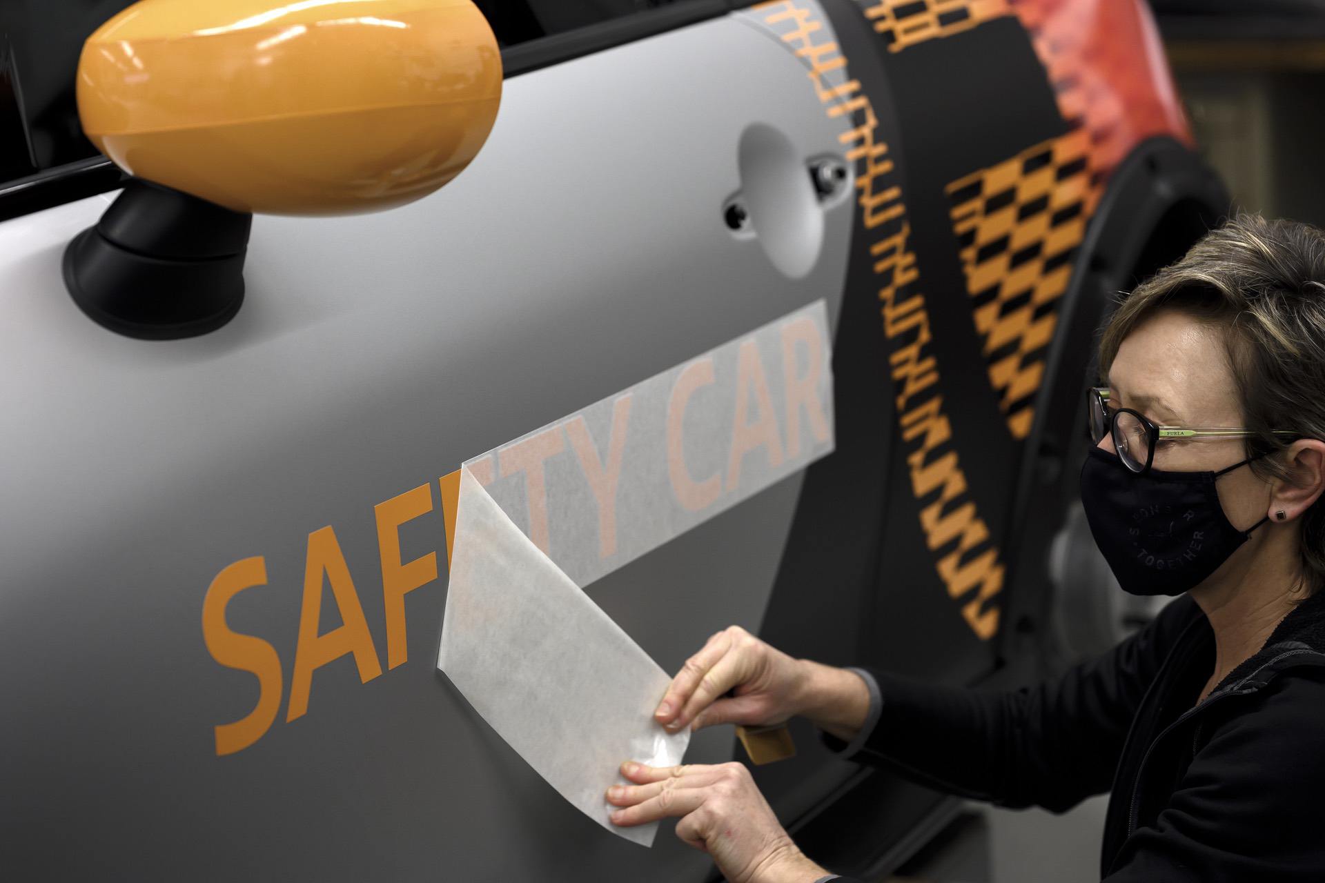 All of the aero on the exterior, including the fender blades and rear wing, is also made from 3D-printed, recycled carbon fiber, which not only makes them very light but also quite green. Which is fitting for an electric pace car.
