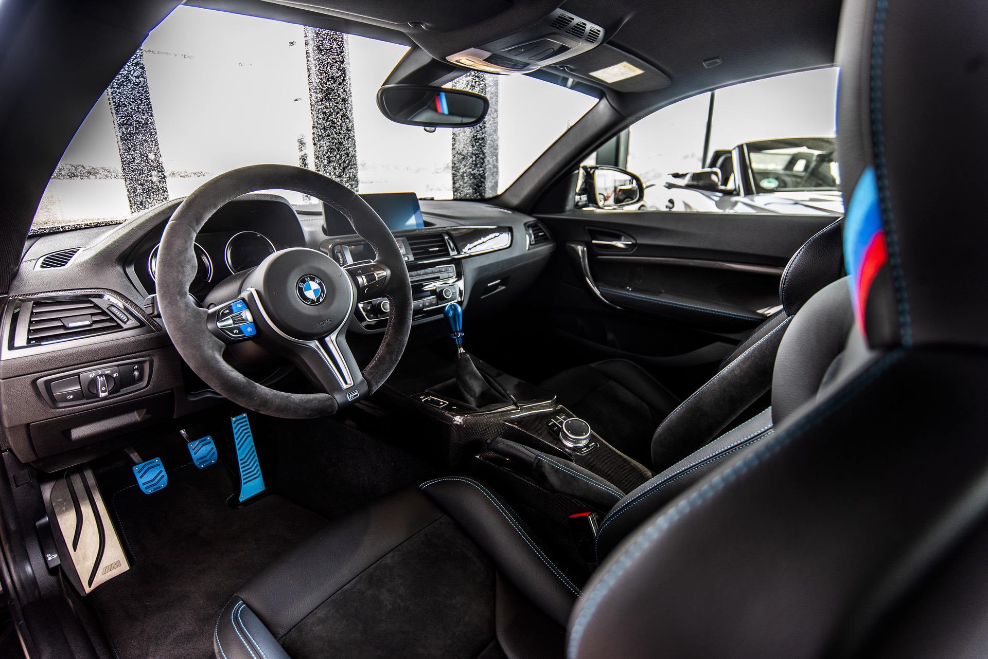 The Alcantara goes perfectly with the BMW M2 CS steering wheel that has been garnished with blue M1 and M2 buttons. So there is some color to the otherwise cool interior with a lot of carbon fiber (door panels, strips and a complete center console).