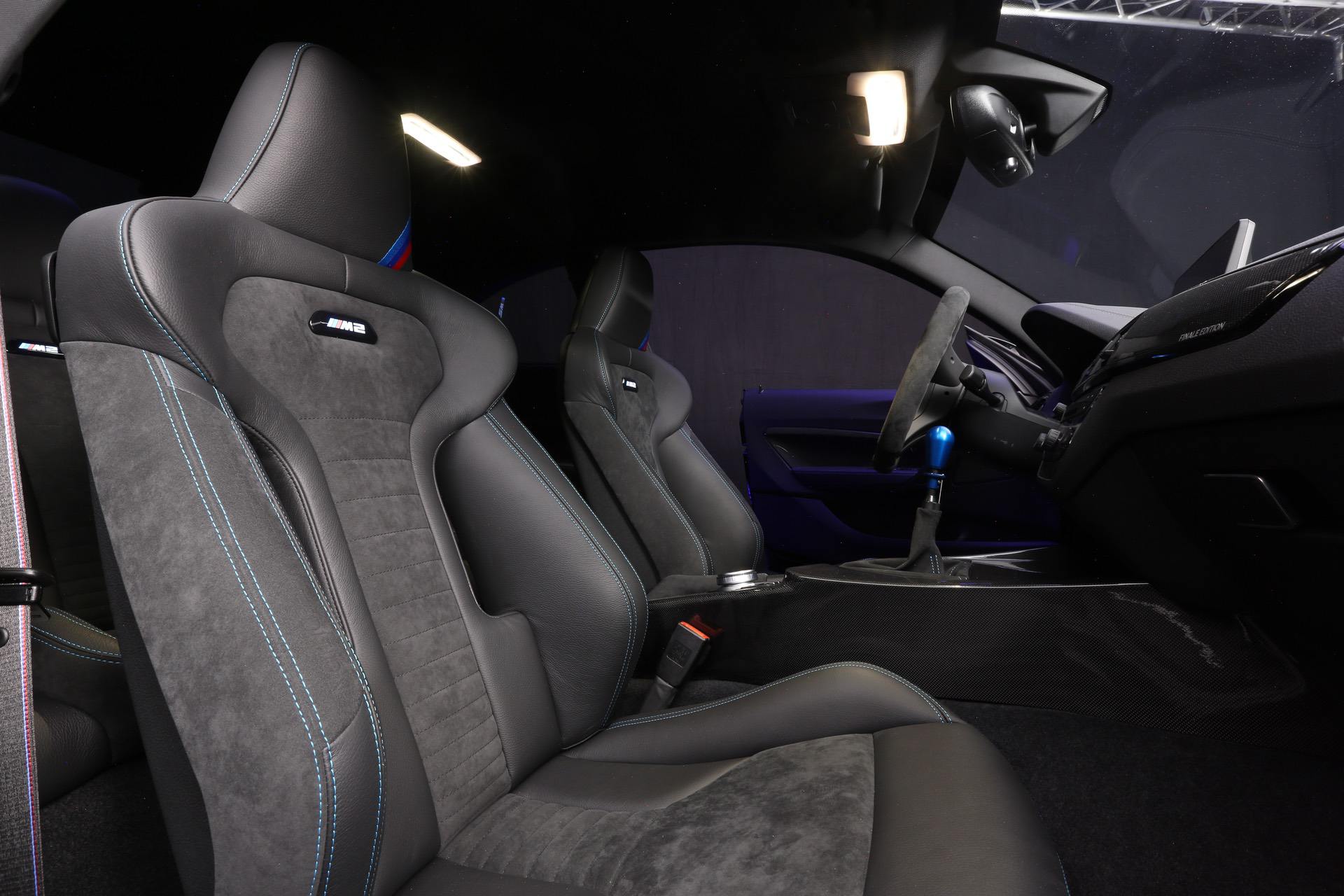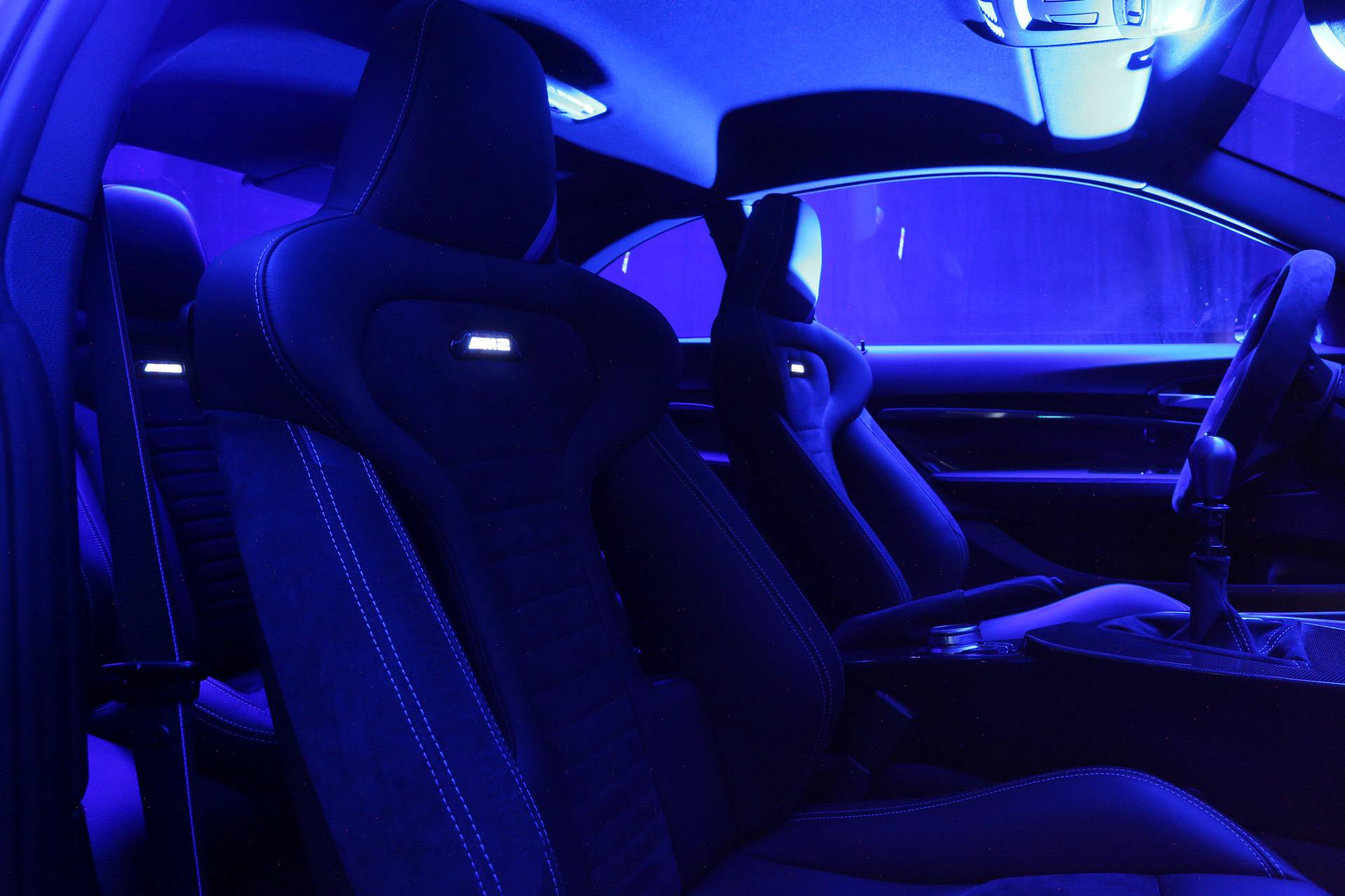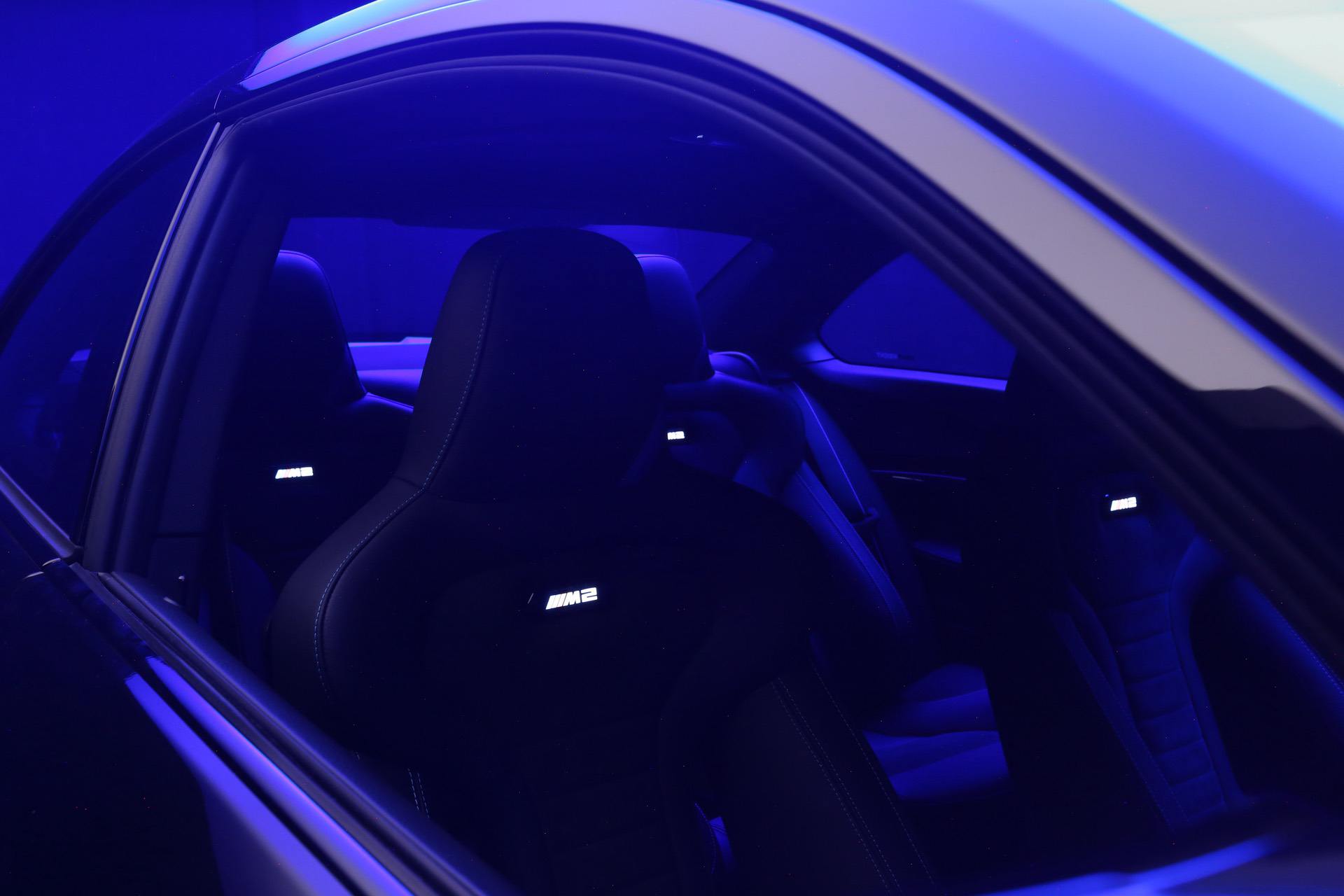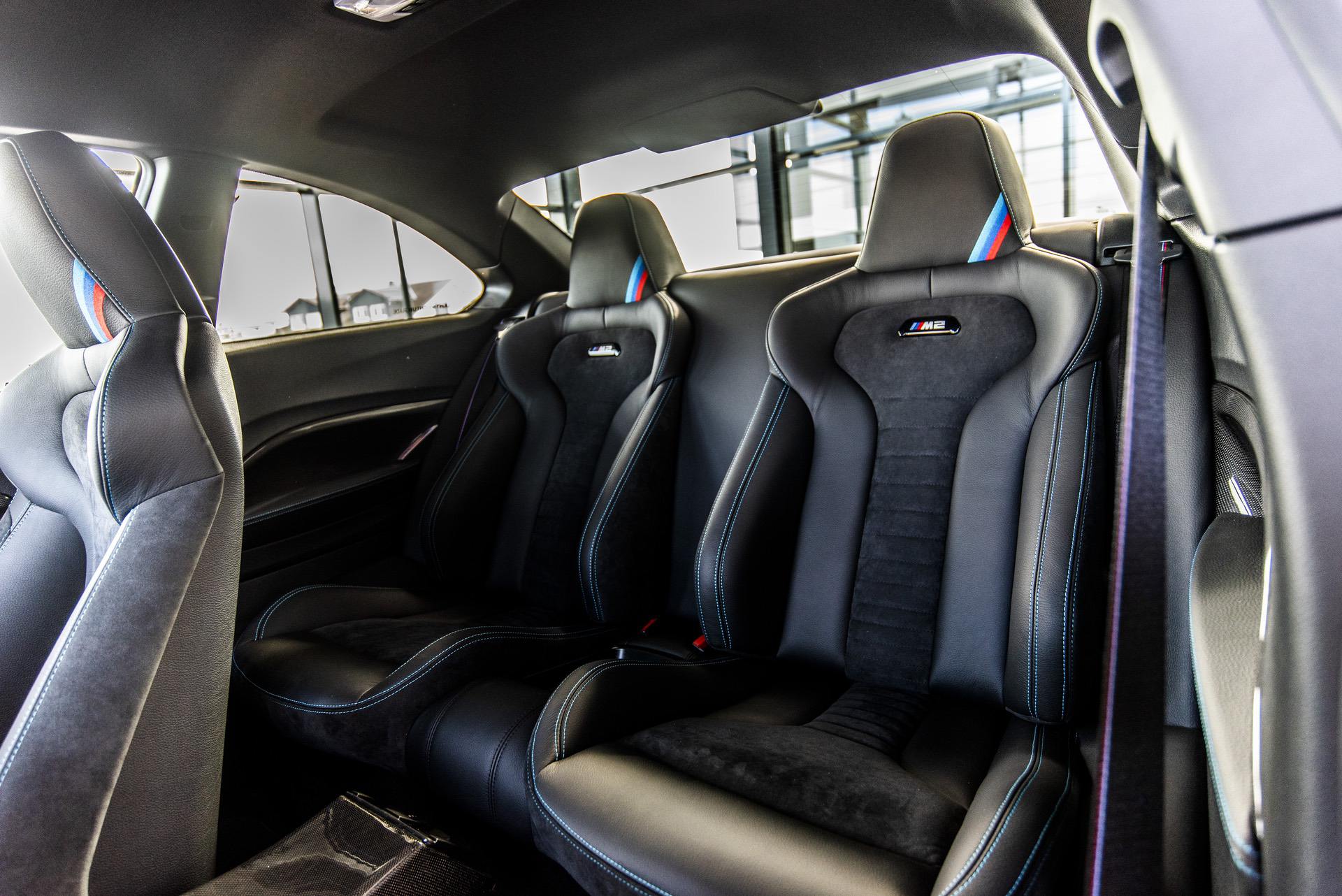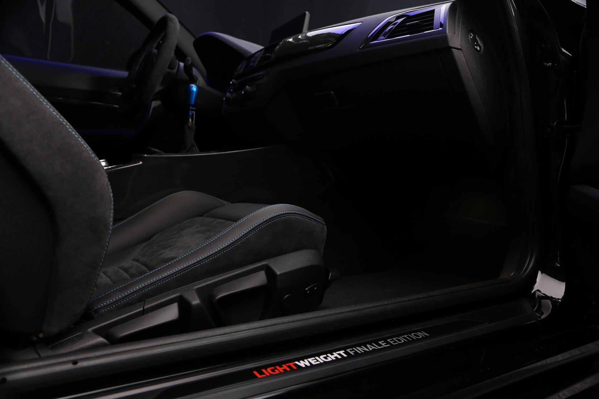 And there we are now with the interior. The Final Edition features four single seats based on BMW standard seats and consisting of CS components in the finest leather and Alcantara. The M2 logo lights up in all four seats and the seat heating also ensures a feeling of well-being in the rear.
