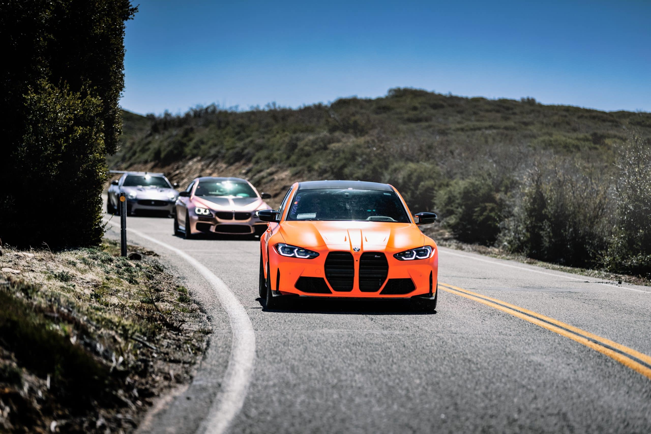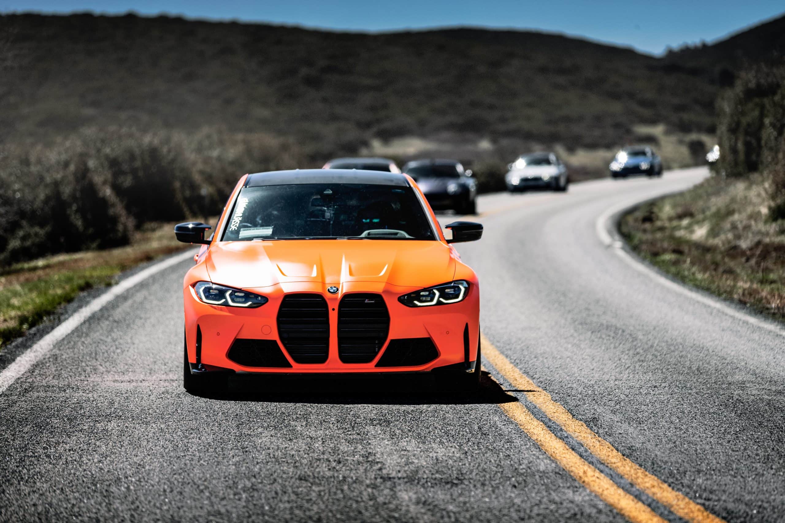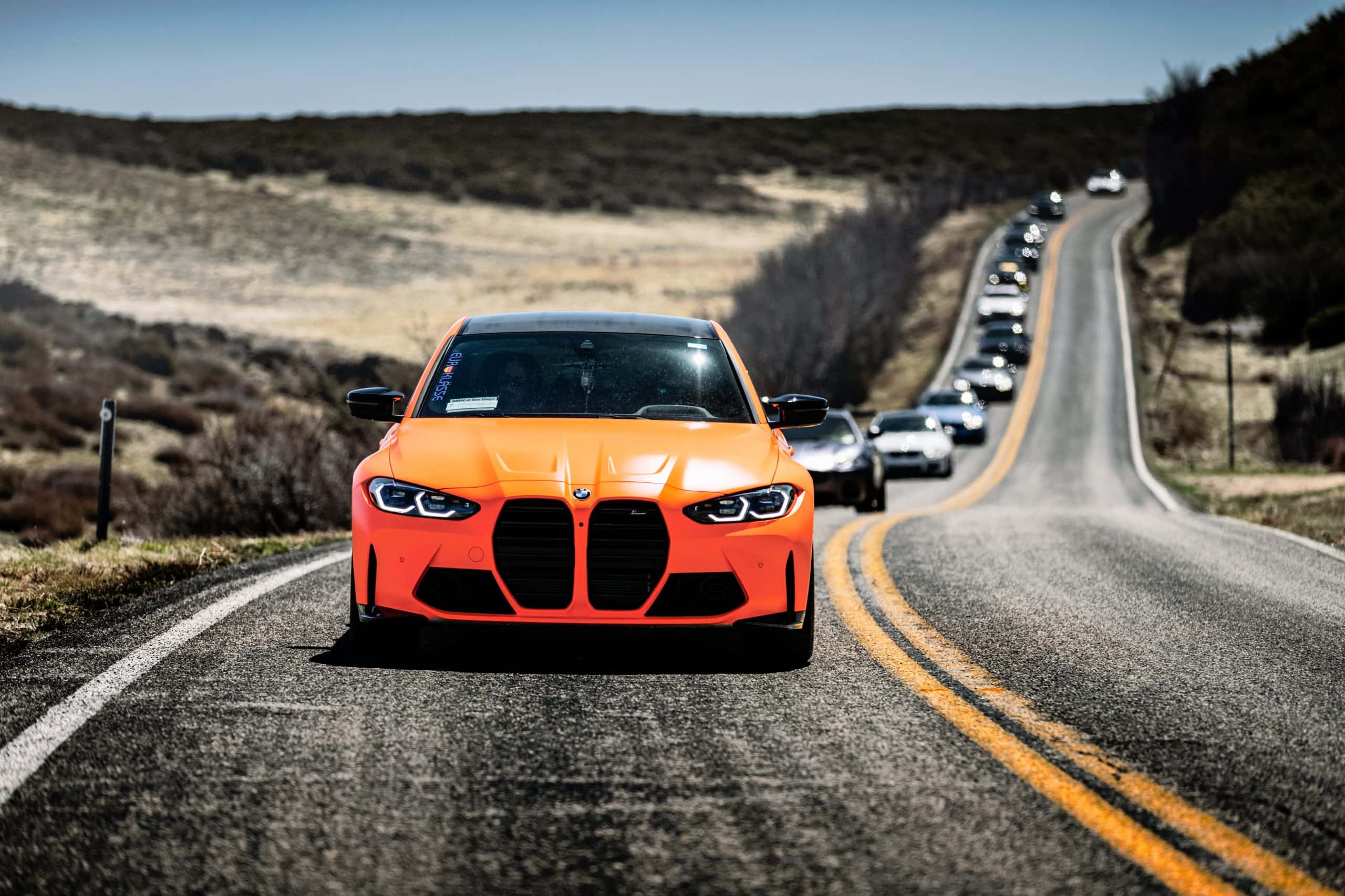 What’s funny about the M3 in these photos is that, despite its vibrant color, it’s not even the wildest looking Bimmer in the pack. There’s a wide-body BMW Z4, with enough aero to make it look like a GT3 racer, and a BMW M6 Gran Coupe with a sort of purplish wrap that has an almost mirror-like finish. While some other cars are seen in the pack of Bimmers, such as a Mclaren and a Jaguar XKR, it’s mostly wild looking BMWs and the bright orange G80 BMW M3 is among the most vibrant.