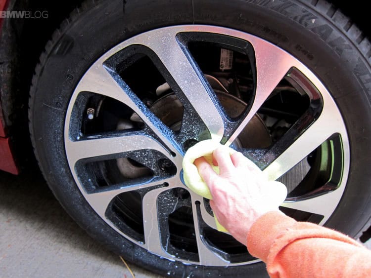 In order to get a really clean wheel, the best way is to take off the wheel first. A big caveat is that you apply a cleaner to a cooled off wheel. So you can forget using these stuff to get the brake dust of your M3 wheels when you come off a 25 minute hot lap session. Many companies recommend spraying a Wheel Cleaner directly on the wheel and letting sit for up to 5 minutes then you just rinse it off with water.