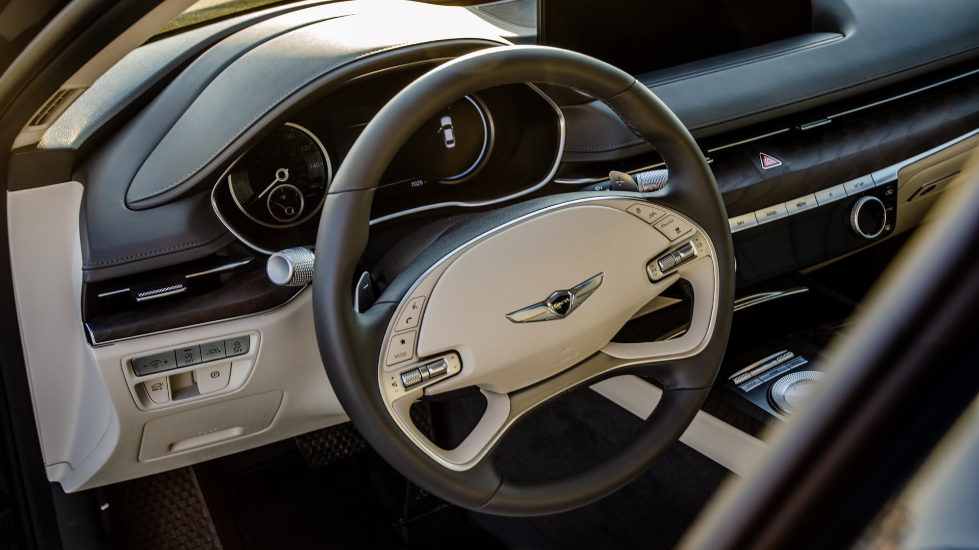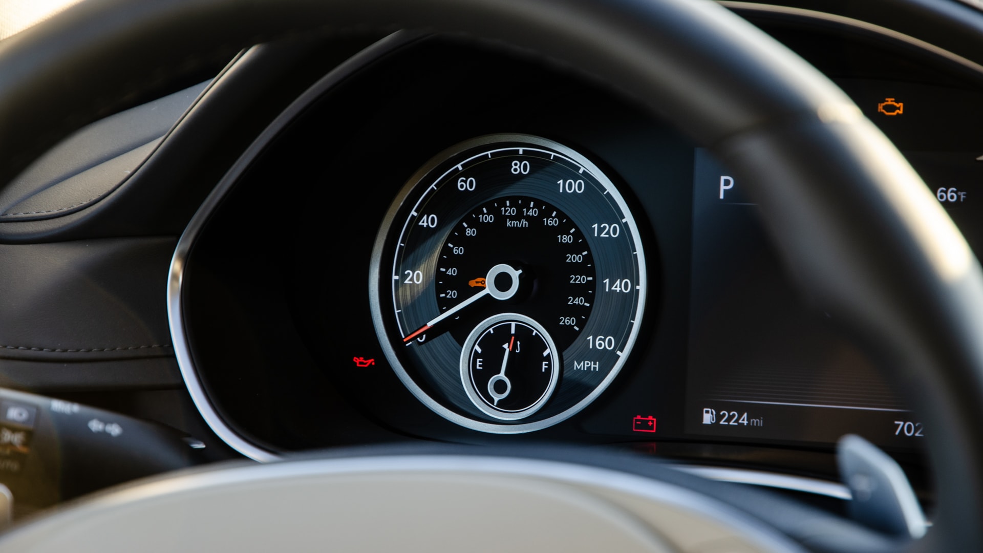 Though, there’s one small feature that made me forgive its frustrating infotainment — its speedometer. That might sound ridiculous but the speedo on the Genesis G80 is one of the prettiest I’ve ever seen on a car. Ever. It’s a gorgeous physical dial, trimmed in metal, with a metal needle, a black clock-face, and white numbers. It looks like it either belongs in a WWII fighter plane or a Swiss watch. It’s like jewelry, it’s so pretty. Shame, then, that Genesis decided to make the rev-counter a digital version of the same speedo dial, which looks lame and barely has any customizable info anyway, at least not any that couldn’t have been put in the central screen between both dials. It’s an odd aesthetic choice by Genesis and a disappointing one because if both dials were physical, they’d be better looking than any other on the market. Period.