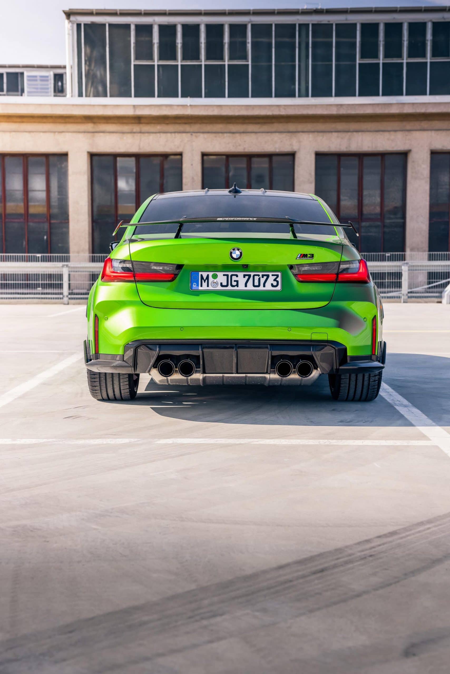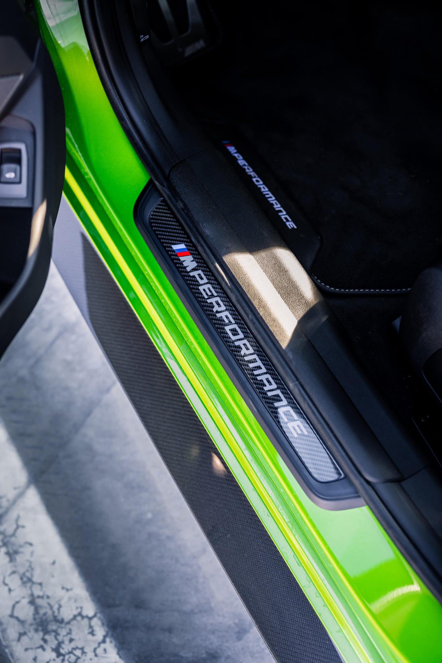 Next on the list of upgrades are a series of M Performance Parts. The list starts with a large fixed rear wing, new side skirts, a new lower front lip, a rear diffuser, and some canards on the front bumper. This G80 M3 in Java Green also wears BMW’s Style 963M wheels with a Gunmetal finish. Viewed from the side, you can also spot the M Performance carbon air breathers and M Performance carbon side skirt trims.