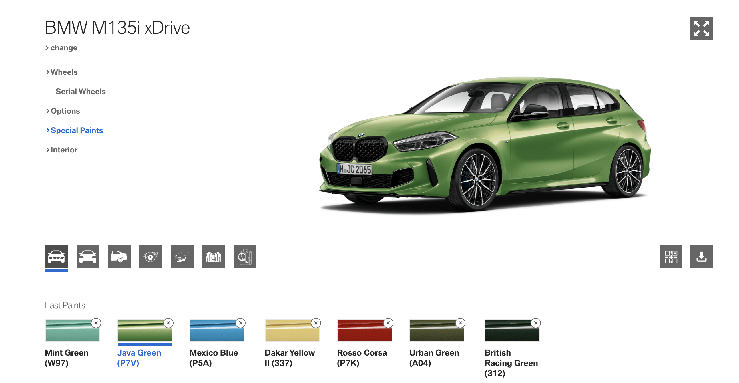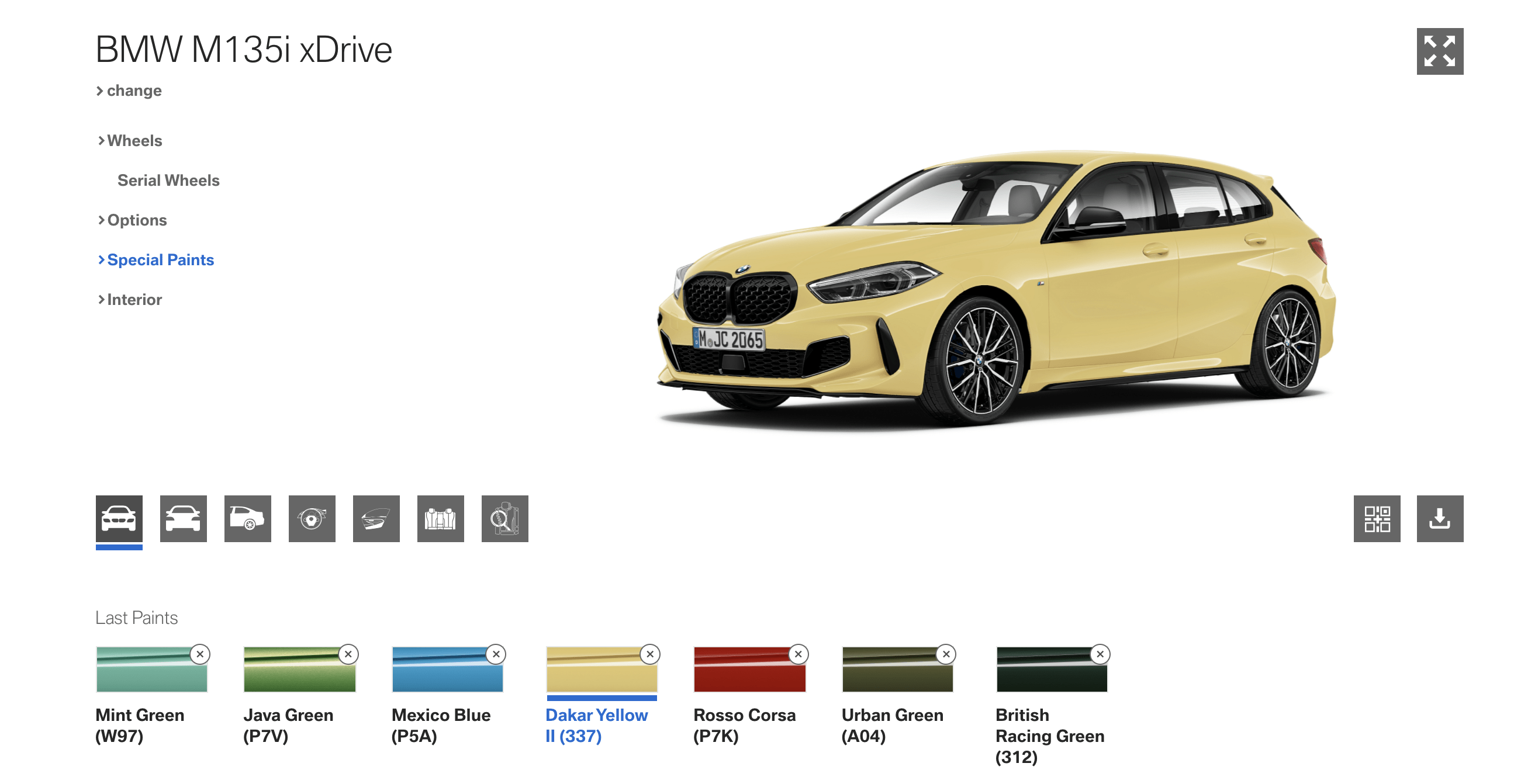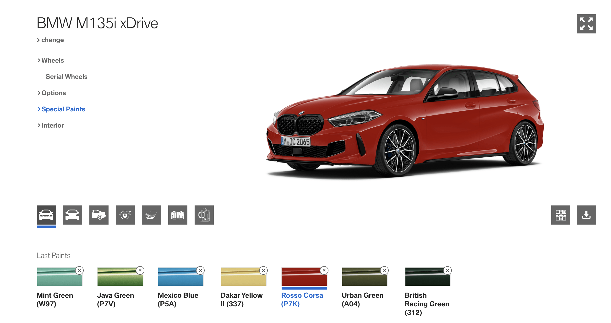 The online visualizer for the BMW 1 Series shows that the individual program applies to the all the 1 Series model lines: Advantage, M Sport and, of course, the hot hatch BMW M135i xDrive.