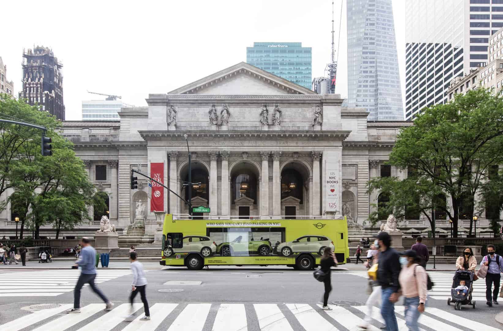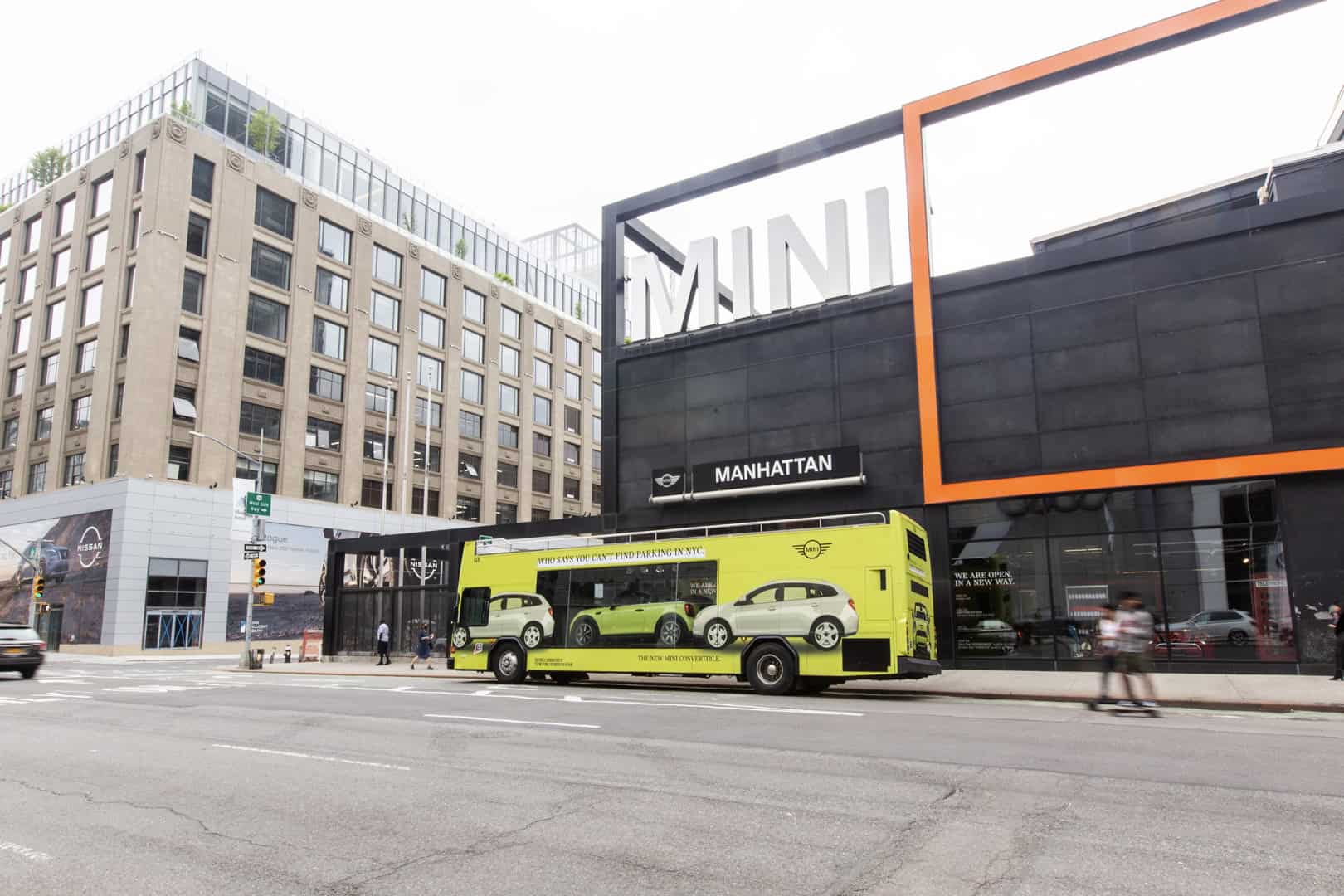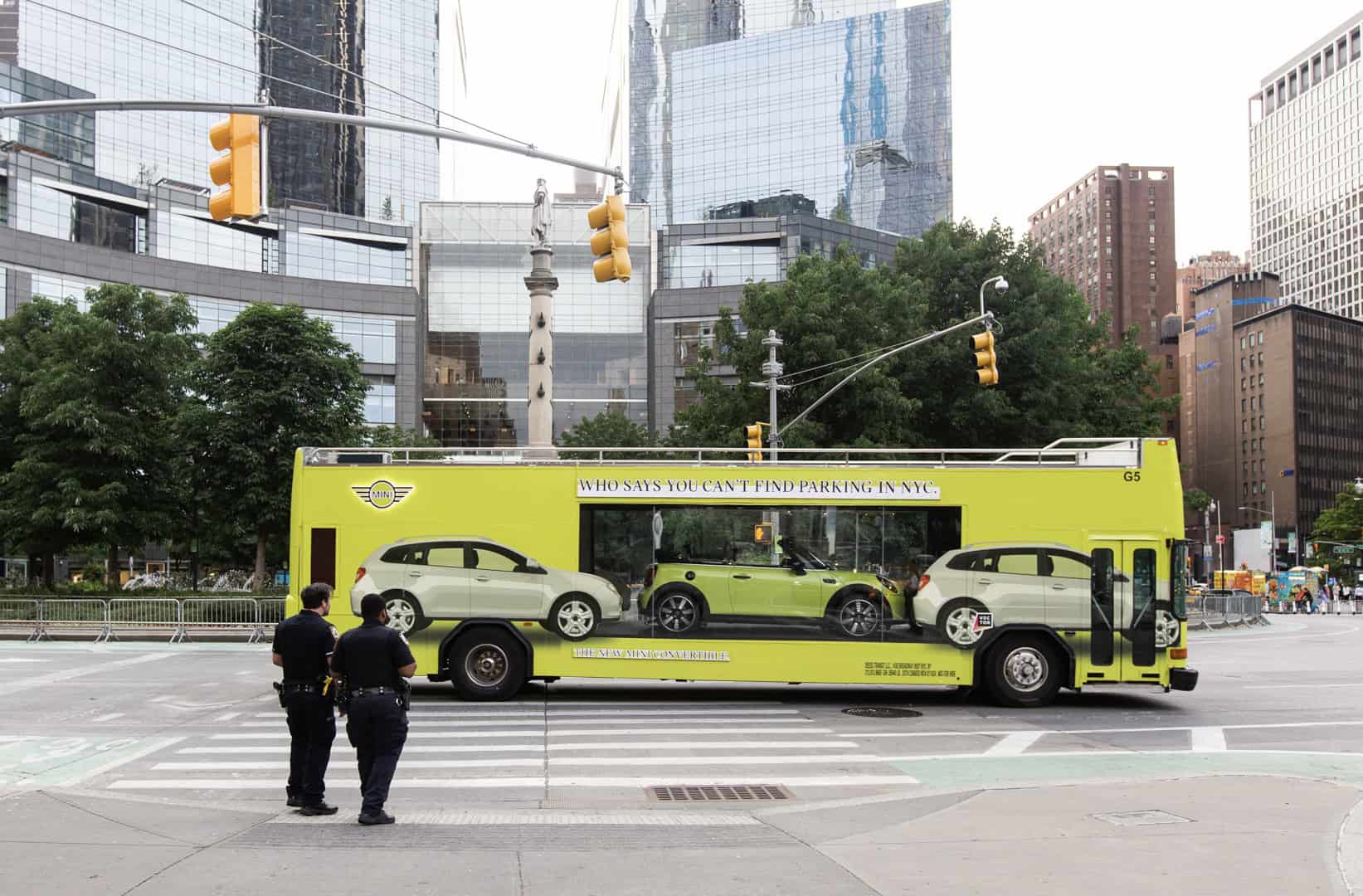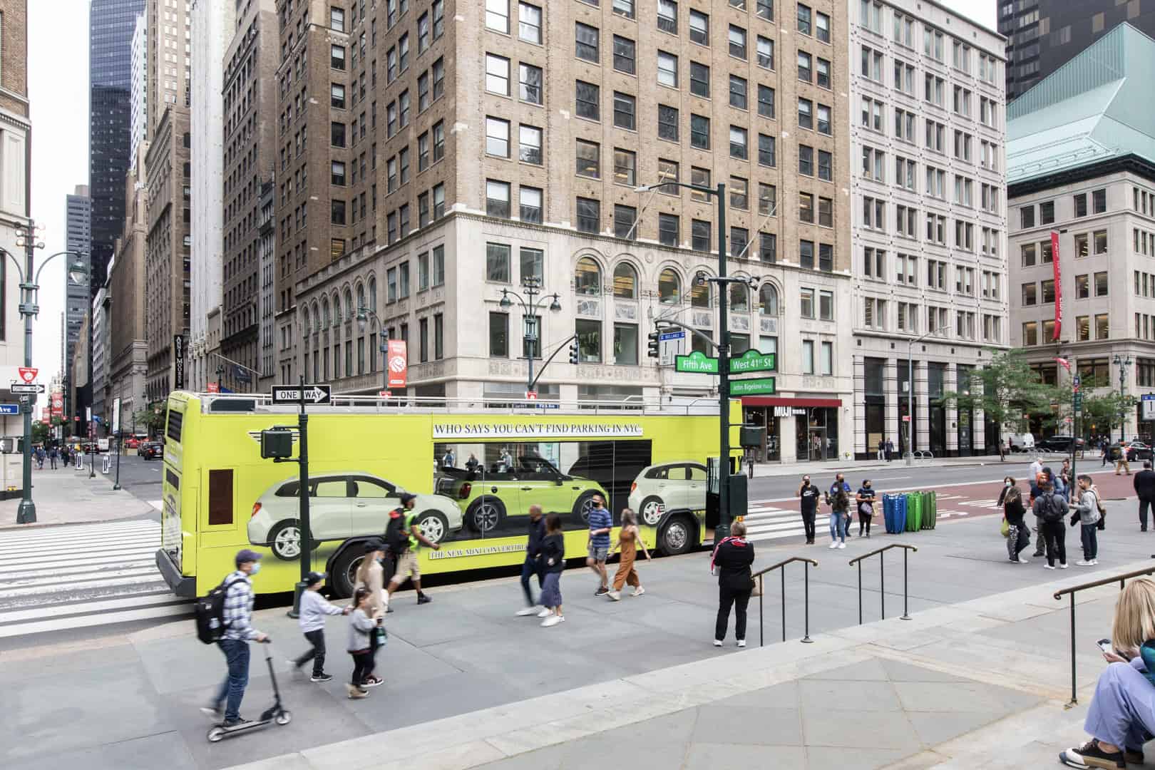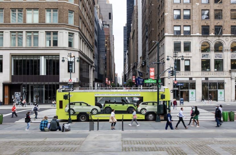 MINI is also trying to show New Yorkers how easy it is to park its cars in the famously overcrowded city. To do so, MINI is using what it calls a “Looking Glass Bus”, which is a double-decker bus painted in Zesty Yellow. In the bus, you can see a 2022 MINI Cooper Convertible, also painted in Zesty Yellow, through a glass window, sitting in between two SUVs. The side of the bus reads “Who says you can’t find parking in NYC.”