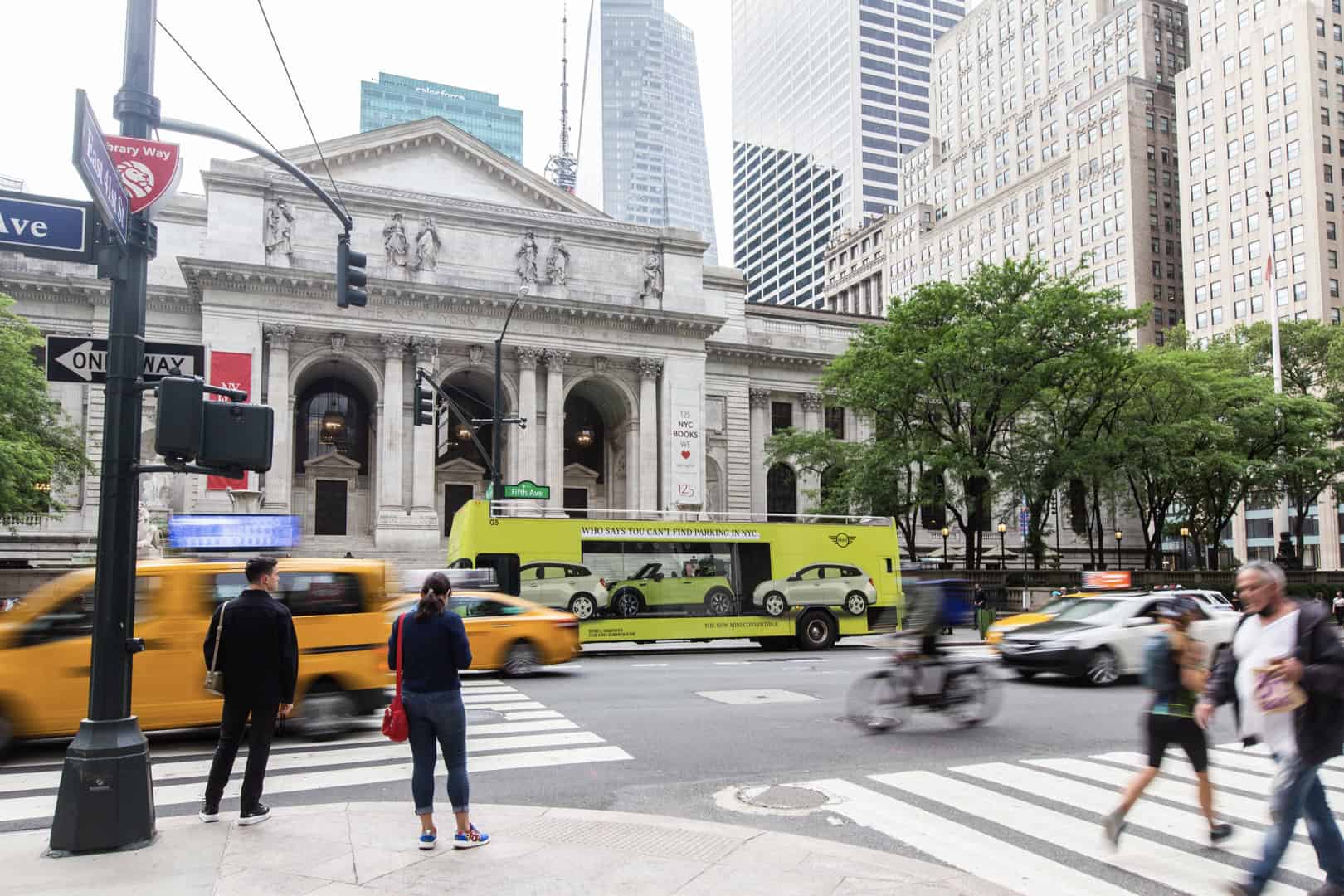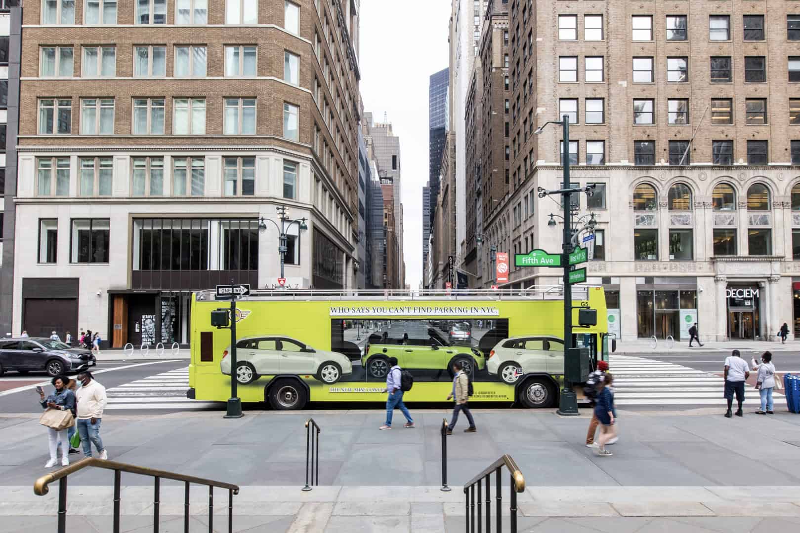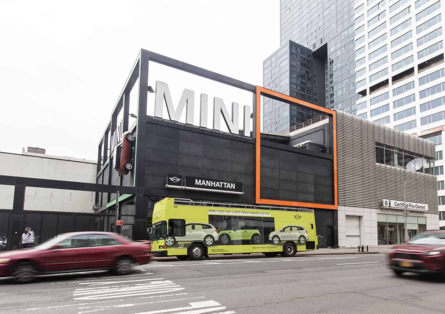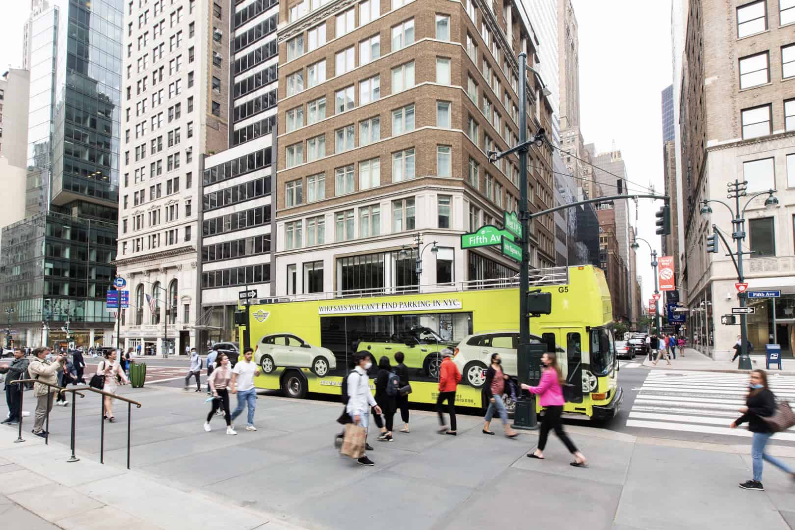 MINI is also trying to show New Yorkers how easy it is to park its cars in the famously overcrowded city. To do so, MINI is using what it calls a “Looking Glass Bus”, which is a double-decker bus painted in Zesty Yellow. In the bus, you can see a 2022 MINI Cooper Convertible, also painted in Zesty Yellow, through a glass window, sitting in between two SUVs. The side of the bus reads “Who says you can’t find parking in NYC.”