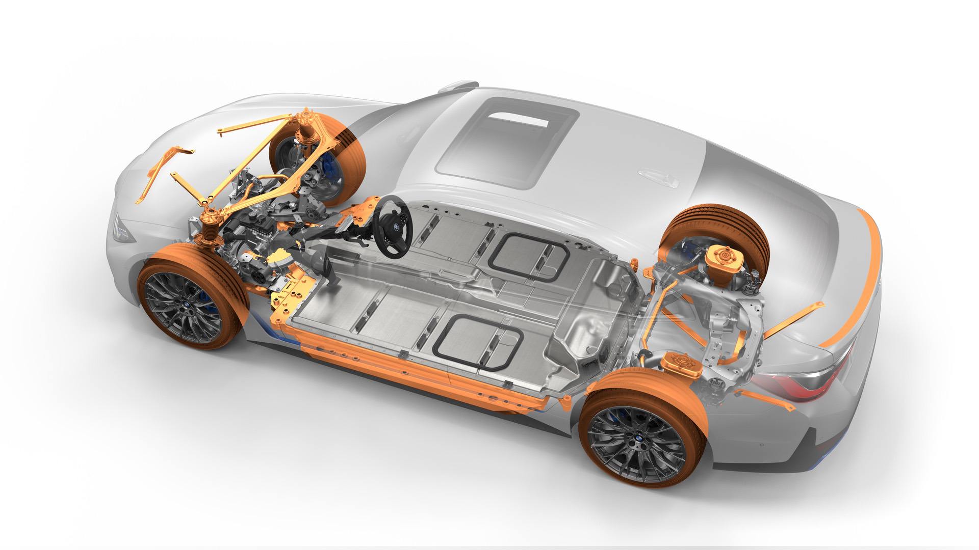 The BMW i4 is equipped with standard lift-related shock system that generates linear damper force according to the changing spring travel, resulting in improved damping response. Extra hydraulic damping on rebound at both the front and rear axle prevents excessive body dive when driving over large bumps.