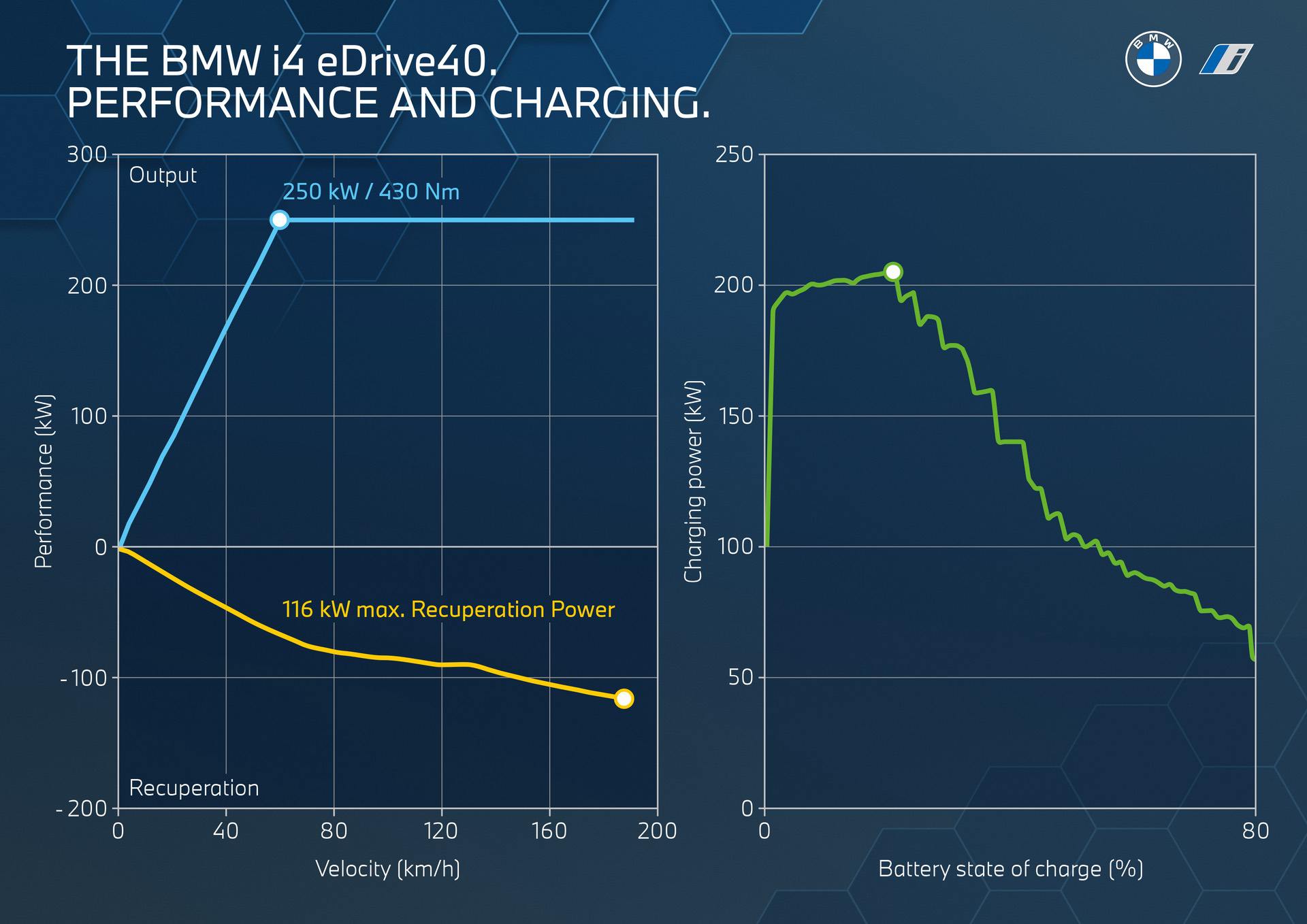 Speaking of energy savings and recuperation, the BMW i4 is the fastest charging Bimmer yet, along with its new BMW iX sibling. The i4 can charge at up to 200 kW, with a compatible DC fast charger. At that speed, the BMW i4 40 can recharge 102 miles of range in just ten minutes, while the i4 M50 only gets 87 miles of range in the same time. It can also charge at 11 kW from a Level 2 home charger, which will take eight hours to fully charge the battery. Though, that’s perfect for an overnight fill up.