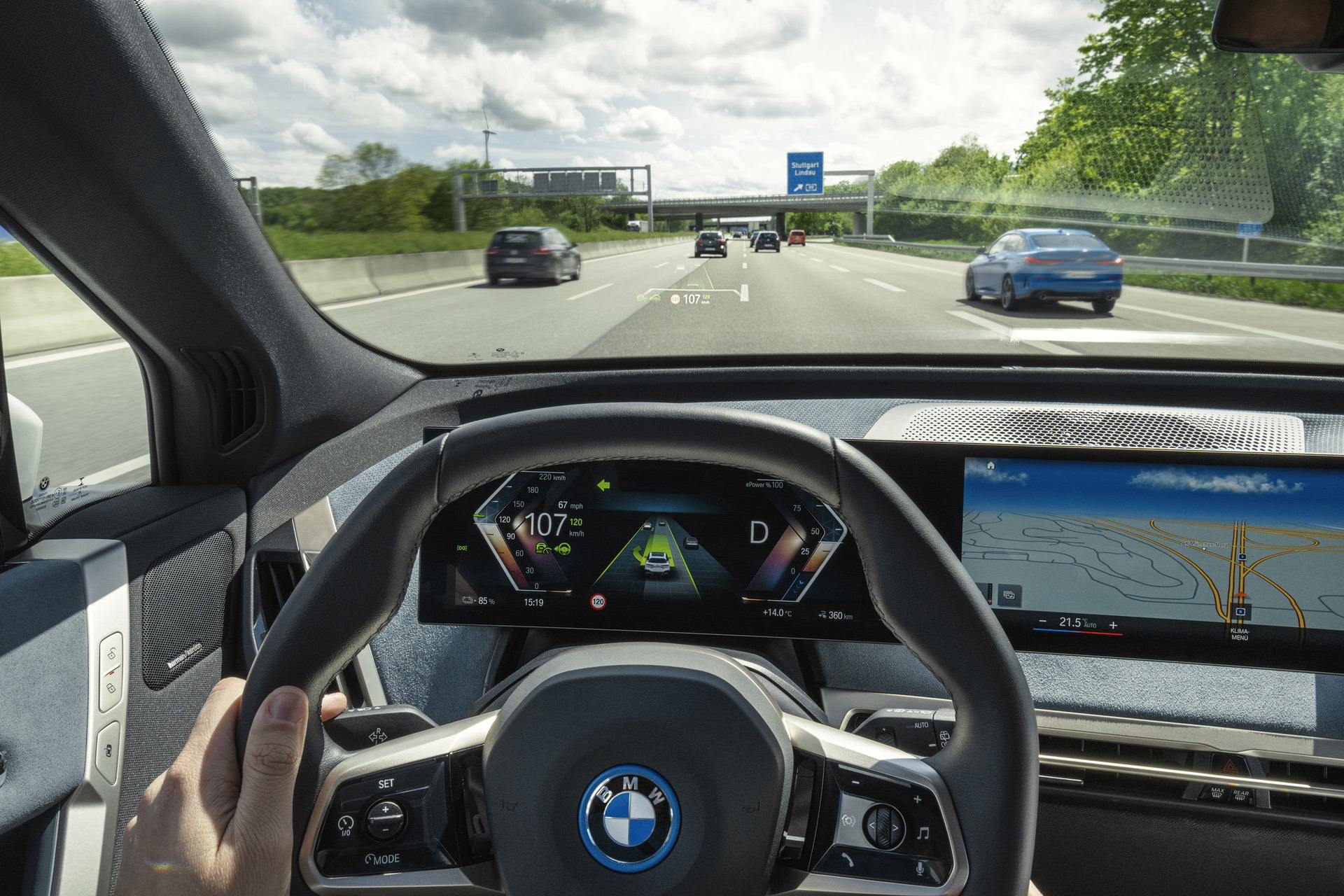 The BMW iX also gets augmented reality navigation in the driver’s display. A live feed of the road ahead is projected onto the display, with digital graphic overlays added to it, to help the driver navigate tricky areas. For instance, an arrow will be displayed on the screen, over the live feed of the road ahead, to show the driver which way to go.
