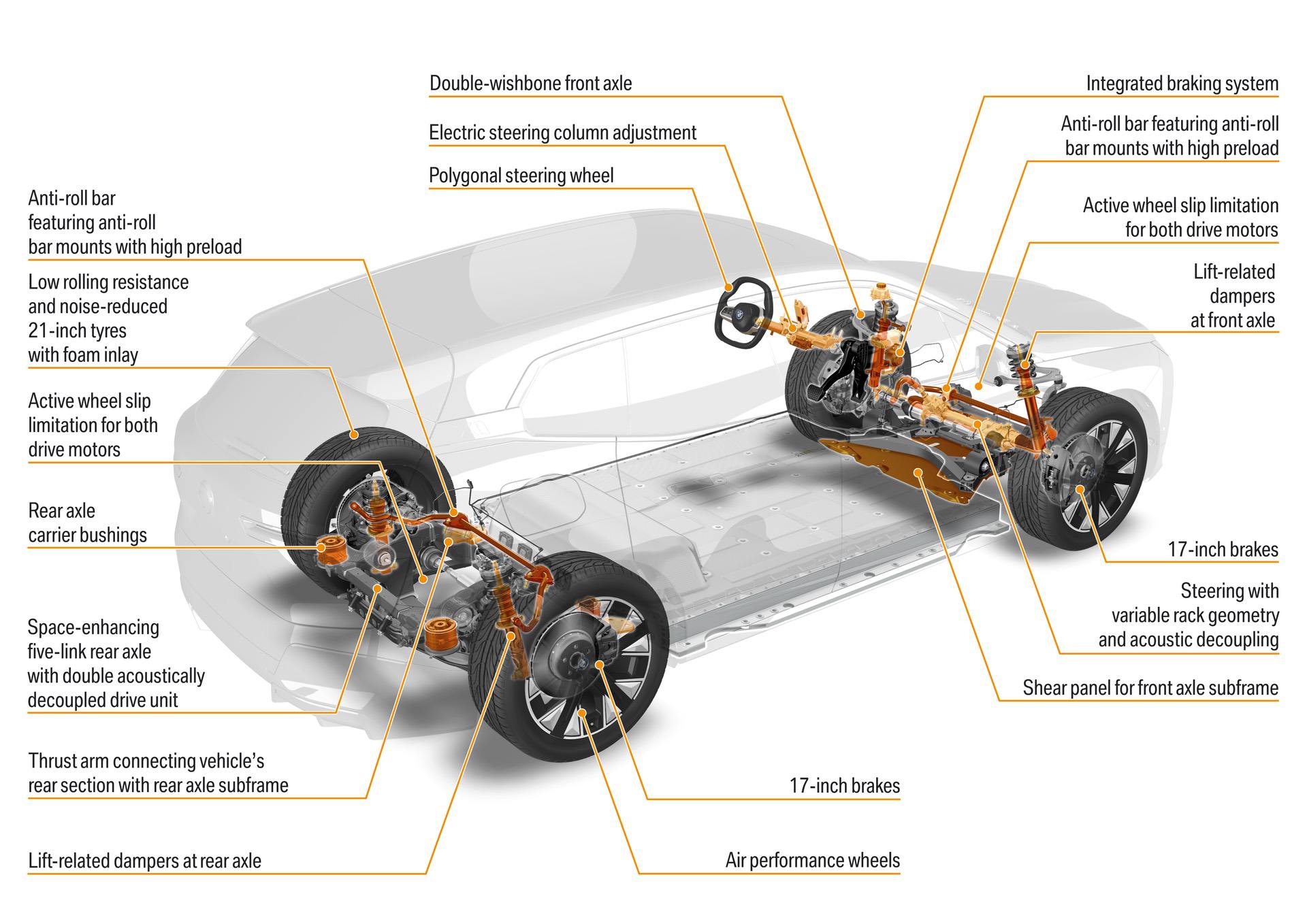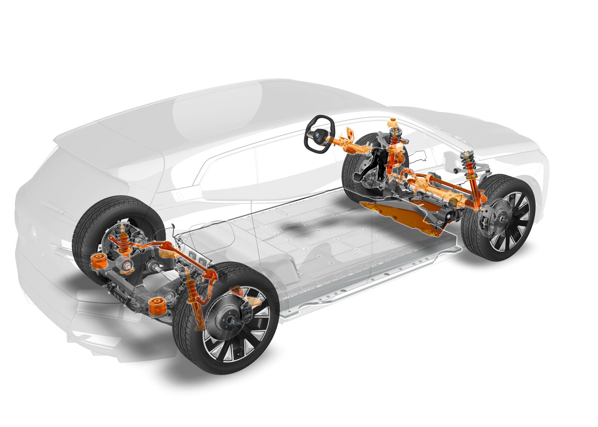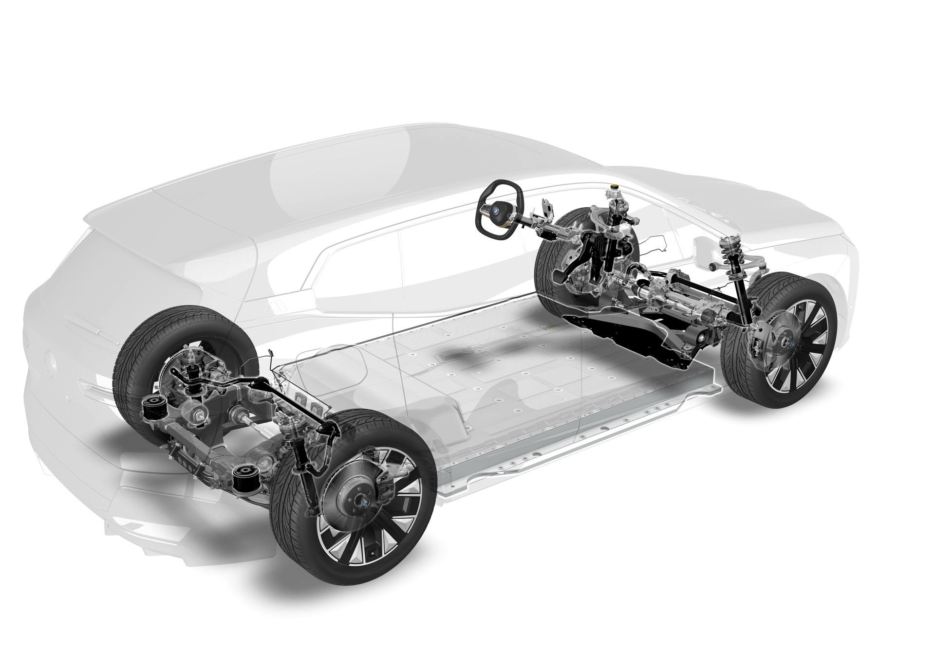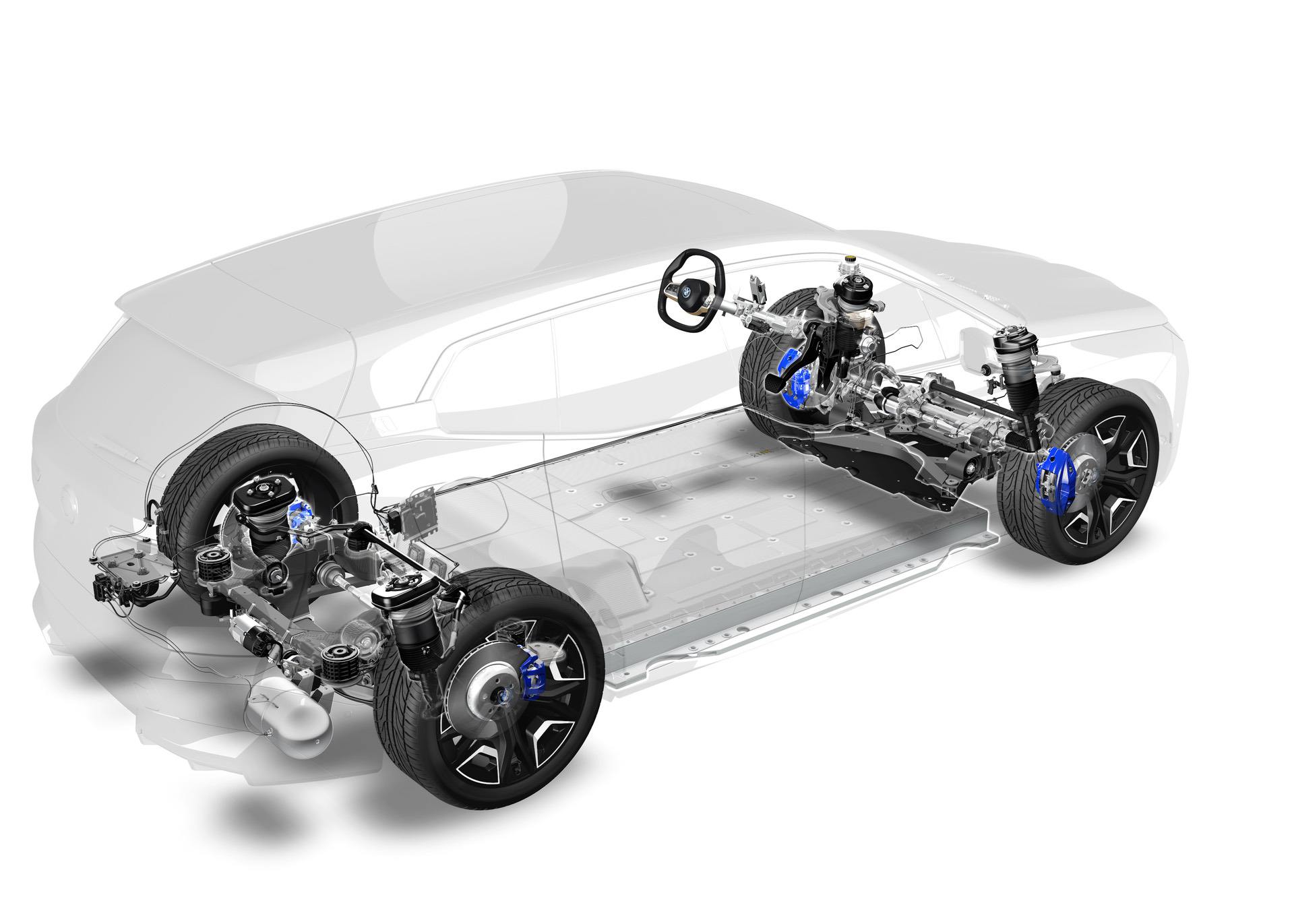 The BMW iX also comes with advanced battery cooling and heating, a system comprised of three heating/cooling circuits, interconnected with electric valves and a shared expansion tank. If the temperature is cold outside, the system can use waste heat from the electric motors to warm up the battery. If it’s hot outside, a two-level cooling module, a refrigerant compressor, two evaporators, a water-cooled condenser, and a high-performance control unit combine to help cool the battery down.