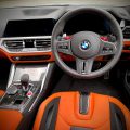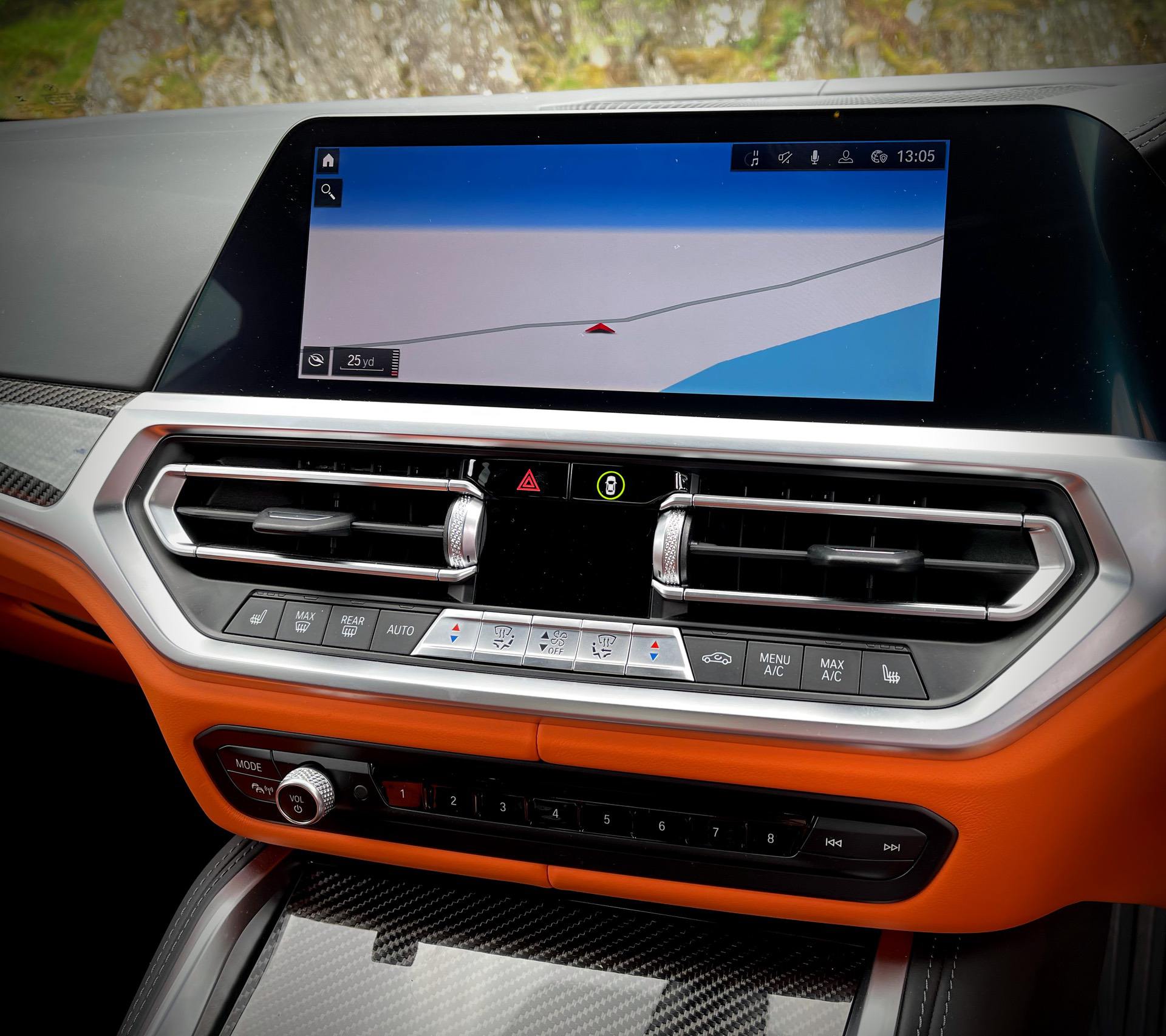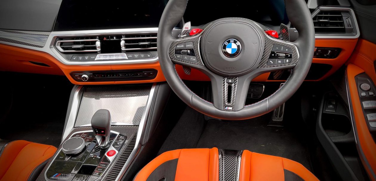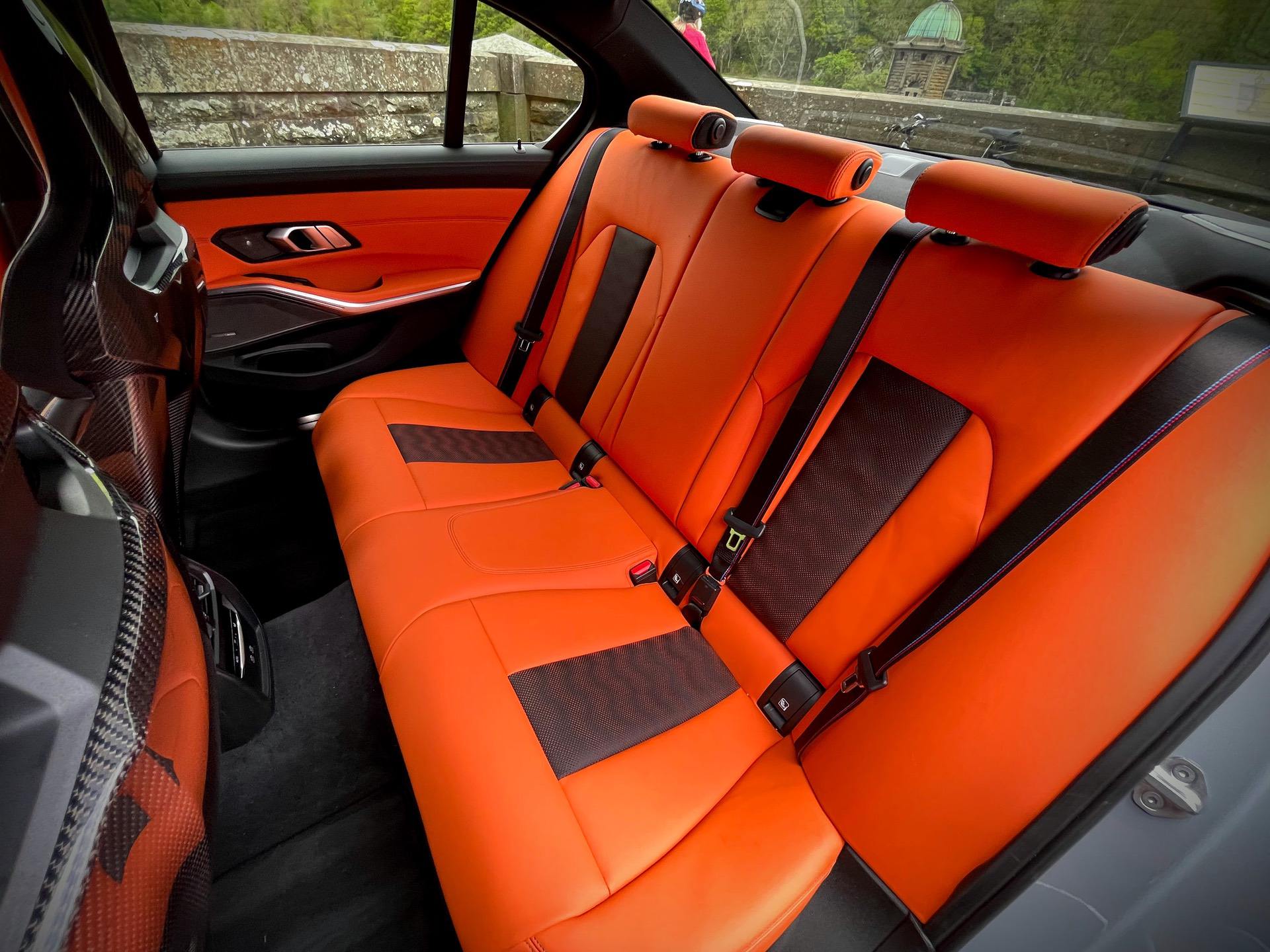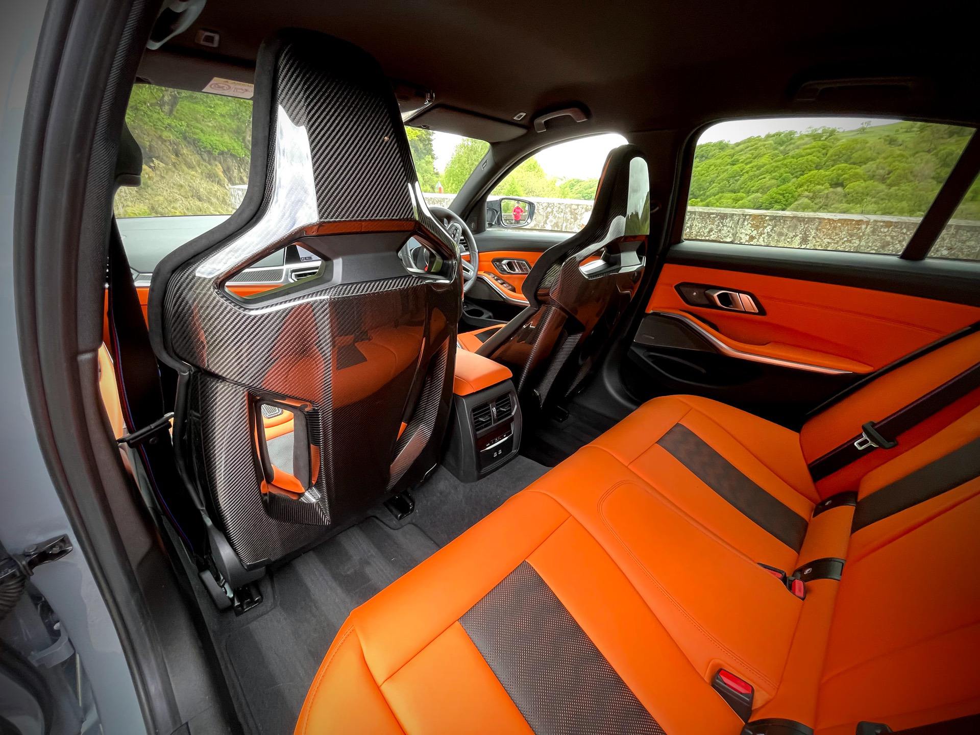 Inside, the press car was finished in Kyalami orange, a real marmite interior color. It certainly stood out even when looking in from the outside, but again, standing out is what this car is all about. The carbon pack continued inside, with a carbon fibre central console and steering wheel. The seats were a mix of leather, Alcantara and of course carbon fibre, with a central piece between the driver’s legs that I can only describe as a carbon fibre “male parts” tray. For weight saving, the seats have gaps on either side of the lower back area, presumably so that the rear passengers can tickle the front passengers in the car. There we have it, the interior of the G80 M3 Competition – male parts trays and tickle holes.