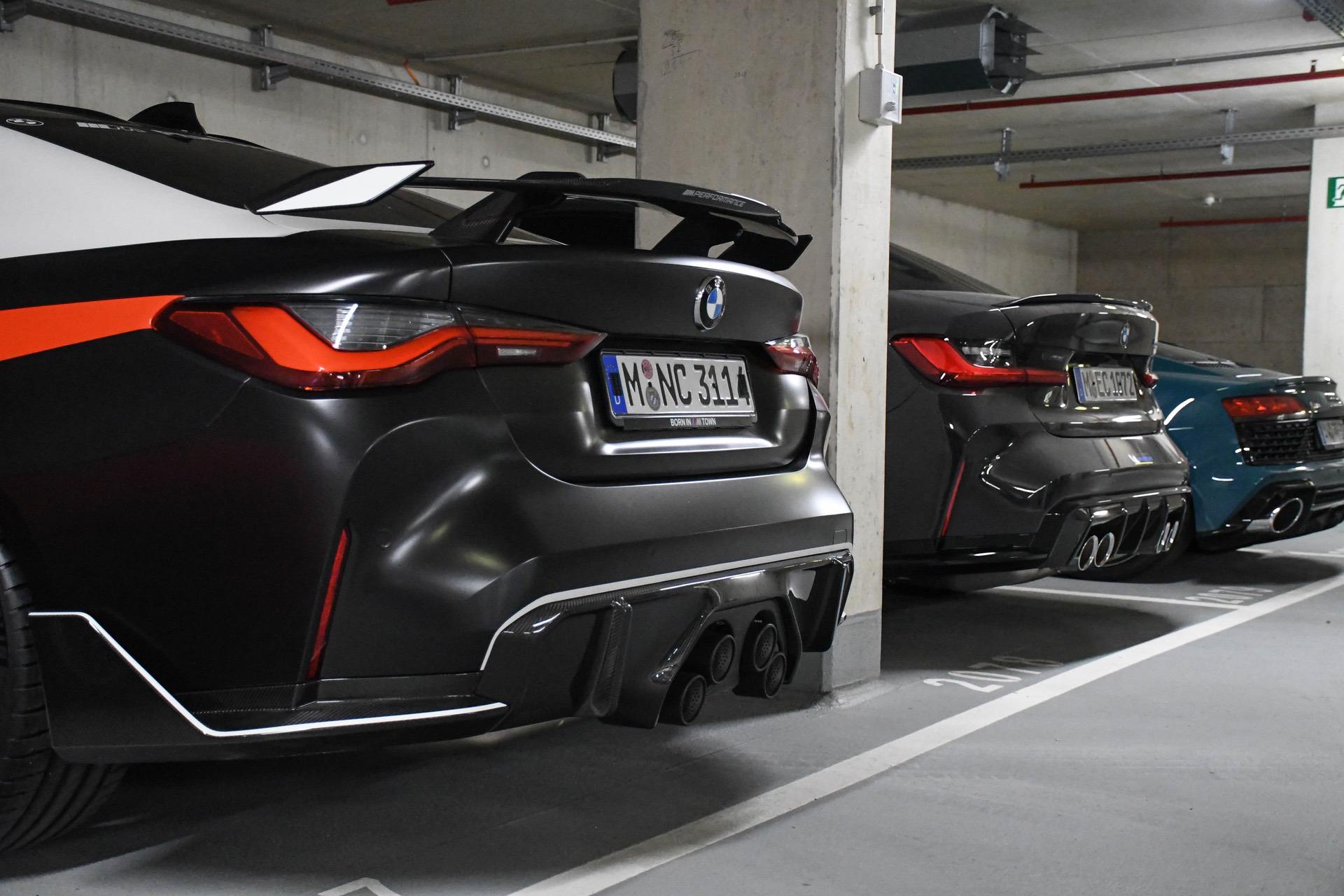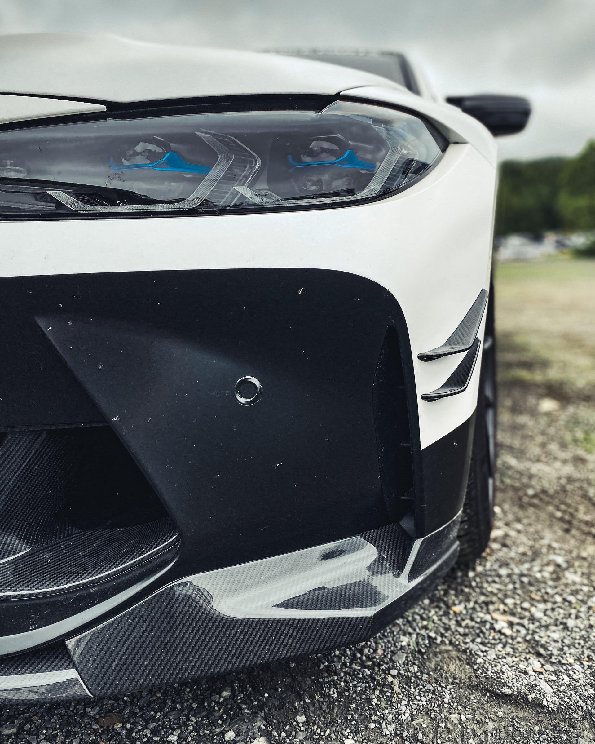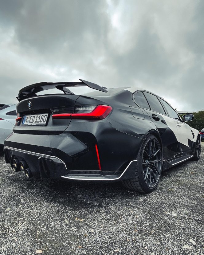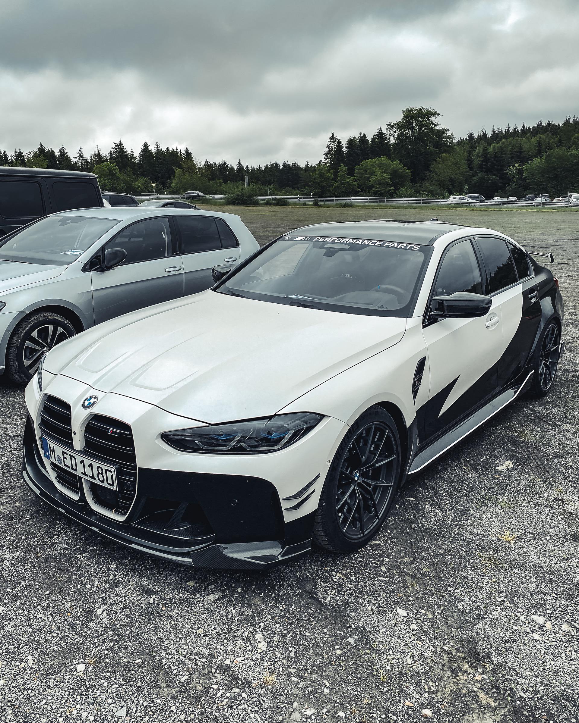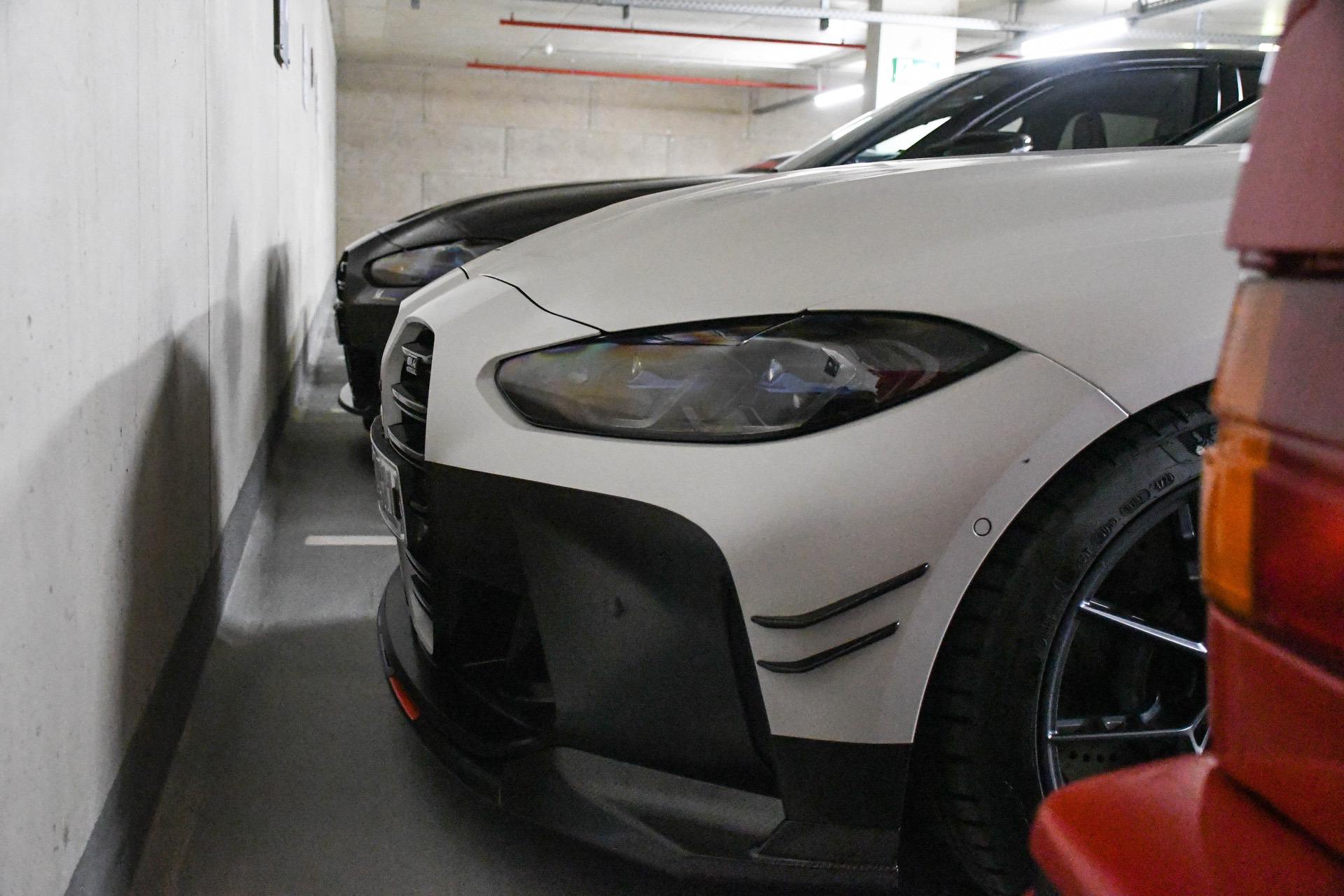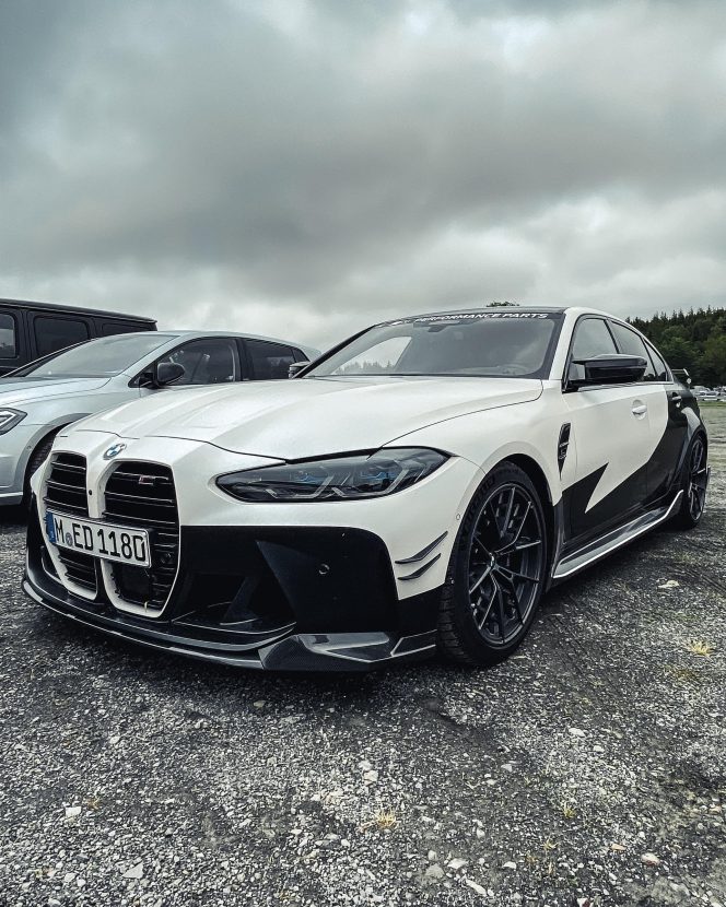As we can see in the images below, these G80/G82 M3/M4 feature a two-tone paint job – white and black – which works wonders with the blacked out aftermarket parts. We can quickly see a large fixed rear wing, new side skirts, a new lower front lip, a rear diffuser, and some canards on the front bumper. Viewed from the side, you can also spot the M Performance carbon air breathers and M Performance carbon side skirt trims.