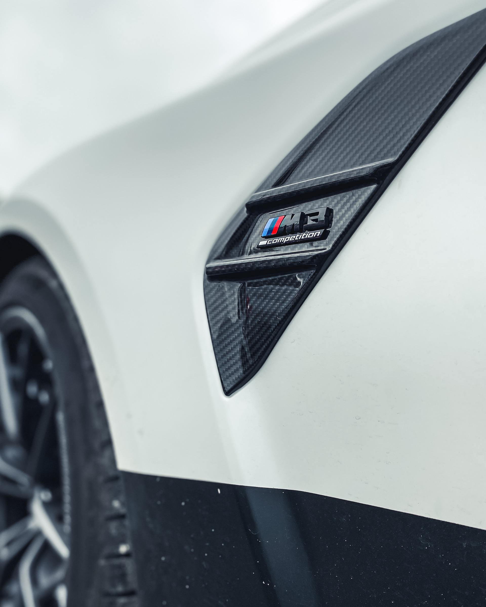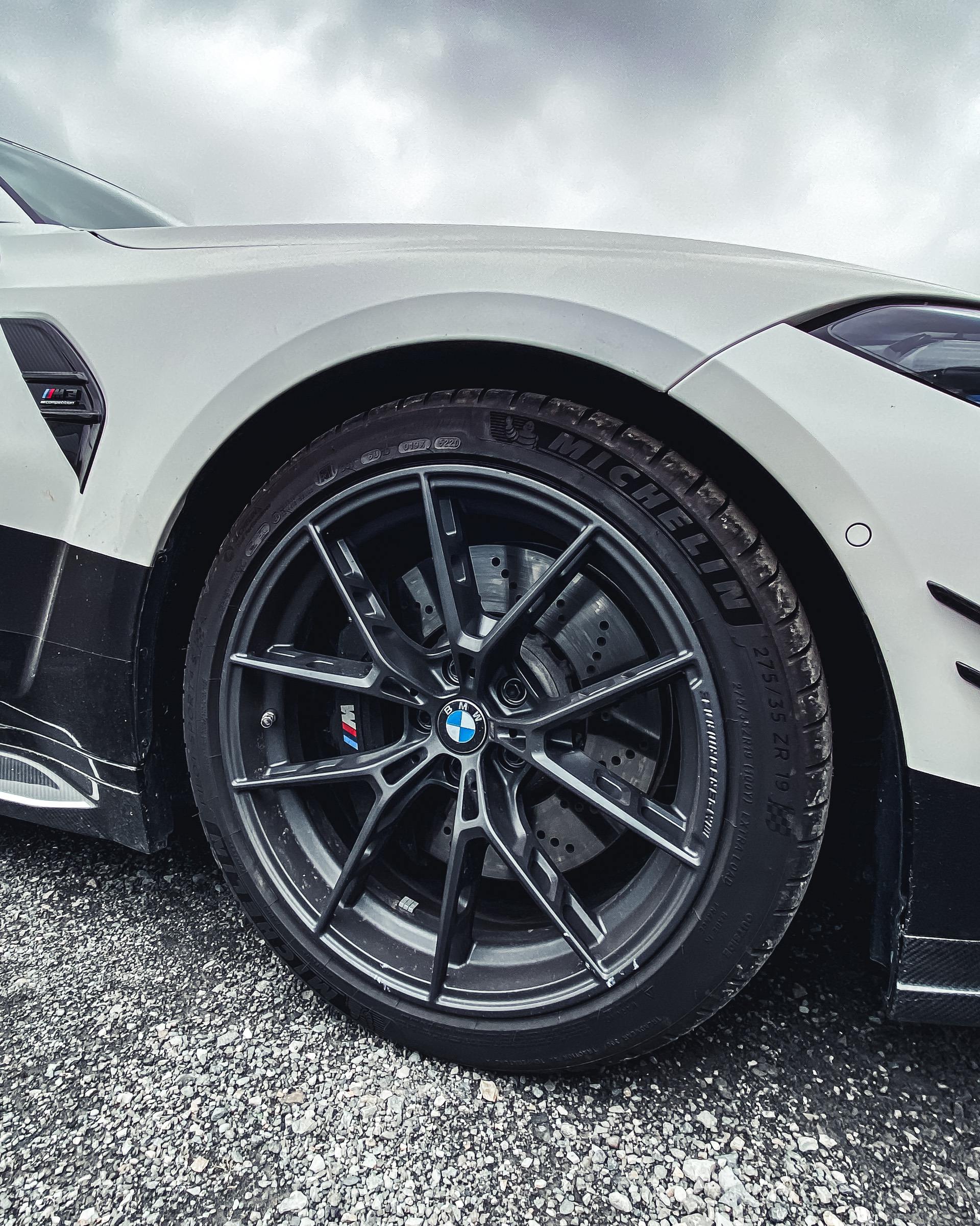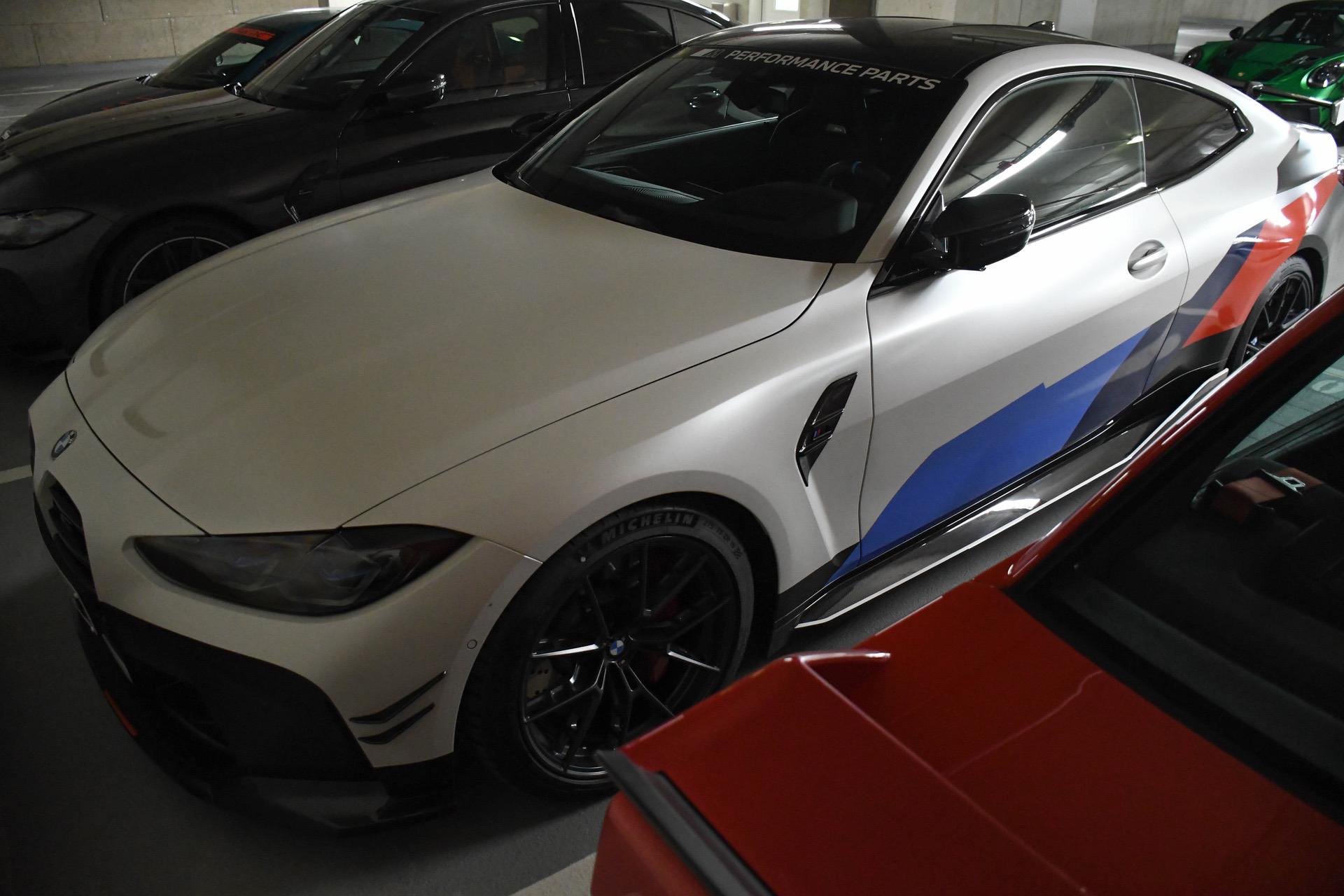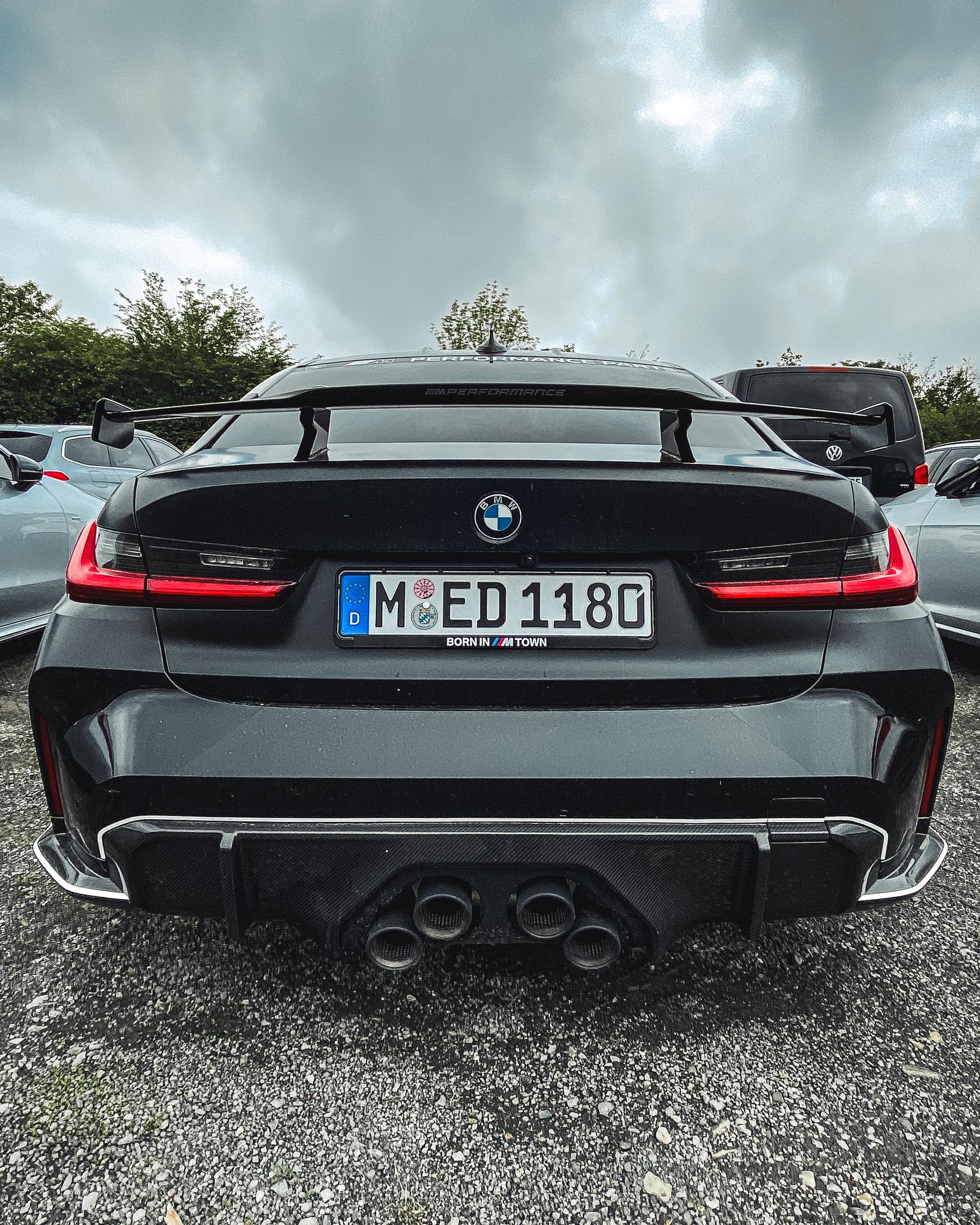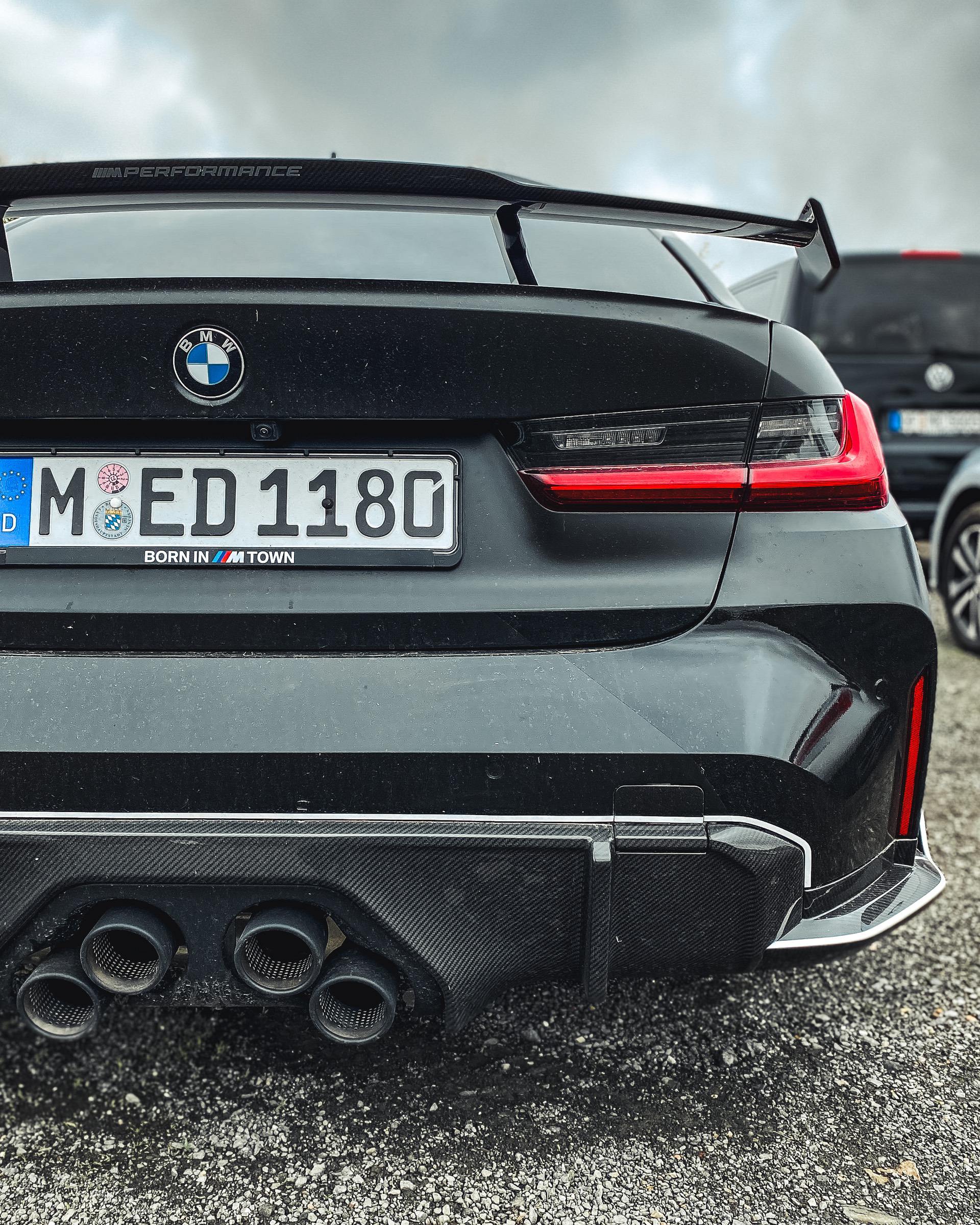 As we can see in the images below, these G80/G82 M3/M4 feature a two-tone paint job – white and black – which works wonders with the blacked out aftermarket parts. We can quickly see a large fixed rear wing, new side skirts, a new lower front lip, a rear diffuser, and some canards on the front bumper. Viewed from the side, you can also spot the M Performance carbon air breathers and M Performance carbon side skirt trims.