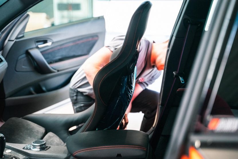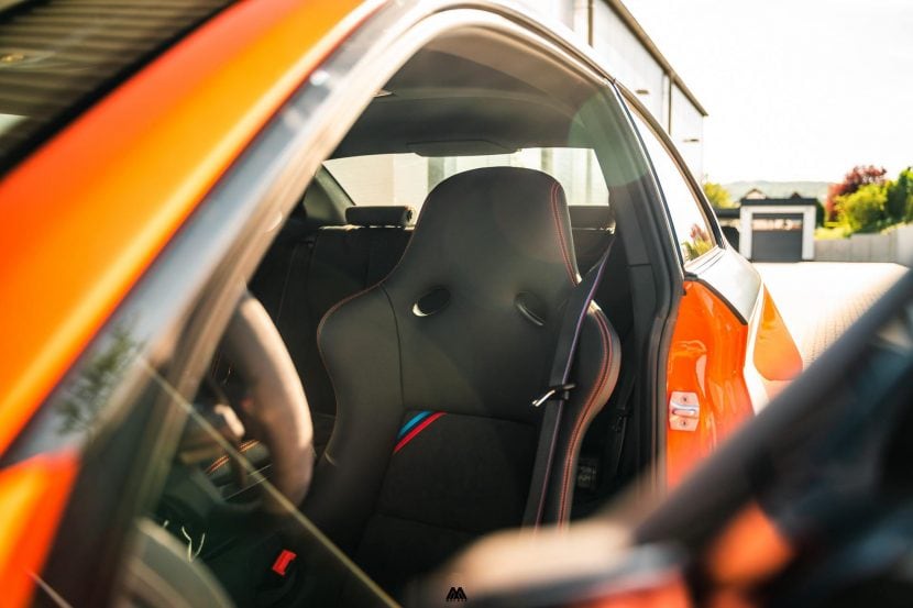 In my case, the upholsterer took both my seats – one left and one right hand side – and changed the base material. I chose the standard Kevlar shell and not the carbon ones to save some cost, but also because the M3 CSL didn’t come with carbon buckets. We went for the same design as the M4 GTS seats opting for the correct orange stitching resembling the stock seats, Nappa Leather (an improvement over the stock Dakota leather) and we integrated the belt buckle section in the side wall of the seat allowing easy entry into the seat. Total cost of the work done was roughly 1,500 EUR / 1,800 USD for two seats bringing my total cost for both seats at around 3,000 EUR, which is considerably less than one new M4 GTS seat.