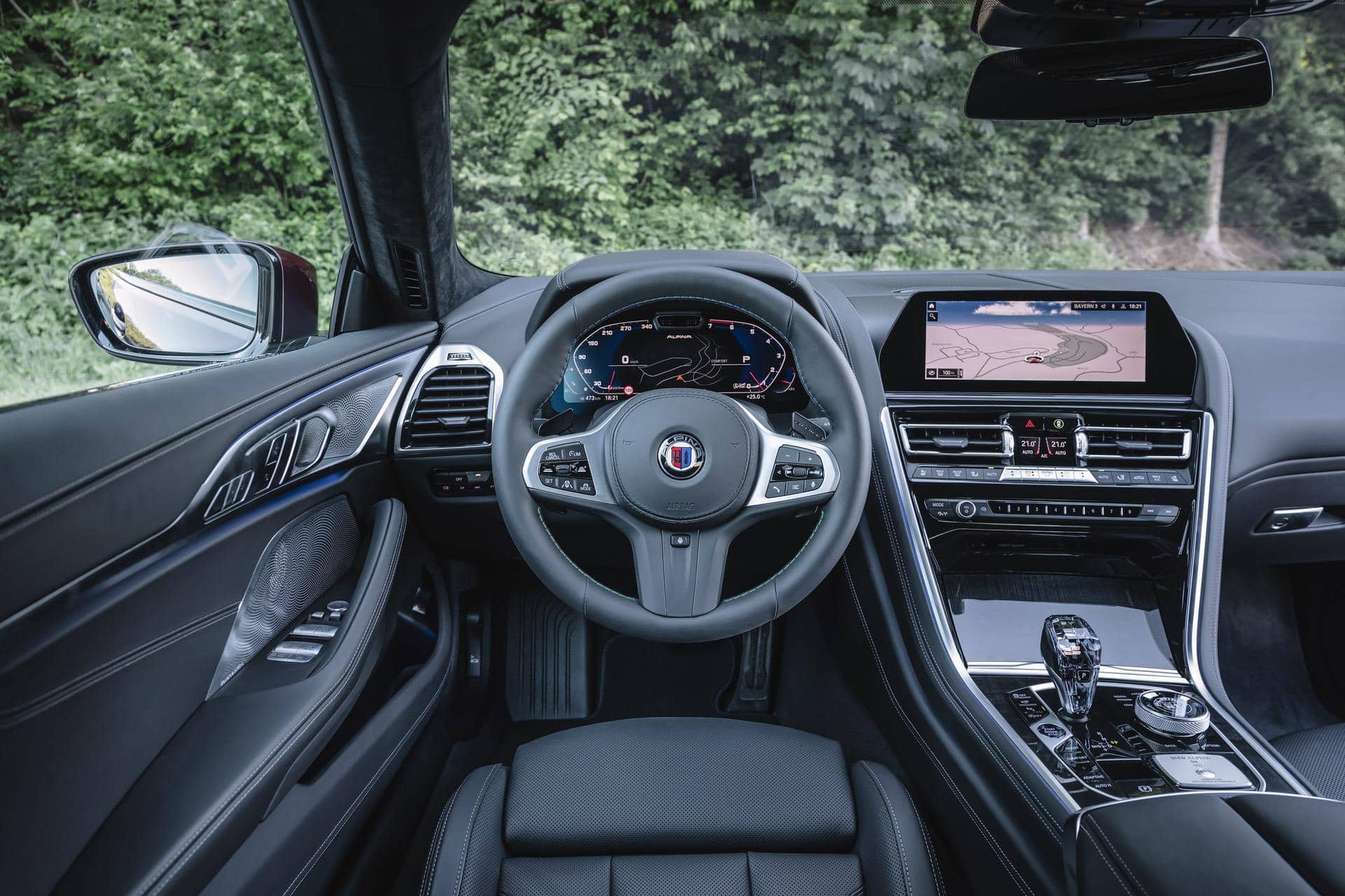 Take a step inside and you will notice the different details which we saw on other ALPINA cars as well. First of all, you will notice the steering wheel dressed in Lavalina leather and dual color stitch, and the ALPINA look on the drivers dashboard display behind it. Other details are the emblems on the floor mats, logos on the illuminated door sills, model plague sharing the B8’s production number and the iDrive controller in crystal glass with an ALPINA logo.