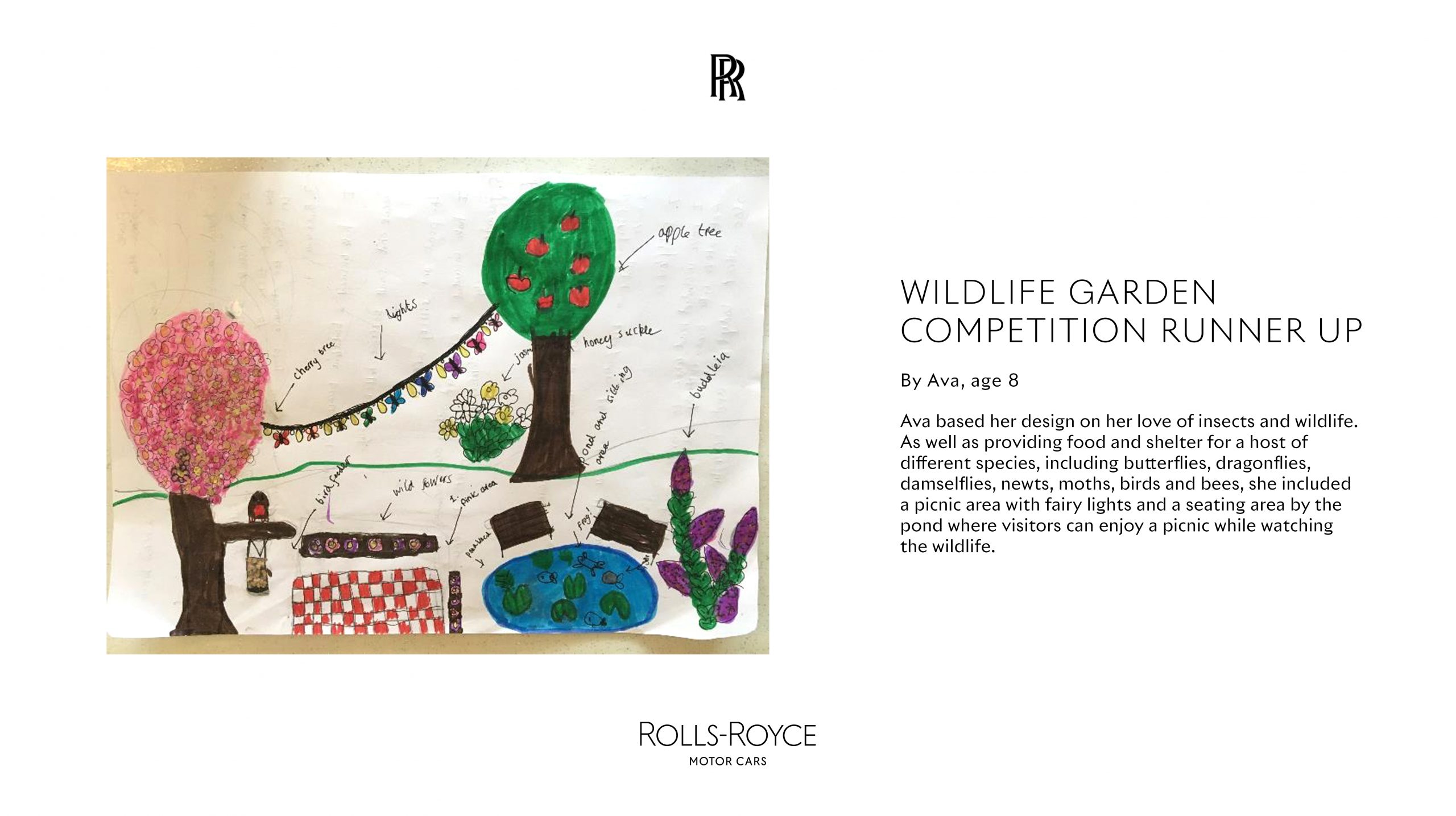 For her work, Iris will be chauffeur-driven to the Home of Rolls-Royce, then perform an official opening ceremony for the rejuvenated Garden, before viewing her winning feature in its new setting. She will receive a rendering of the Wildlife Garden with her suggested features in pride of place, created by the Rolls-Royce Bespoke Design Team with the same software used for designing customers’ cars. Iris and three runners-up also receive framed certificates to recognize their hard work and creativity.