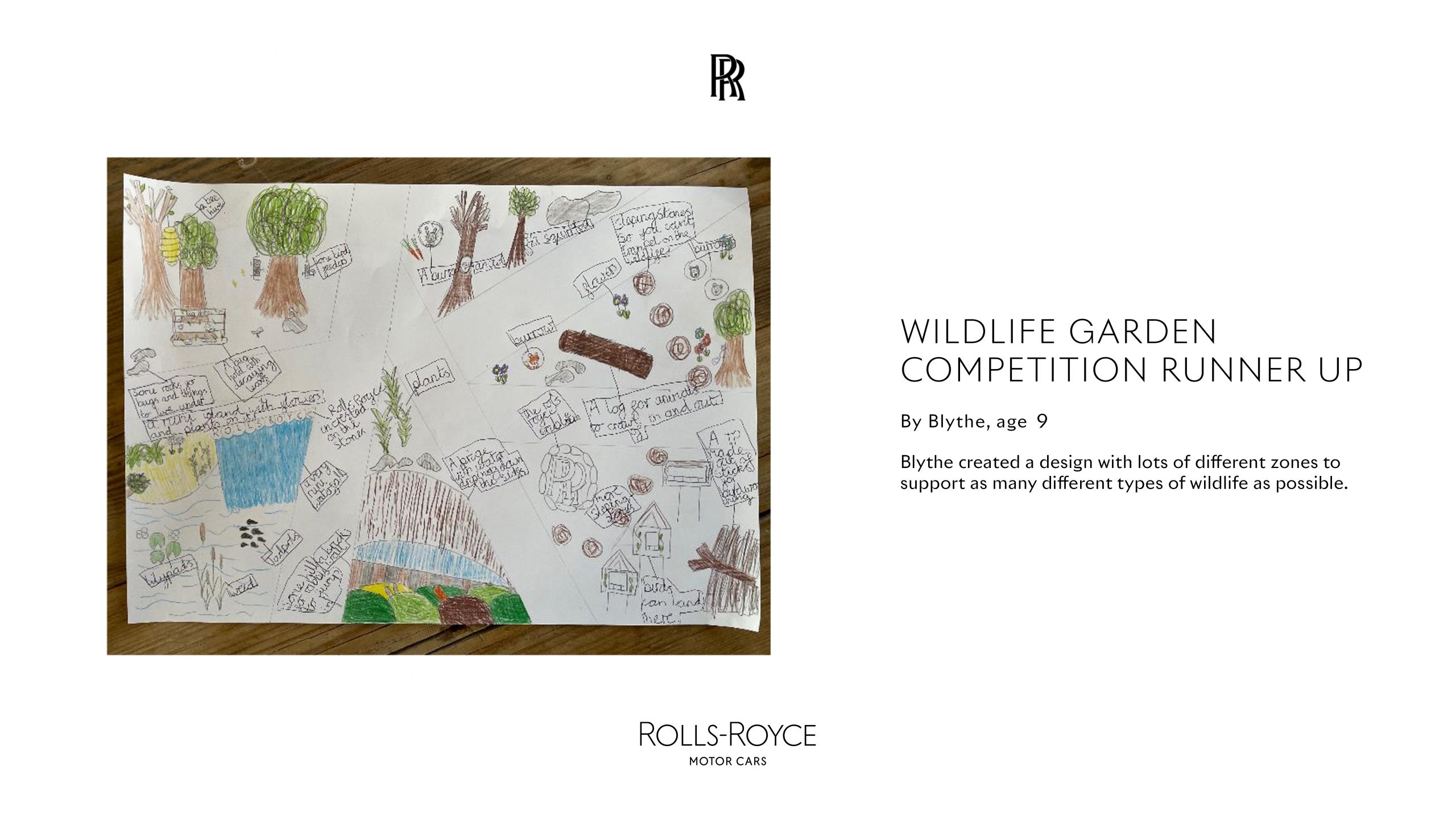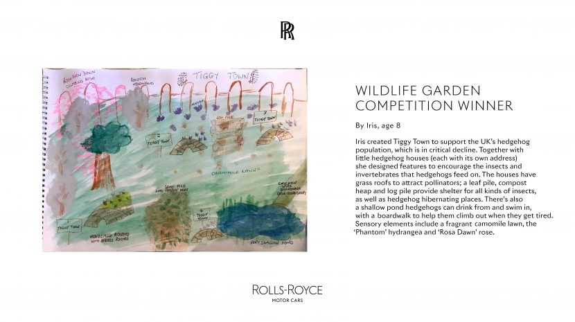 “We are delighted to announce Tiggy Town as the winner in our Wildlife Garden competition. The judges were charmed by Iris’s ideas for a space dedicated to hedgehogs, and impressed by her creativity, imagination and attention to detail. They particularly admired her research into Rolls-Royce, and the links she made between features in her garden and the motor cars we build just a short distance away.”