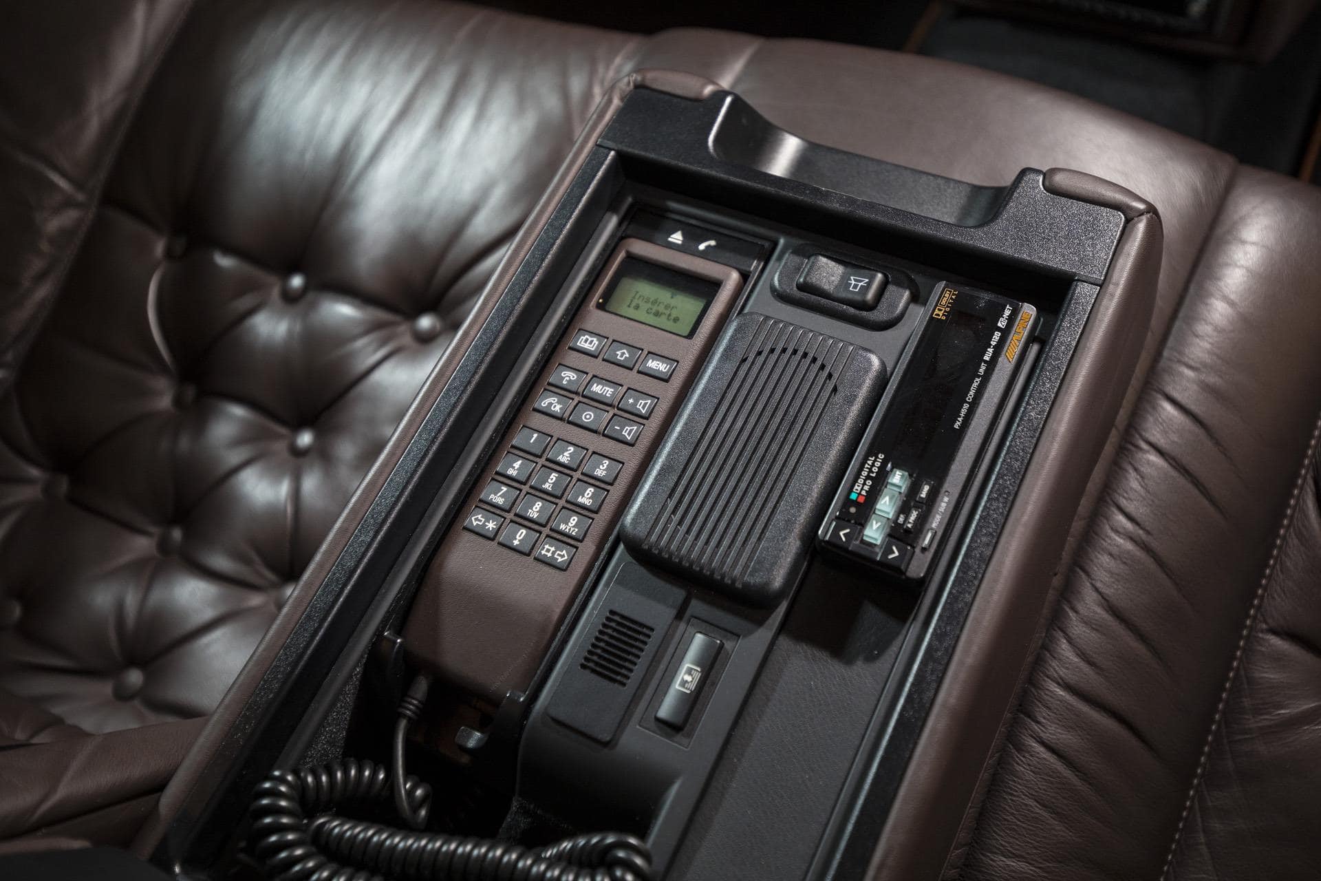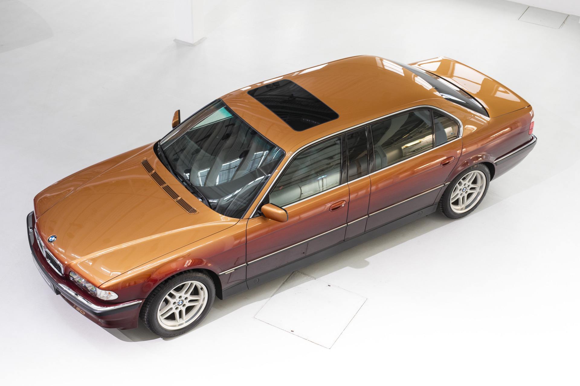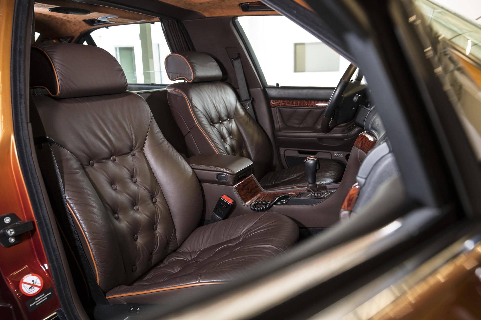 The E38 L7, made in 2000, was a small series of 899 pieces, and featured a Chestnut Brown Metallic over Gold Orange Metallic exterior paint. The interior of Lagerfeld’s BMW L7 is decorated with a Chocolate Brown leather. Its uniqueness underlines the stitching. Lagerfeld chose a contrasting orange thread. The infotainment and communication system in the rear, which was state-of-the-art at the time, was pure luxury and, in addition to an on-board telephone, also included a fax machine, VHS player, refrigerator or, as in the case of the Lagerfeld L7, a small safe. A pane of glass and heavy curtains between the first and second row of seats provided more privacy in the rear. The Lagerfeld BMW L7 also had a special designation – Designed by Karl Lagerfeld – decorated in gold on a wooden door.