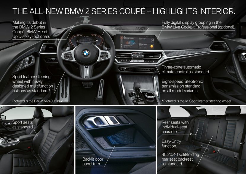 As expected, the BMW 220i will come with BMW’s typical 2.0 liter turbocharged four-cylinder engine, making 184 horsepower, 221 lb-ft (300 Nm) of torque, and return up to 37 mpg (6.3 liters per 100 km). While the BMW 220d uses a 2.0 liter turbo-diesel, that makes 190 horsepower and 295 lb-ft (400 Nm) of torque, while returning 50 mpg (4.7 liters/100 km). The BMW 230i gets another 2.0 liter turbo-four but with 255 horsepower and 295 lb-ft (300 Nm) but fuel economy ratings weren’t released. Lastly, the BMW M240i gets a 3.0 liter turbocharged inline-six engine, with 382 horsepower and 369 lb-ft of torque, while getting 29 mpg (8.1 liters/100 km).