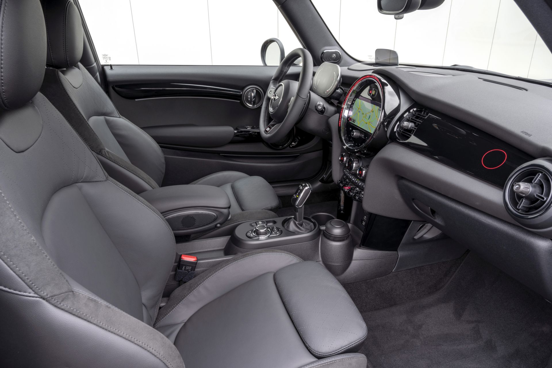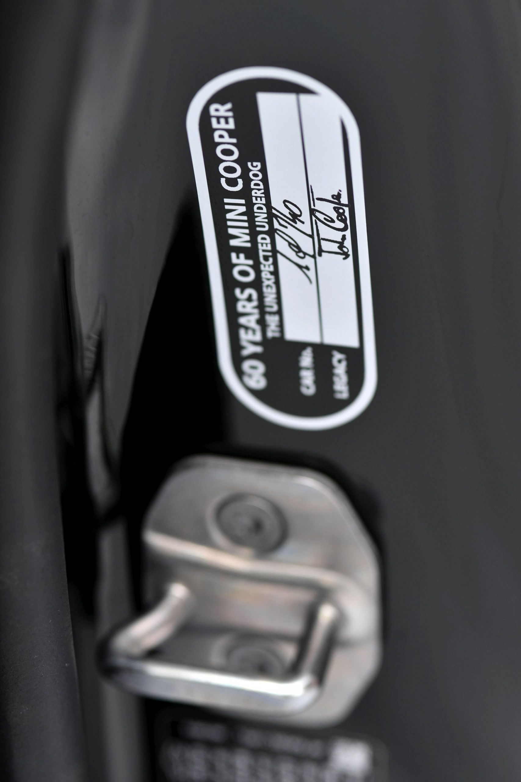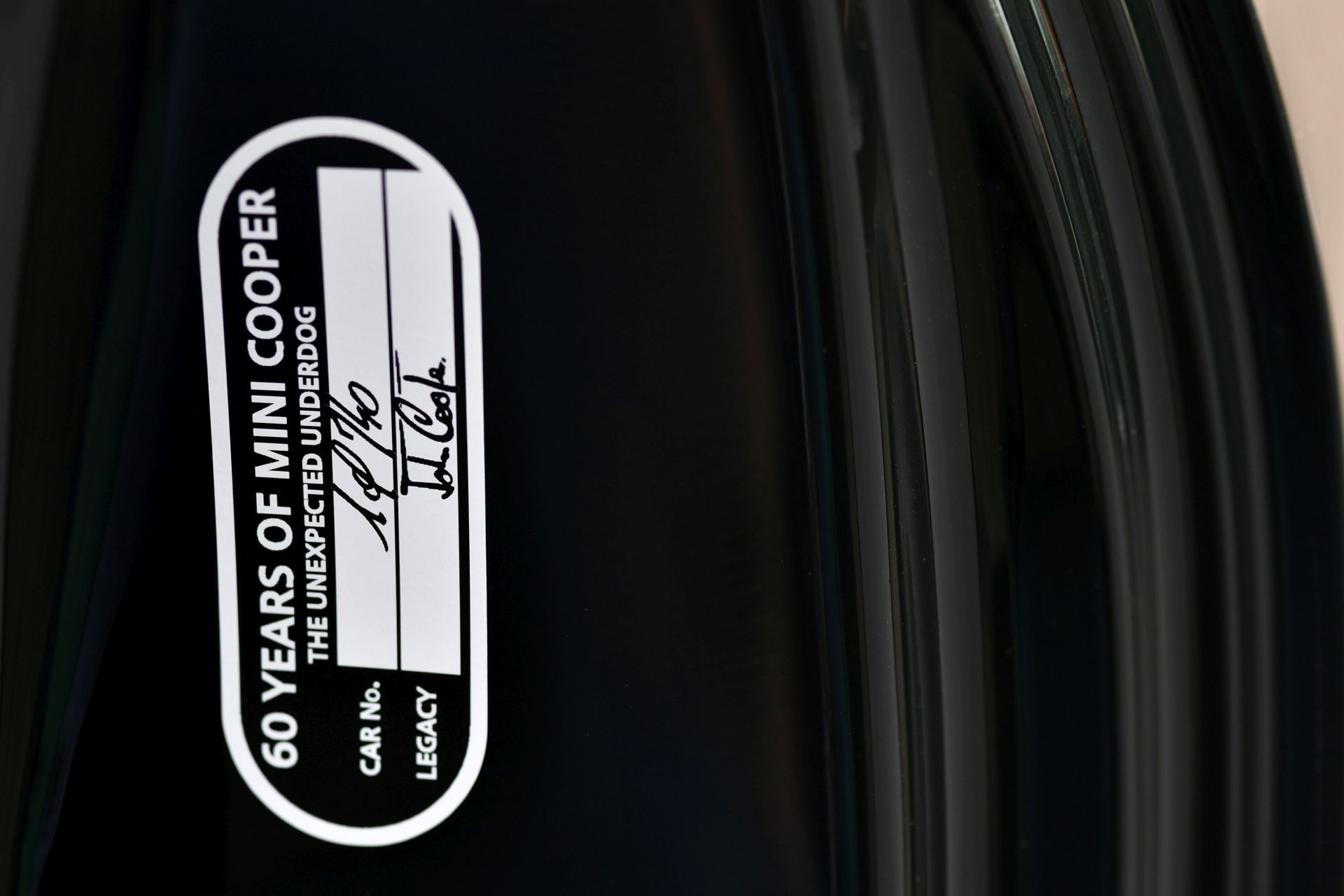 Inside you’ll find John Cooper Works sports seats in Dinamica/leather Carbon Black finish, an anthracite-colored headliner, stainless steel pedal set and interior trim in Piano Black high-gloss. The red ring from the original John Cooper logo adorns the luggage compartment lid and the interior surface on the passenger side. On the driver’s side, the interior surface features the signatures of John, Mike and Charlie Cooper. Furthermore, the inside of the driver’s door frame features an emblem with John Cooper’s signature, the handwritten note “1 of 740” and the words “60 YEARS OF MINI COOPER – THE UNEXPECTED UNDERDOG”.