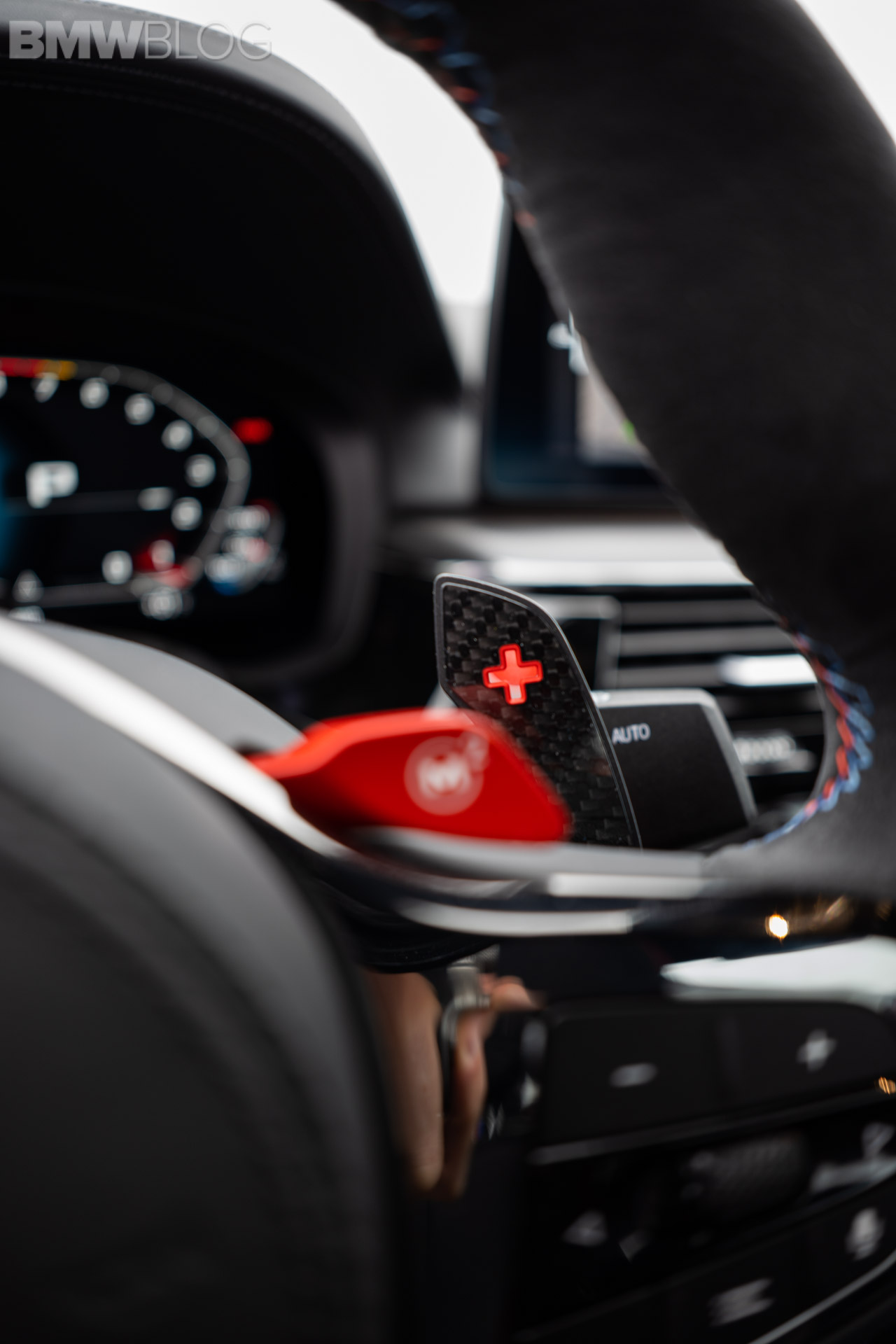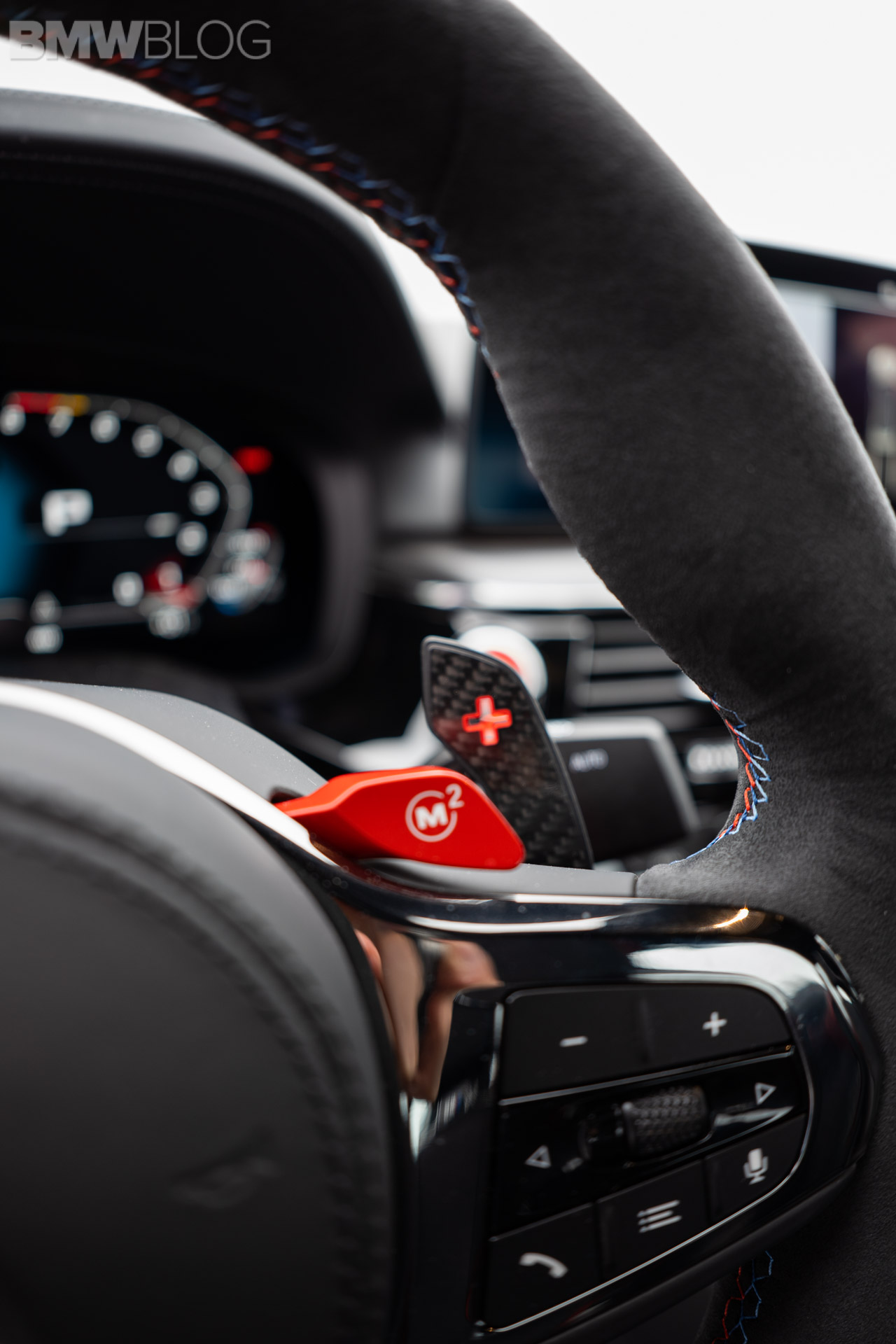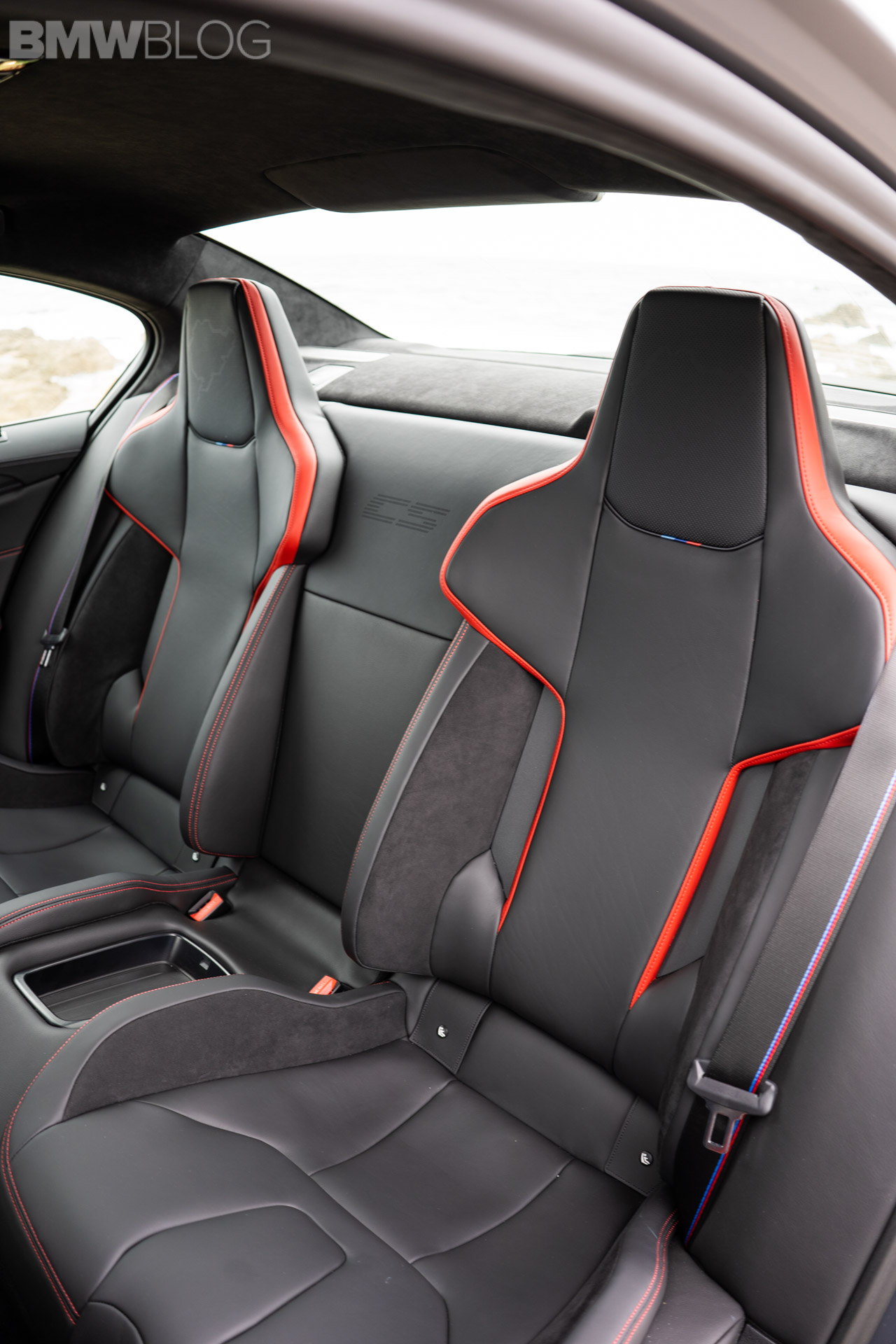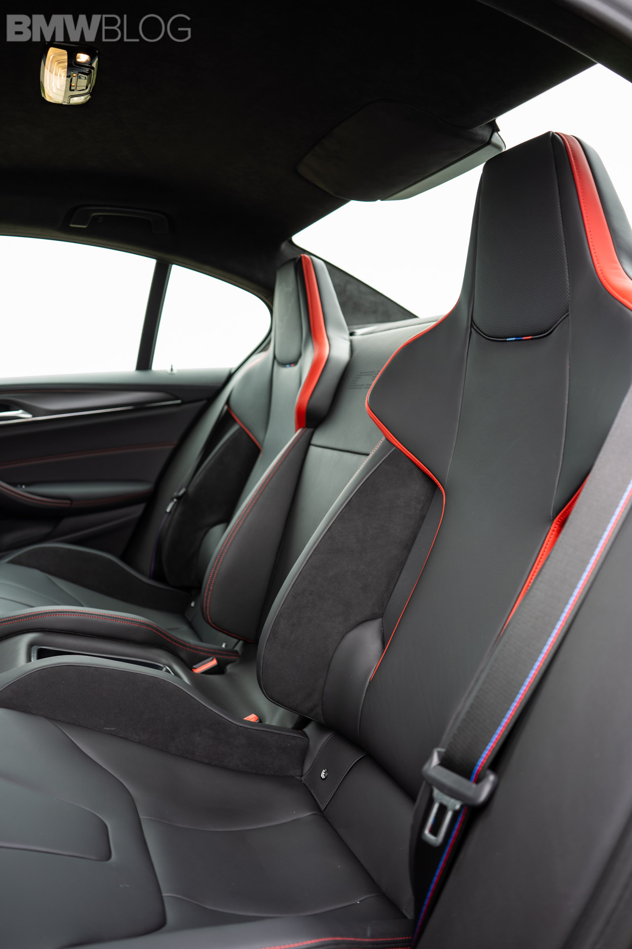 The steering wheel is entirely Alcantara with a top-mounted stripe, just like the M2 CS’, the seats look absolutely fantastic and the back seat, with just its two racing buckets, is pure hooliganism. The seats even feature Nurburgring imprints in their headrests. In the back of the BMW M5 CS, you’ll notice just two lightweight bucket seats.