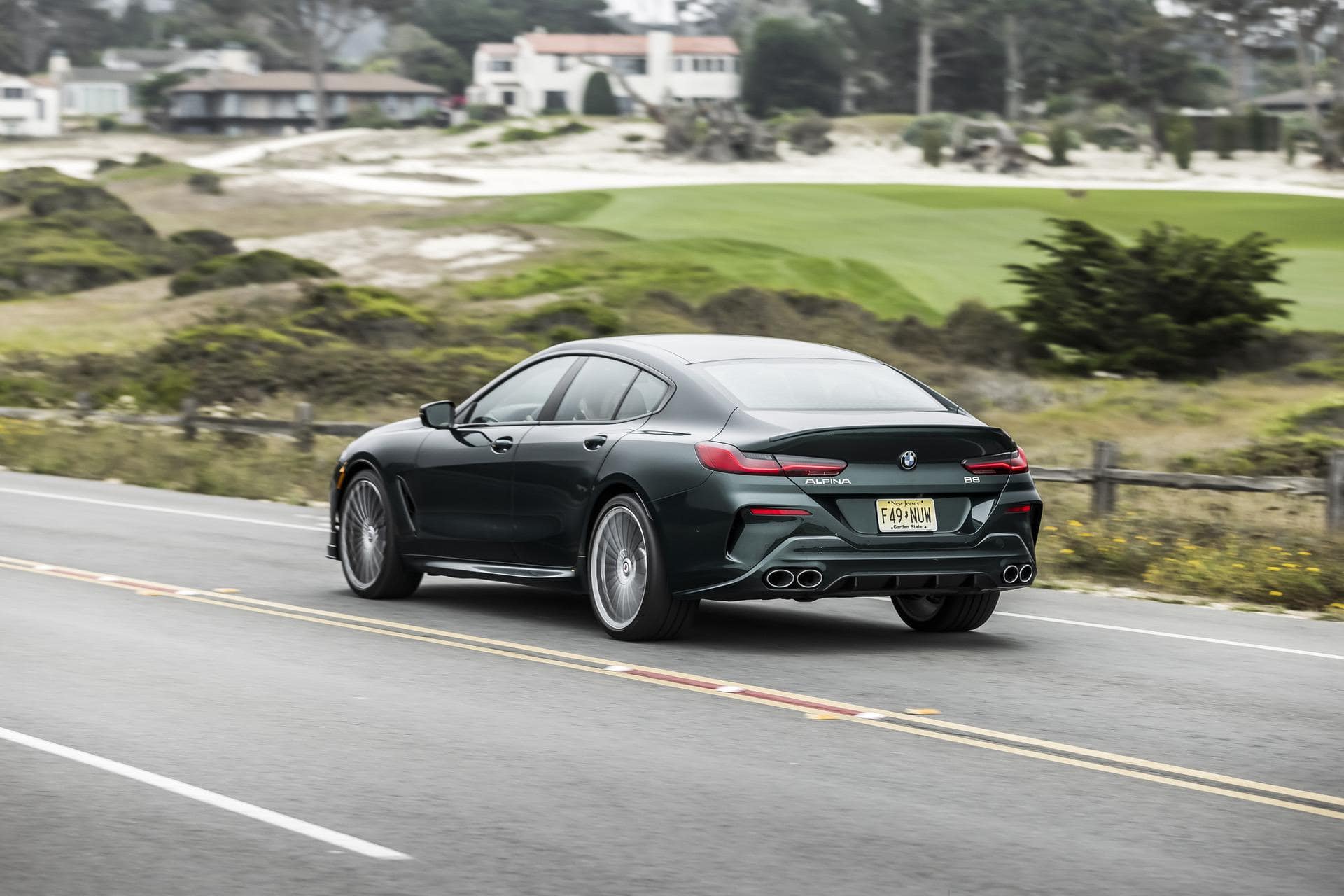 This new photo gallery was shot near Monterey and Pebble Beach and shows the elegant, yet sporty four-door gran coupe in the aforementioned green. But it’s not just the color that immediately points out to an ALPINA model. We see the B8 Gran Coupe with the usual ALPINA design elements and the optional M carbon roof. Many other ALPINA design cues are present on this luxury four-door coupe, like the modified aprons on the front and rear, the exhaust system with its four tailpipes and the 21-inch forged wheels in the characteristic classic multi-spoke design.