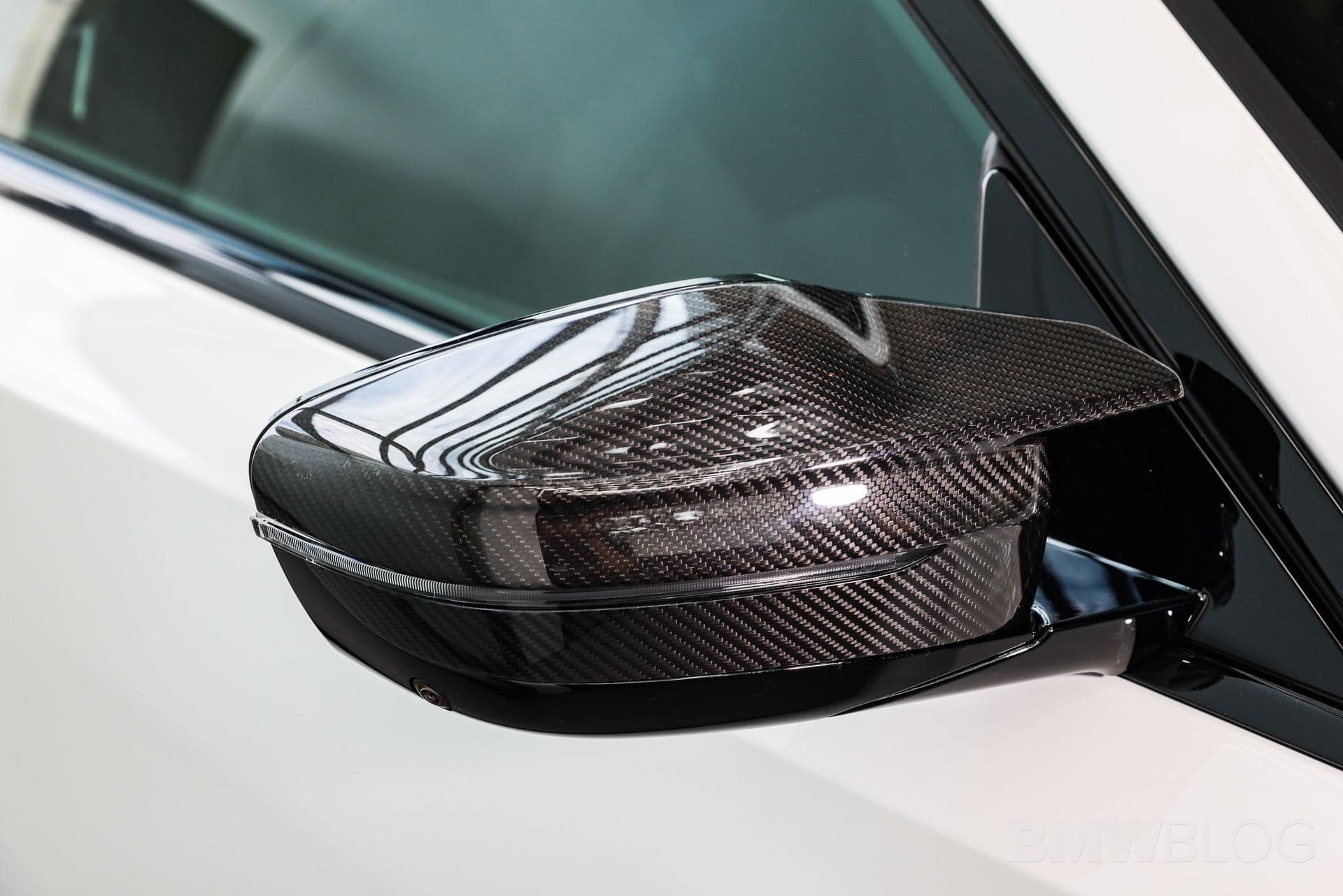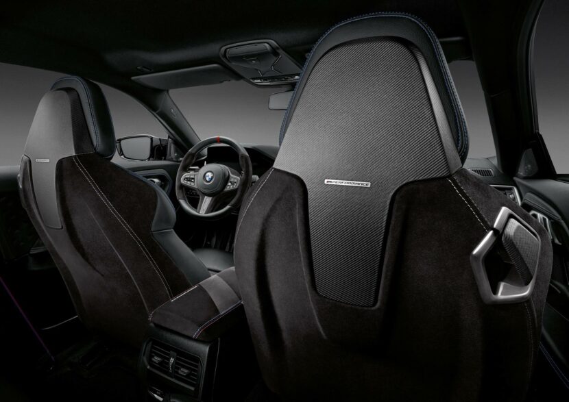Inside, there’s an M Performance steering wheel, with Alcantara nine and three o’clock positions, as well as a red twelve o’clock stripe. You can also get the paddle shifters in carbon fiber. Thickly bolstered sport seats feature M Performance badging, what seems to be Alcantara on the seat backs, and some carbon fiber trim on the back of the headrests.