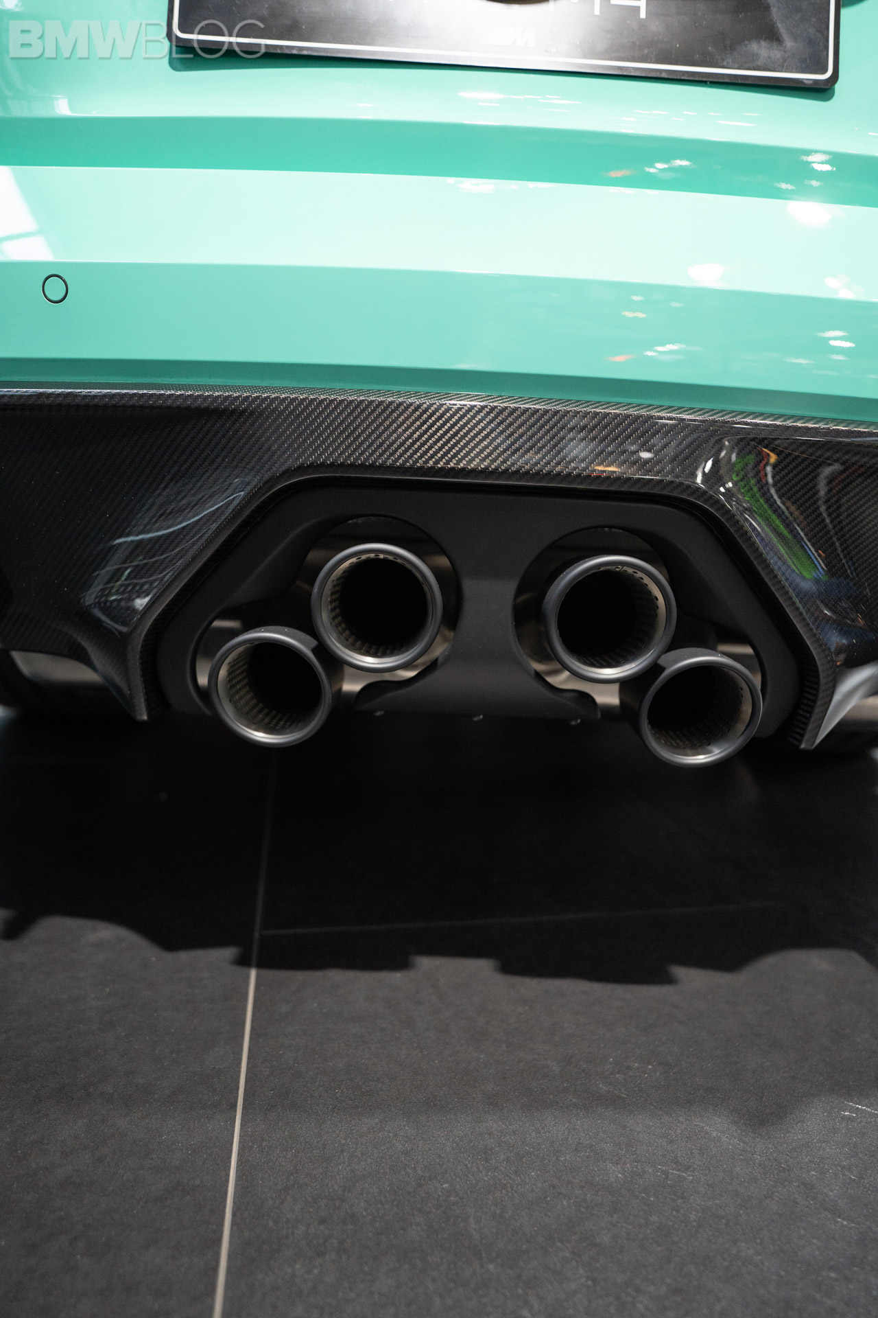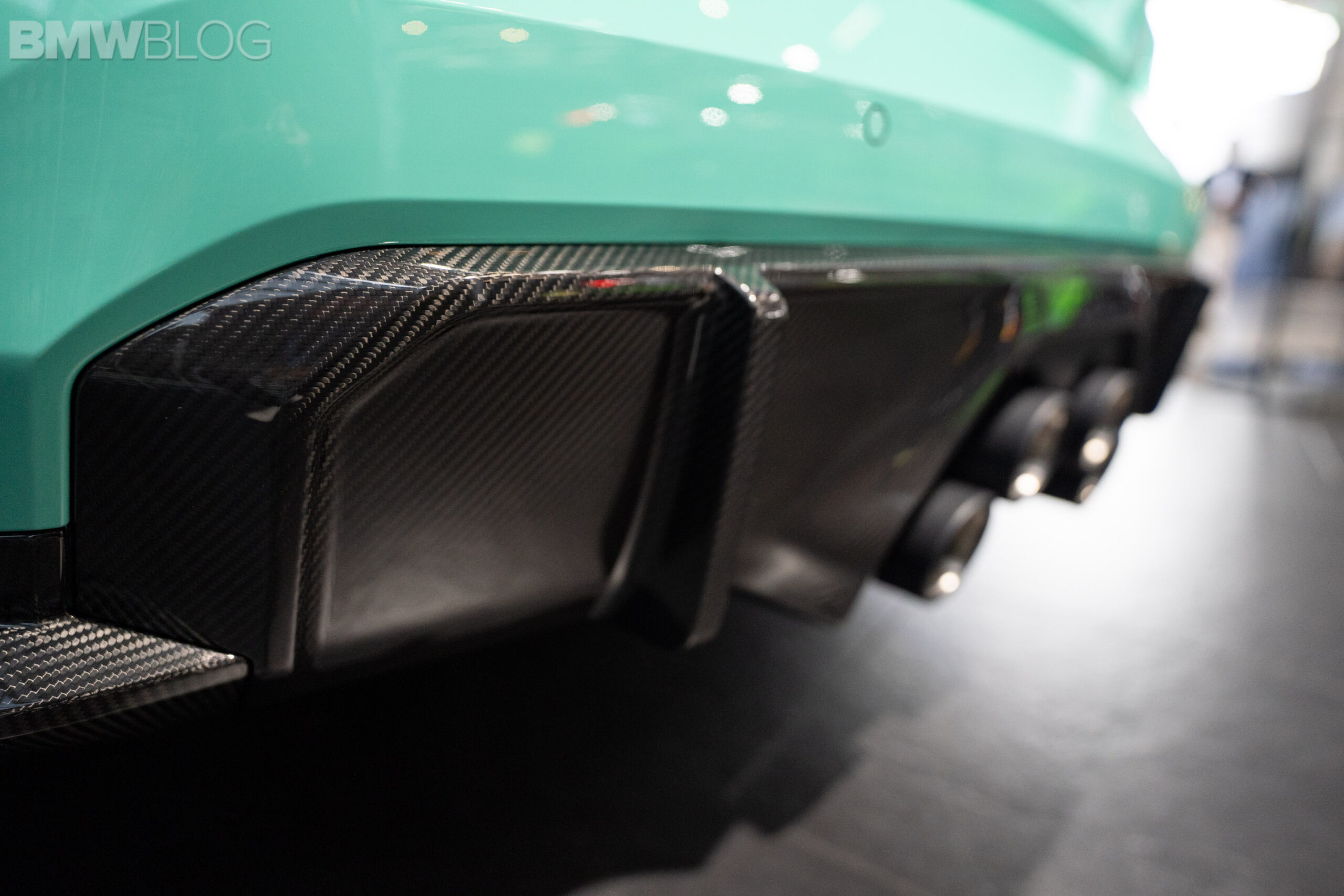This specific BMW M4 Competition wears the Individual Mint Green paint but it also has 20″ gold wheels, which is an unusual color combo. To be honest, I’m not quite sure it works but I also don’t hate it. It’s an odd choice for sure but I don’t think it’s a bad one. However, the Mint Green paint is great, especially with the contrasting accents, such as all the black trim and carbon fiber aero.