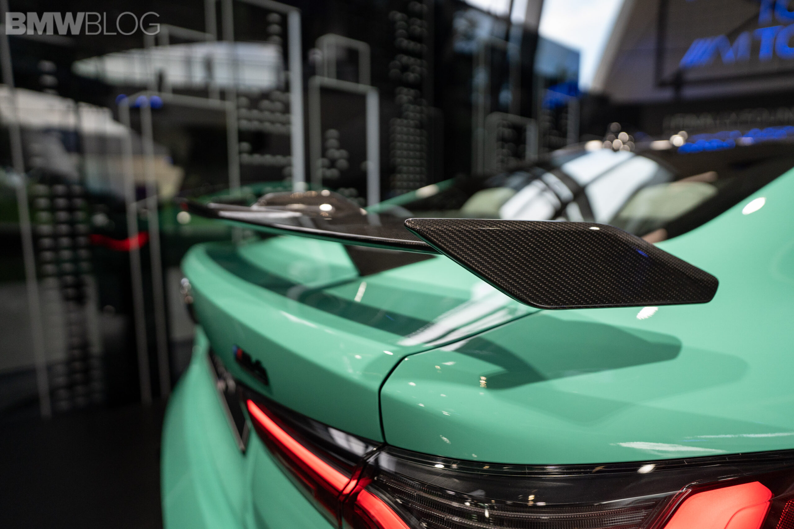Speaking of aero, this M4 Comp also has some M Performance parts. For example, there’s a carbon fiber front splitter, some cute little canards which likely aren’t functional in any way, some new side skirts, and a large fixed rear wing. All off which are carbon fiber and they mostly look good, especially with the Mint Green paint (am I the only one that hears Joe Pesci’s voice, saying “Metallic Mint Green Paint“?).