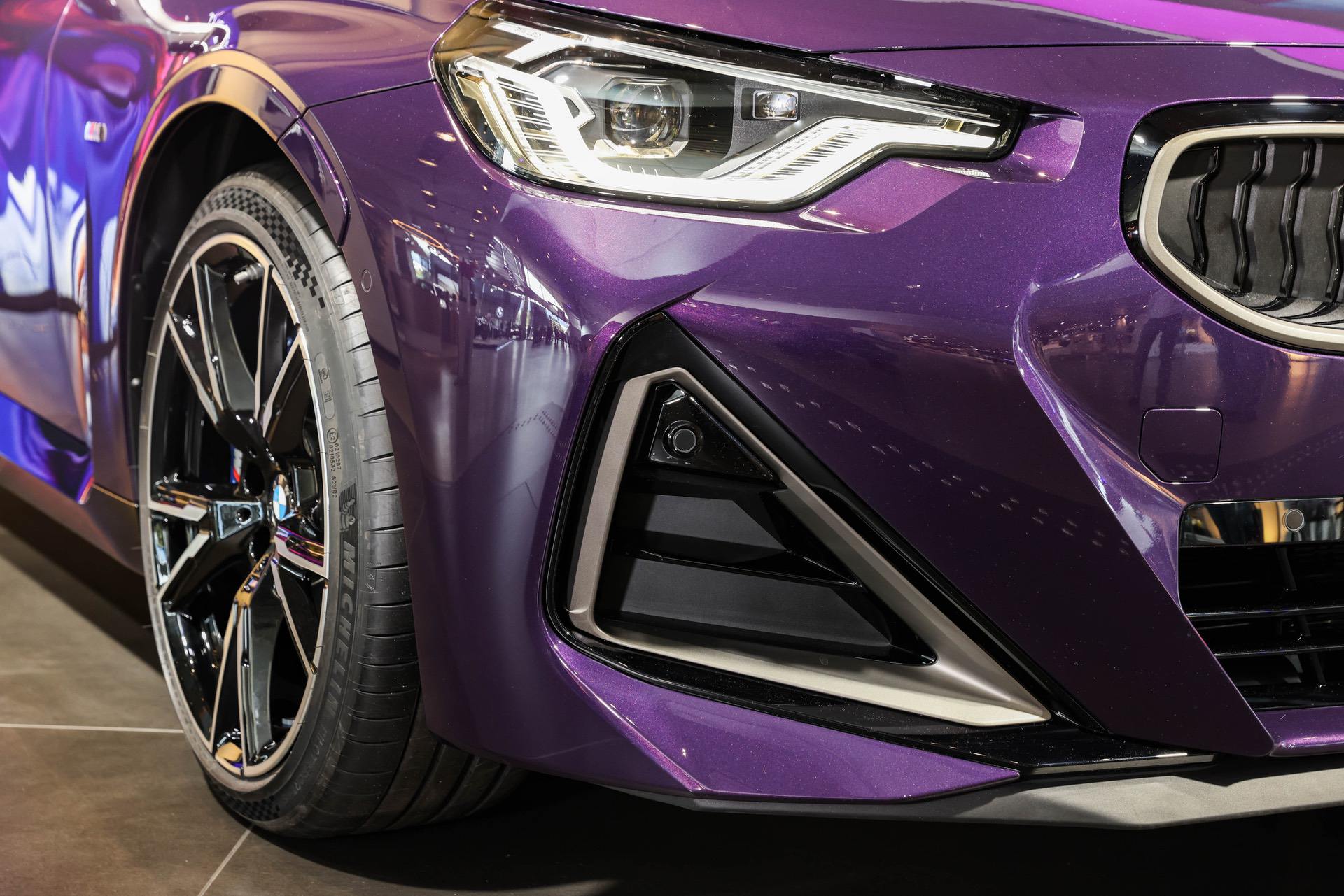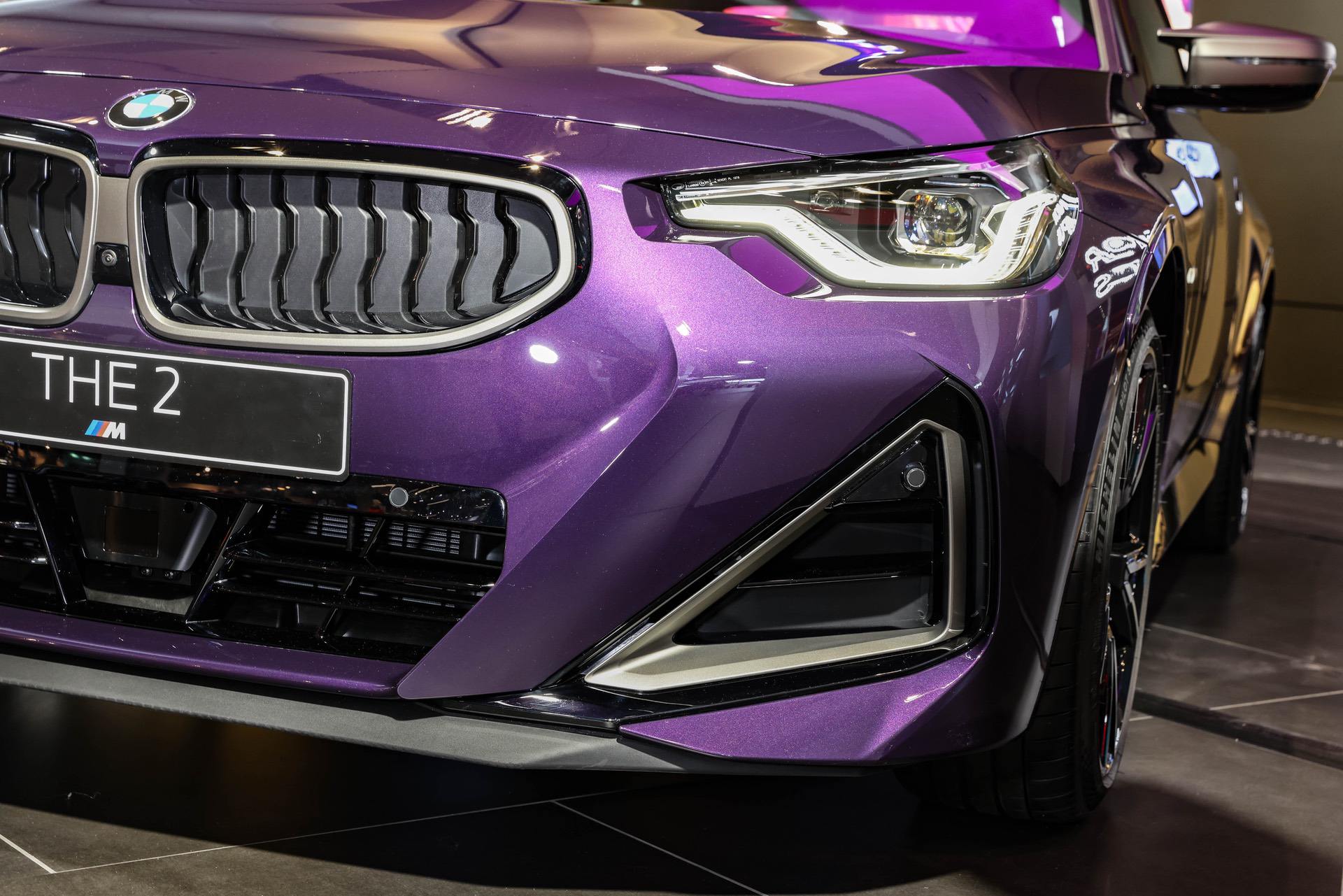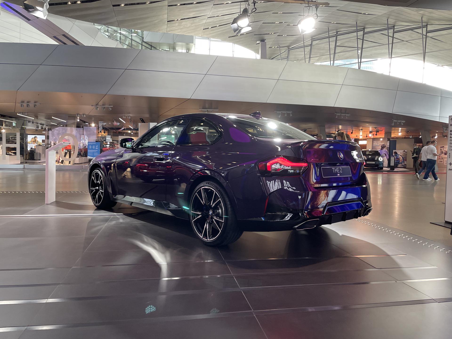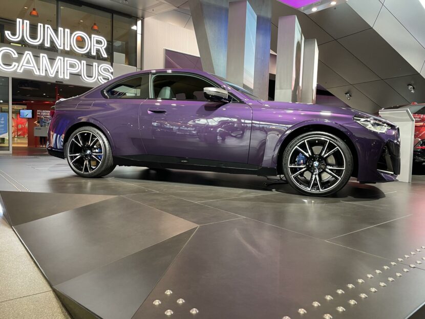 The new BMW 2 Series Coupe is now part of the BMW Welt exhibit. A Thundernight Metallic M240i xDrive is greeting the visitors as soon as they enter the iconic building in the heart of Munich. The new purple color is a first for BMW and, for now, it is exclusive to the G42 2 Series Coupe. Thankfully, all 2 Series variants come with a few great color options, such as Melbourne Red, Portimao Blue or Brooklyn Grey. The rest are your typical BMW colors; Alpine White, Jet Black (non-M240i models only) and Black Sapphire Metallic.