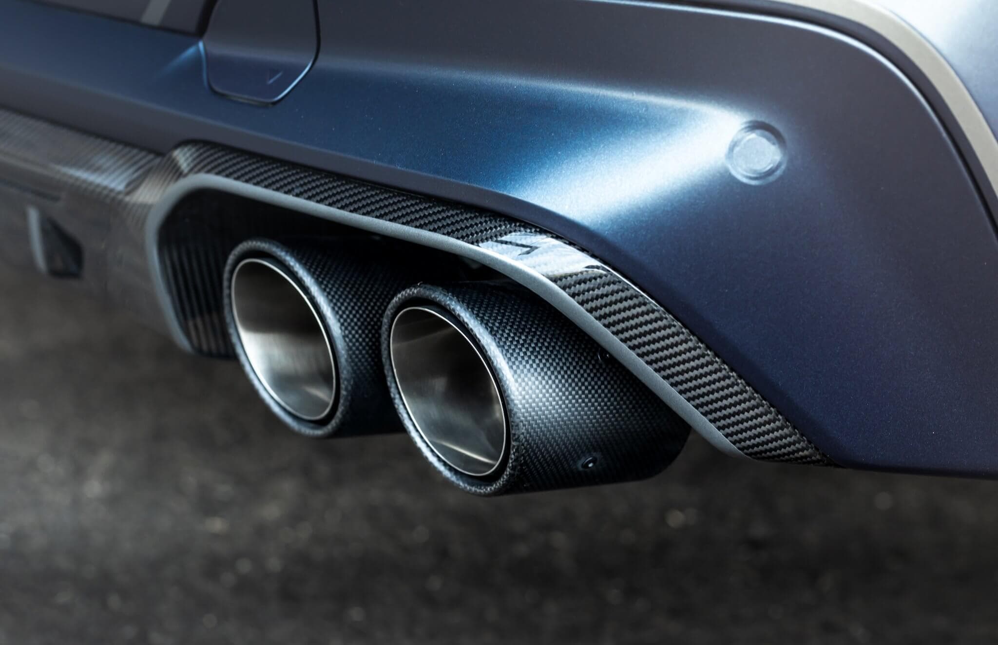 The menacing quad exhaust is housed in a carbon fiber diffuser as part of a body kit made from the lightweight material. It’s also noticeable at the front where the splitter has been bathed in carbon fiber, much like the side inlets and the trim pieces around the air intakes. The rest of the body has been covered in a matte dark blue wrap with retro white decals on the side.