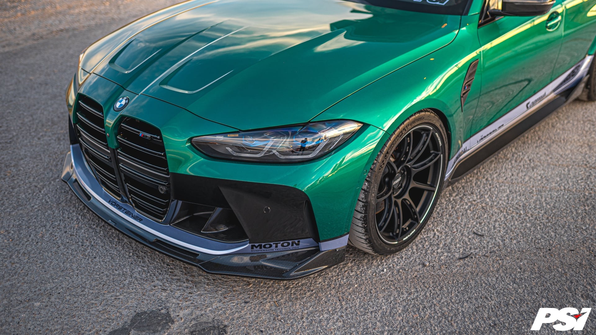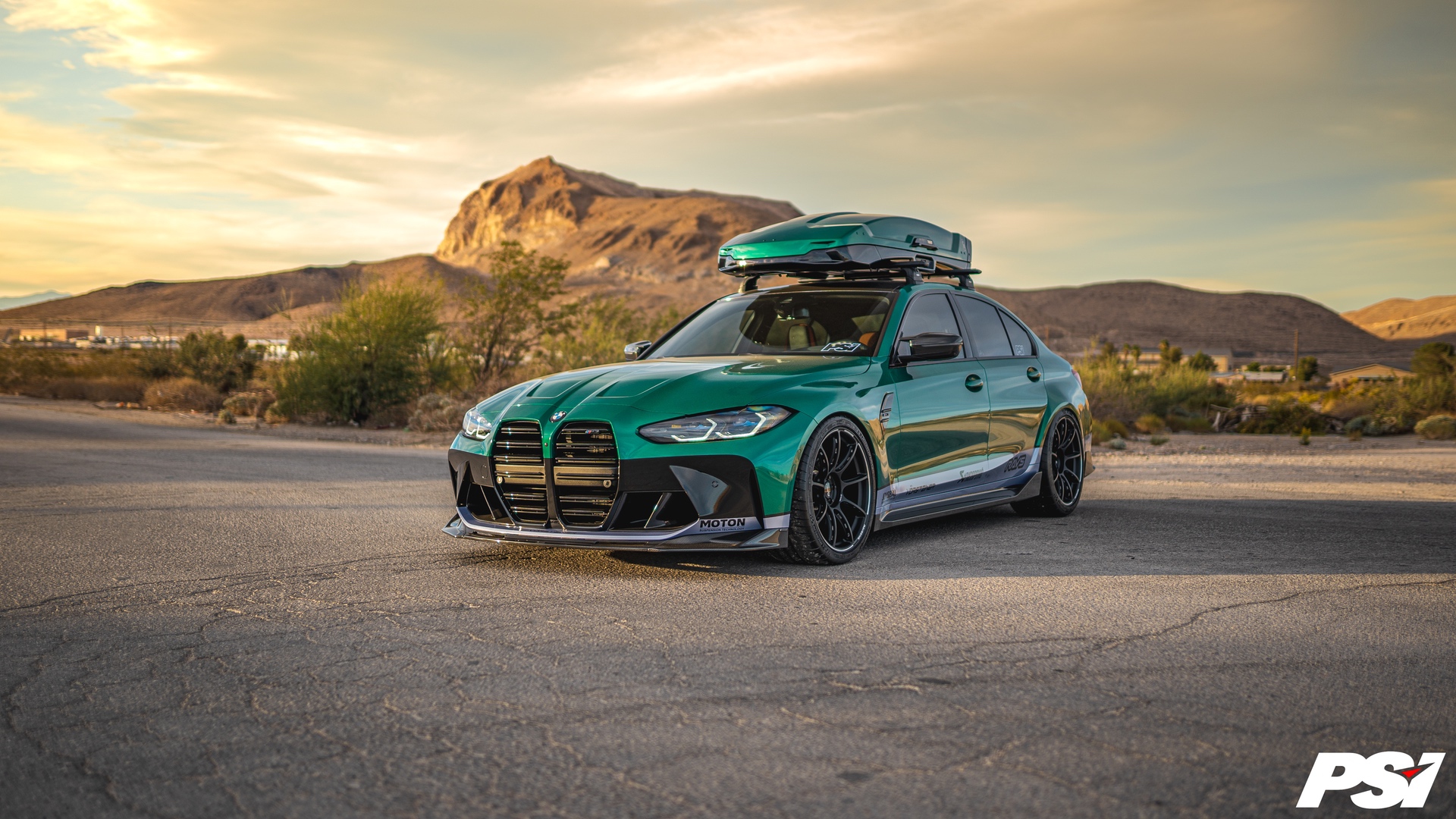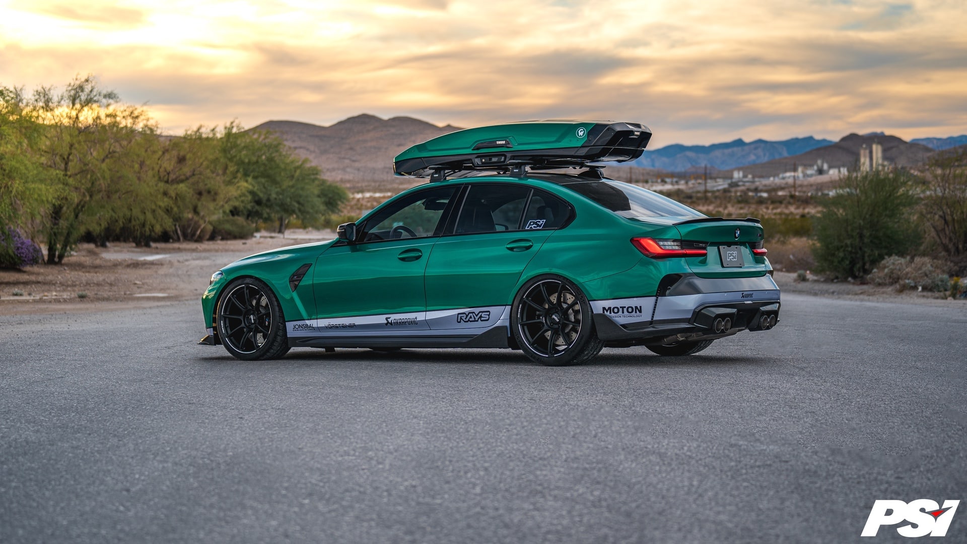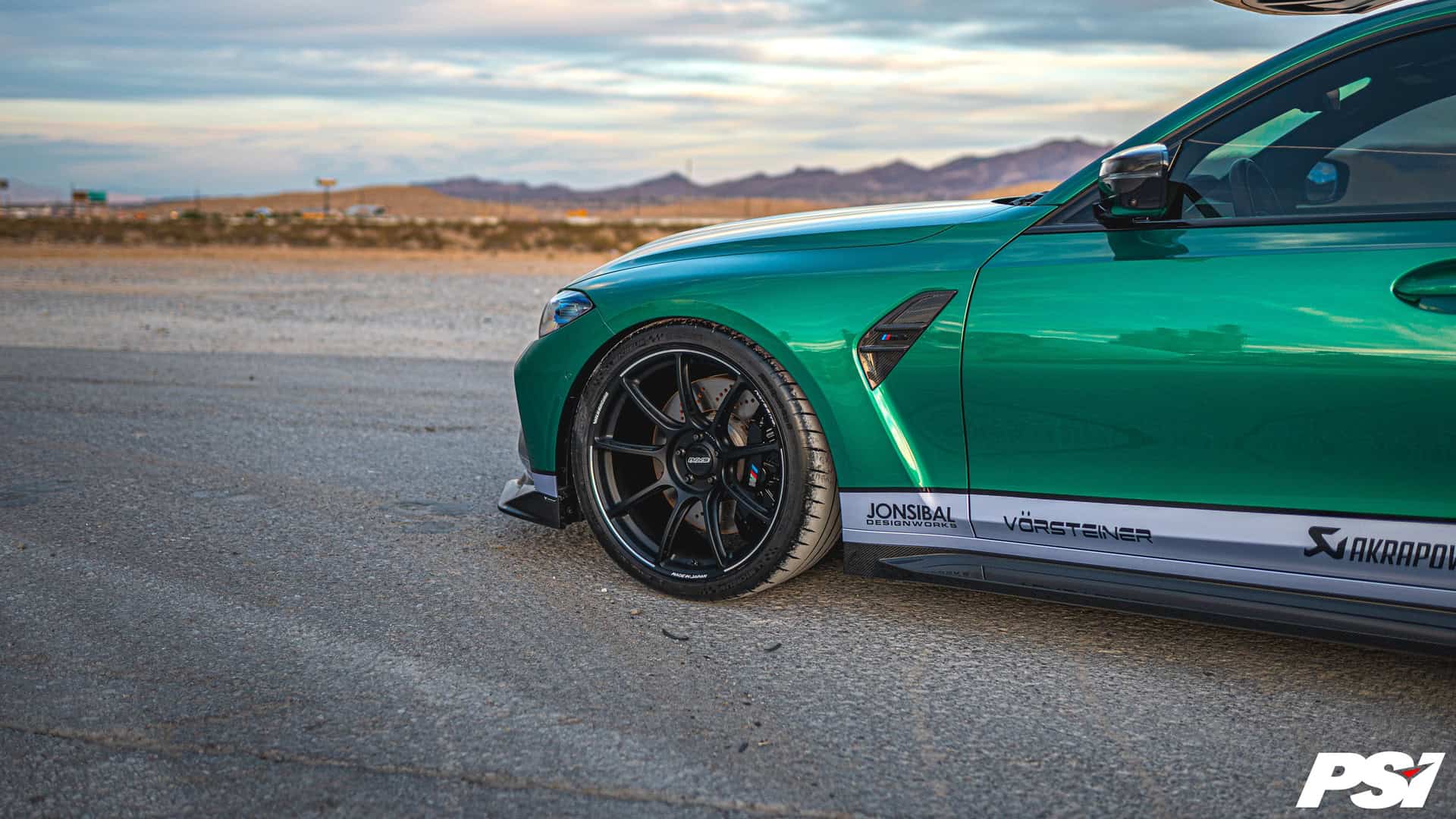 Next, the color scheme had to be right. Which is why PSI chose Isle of Man Green and a Kyalami Orange interior. It’s a color combo we’ve seen before and one that looks killer each and ever time we see it. Also, it makes for a unique car right from the factory. How many green performance sedans with manual transmissions and orange interiors do you see from the factory? PSI then swapped out the stock wheels for Rays GT090 Blast Black wheels, which are far better looking and also lighter. They’re slightly staggered, too; 20×11 out back and 20×10 up front. To get the perfect stance, Moton one-way adjustable coilovers were fitted, which are G80 M3-specific and provide great compromise between handling and comfort.