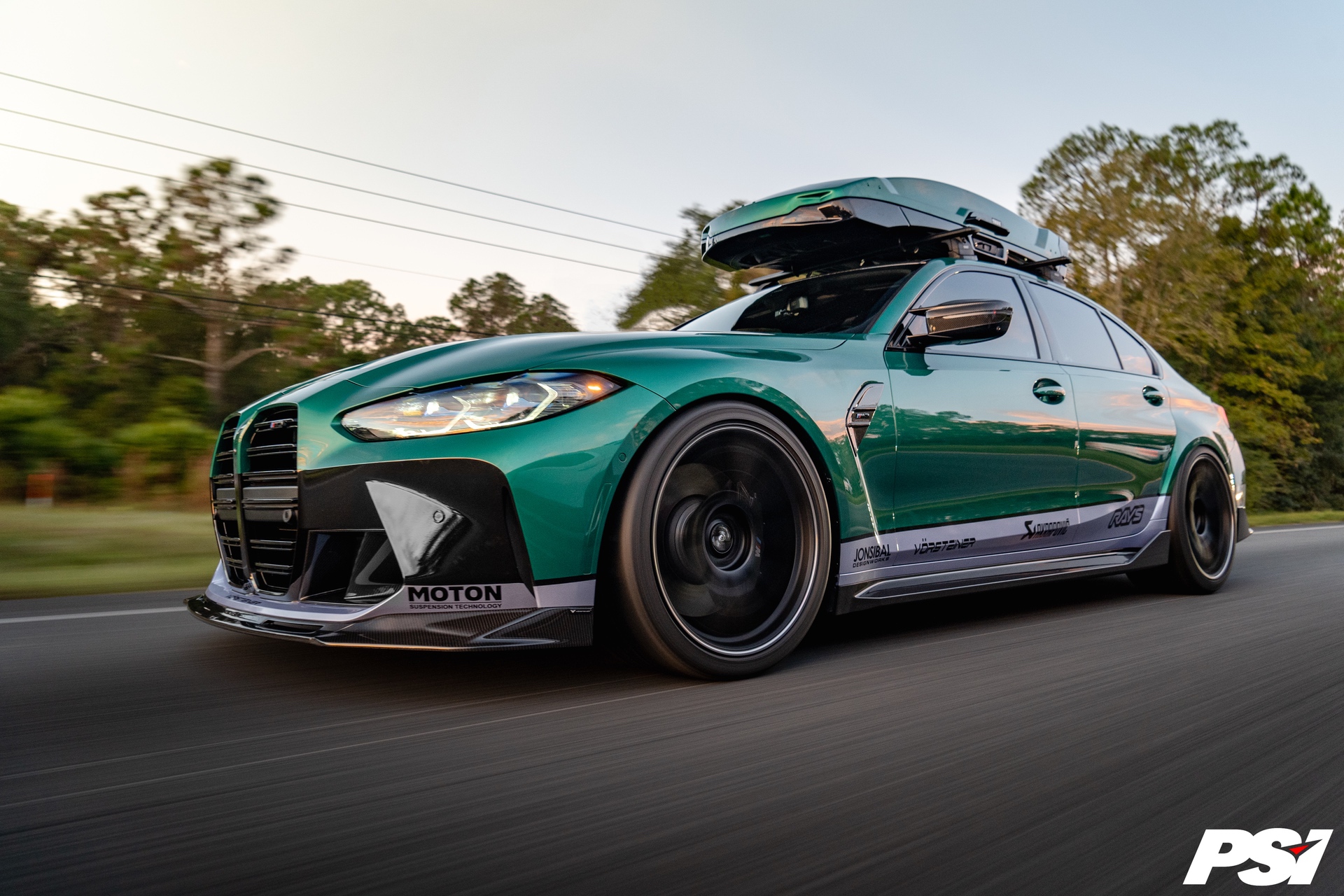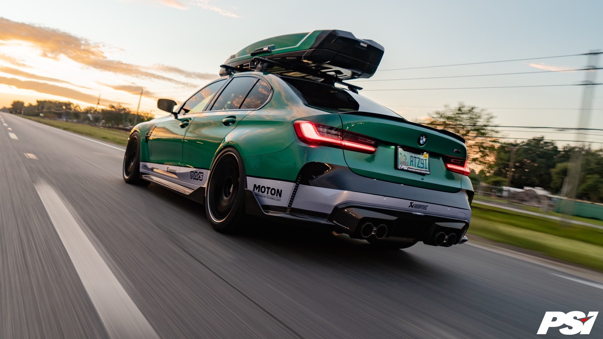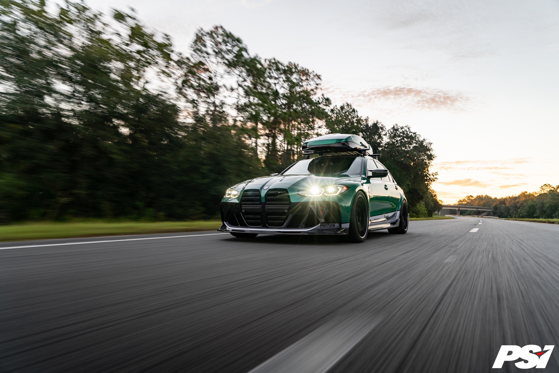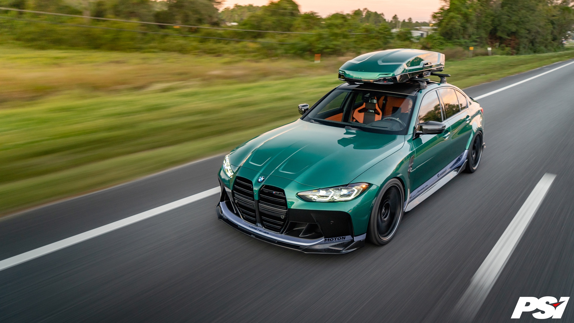 Next, the color scheme had to be right. Which is why PSI chose Isle of Man Green and a Kyalami Orange interior. It’s a color combo we’ve seen before and one that looks killer each and ever time we see it. Also, it makes for a unique car right from the factory. How many green performance sedans with manual transmissions and orange interiors do you see from the factory? PSI then swapped out the stock wheels for Rays GT090 Blast Black wheels, which are far better looking and also lighter. They’re slightly staggered, too; 20×11 out back and 20×10 up front. To get the perfect stance, Moton one-way adjustable coilovers were fitted, which are G80 M3-specific and provide great compromise between handling and comfort.