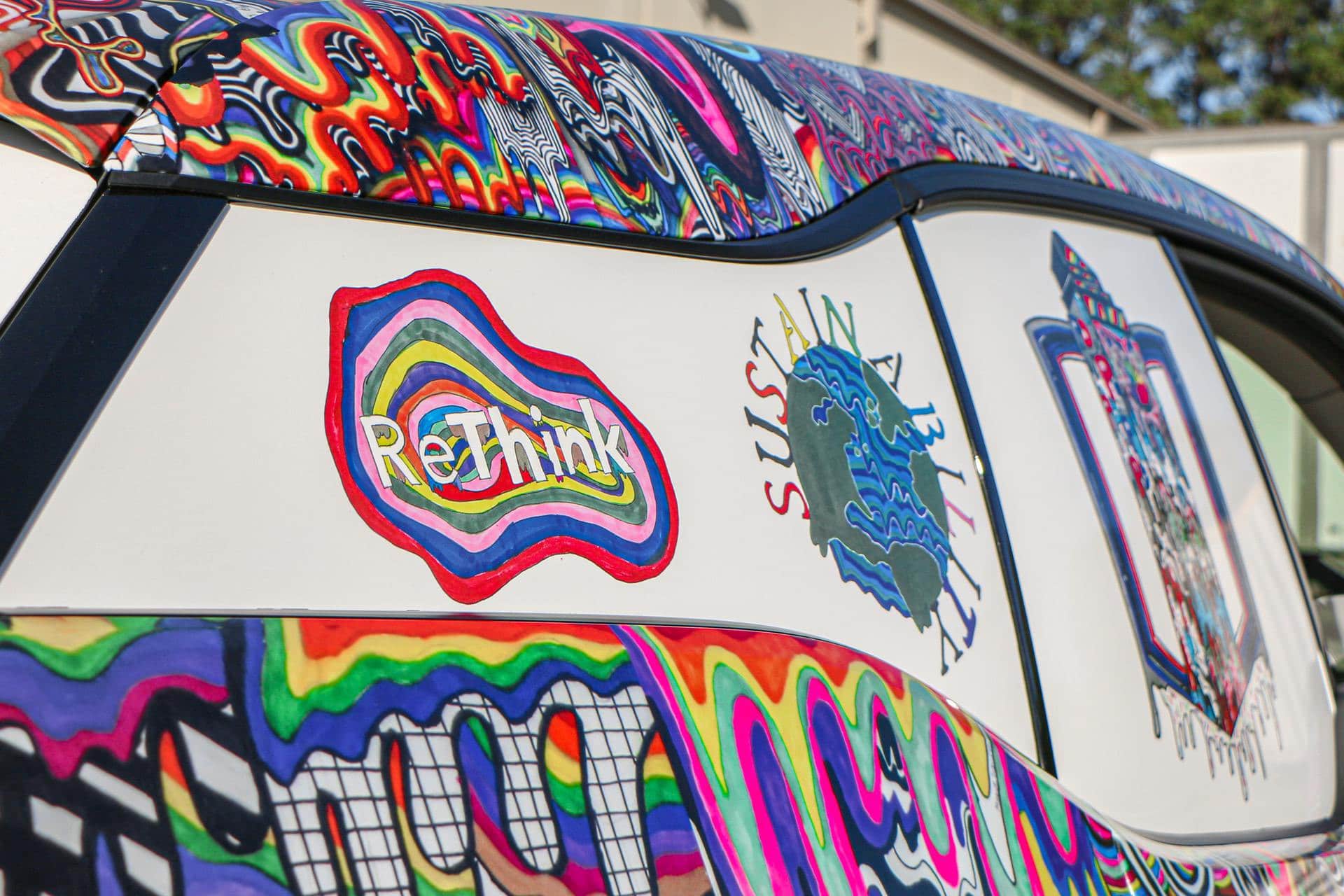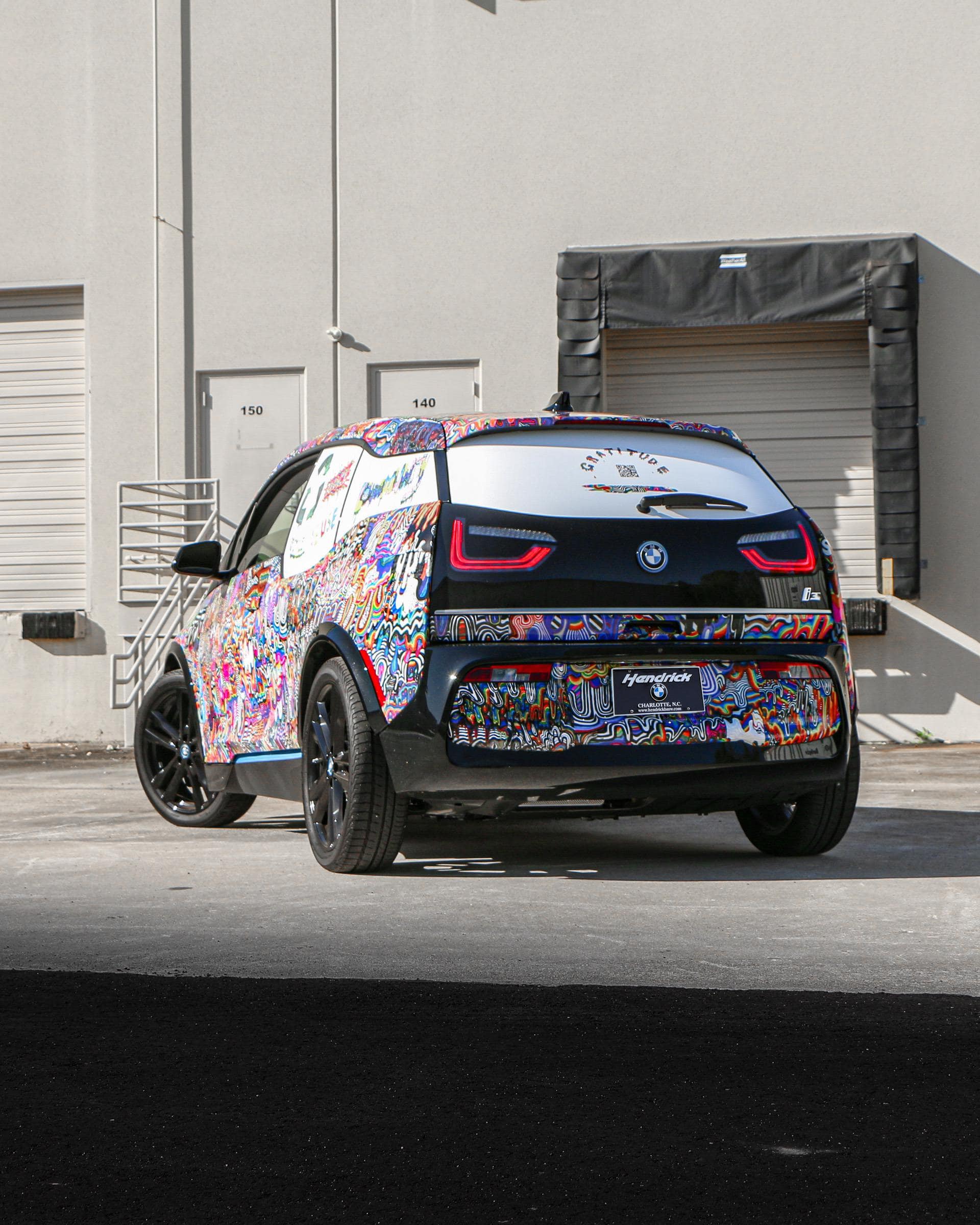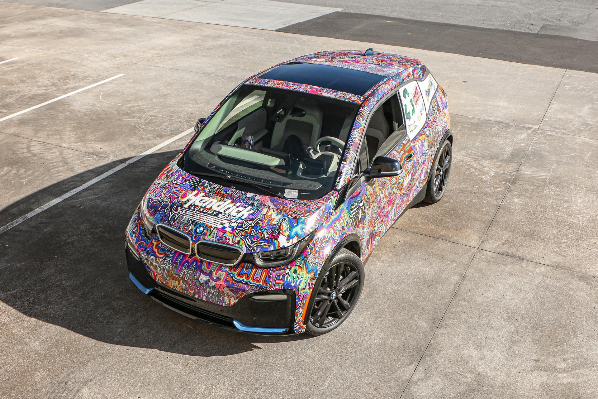 Using the aforementioned drip-art technique, nine students were chosen to focus their design on PD and BMW’s sustainability campaign principles and messaging; RE:THINK, RE:DUCE, RE:USE, RE:CYCLE, Sustainability, Gratitude, Community, PD and Clock Tower. From a far, you’d never know this student art car BMW i3 wasn’t an official BMW commission. It looks every bit as cool, funky, and artsy as any of the professionally done Art Cars. To contrast the incredibly colorful drip-art design are gloss black wheels and trim. Even the typical blue BMW i accents compliment the the vibrant design,