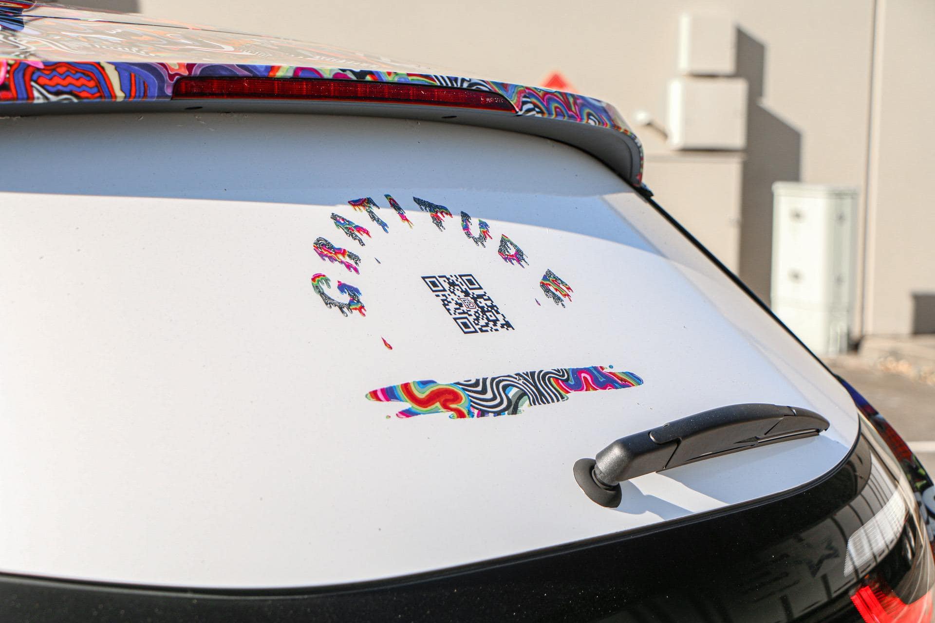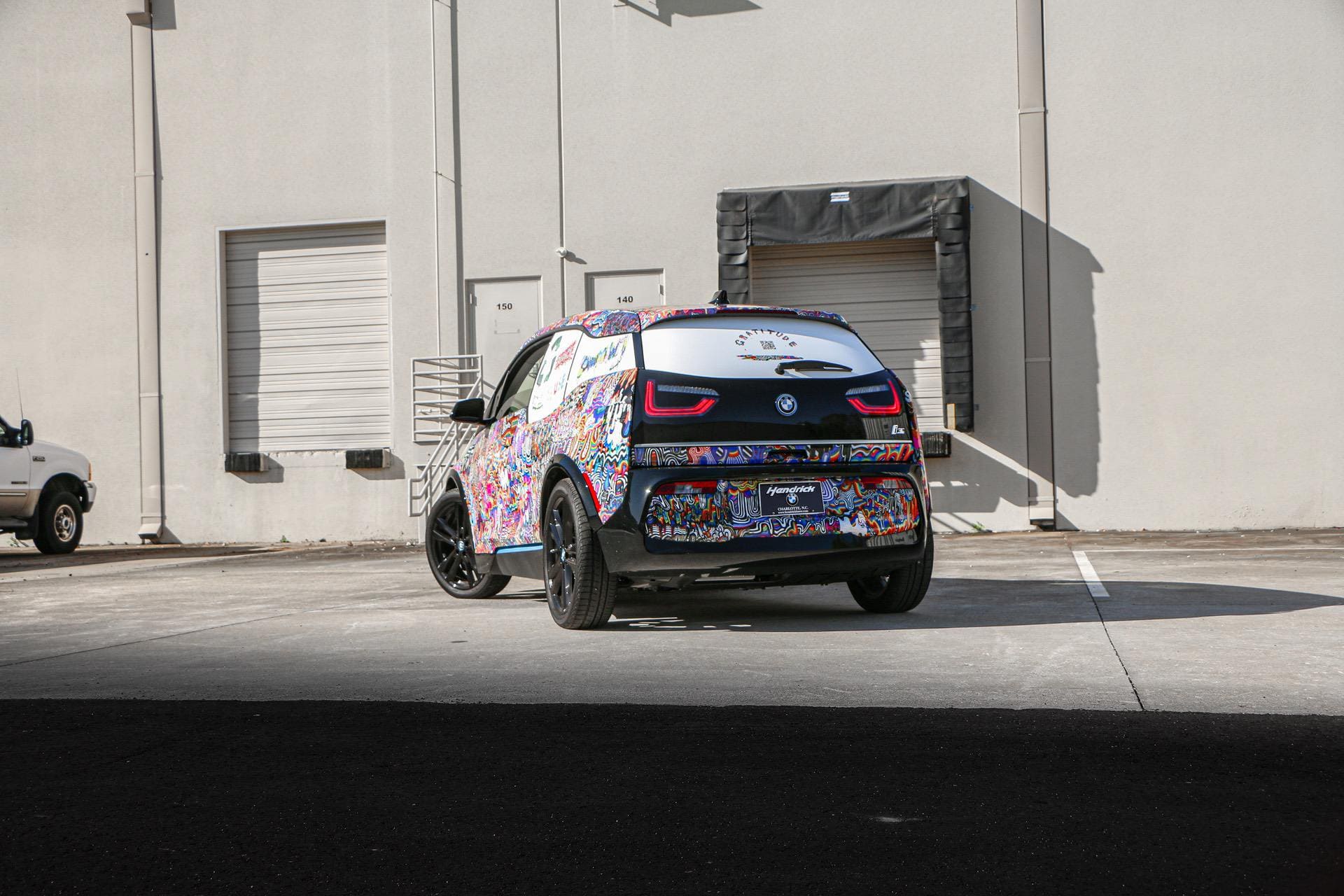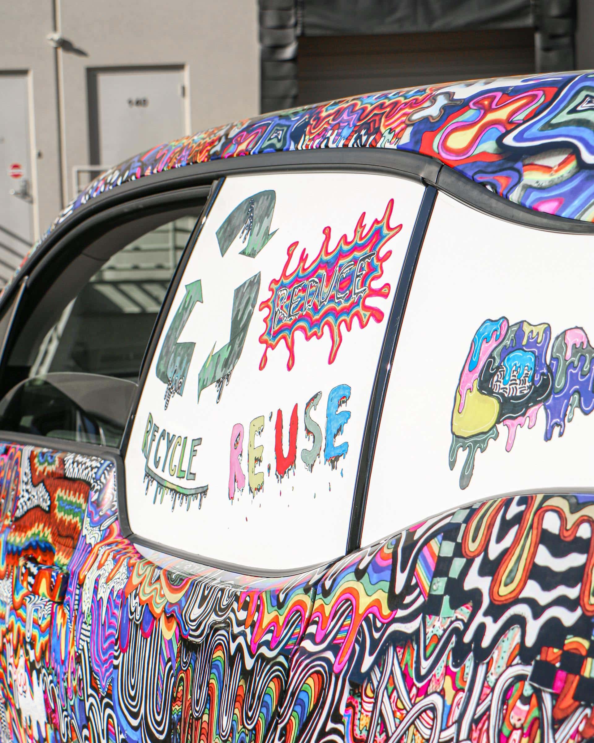 Using the aforementioned drip-art technique, nine students were chosen to focus their design on PD and BMW’s sustainability campaign principles and messaging; RE:THINK, RE:DUCE, RE:USE, RE:CYCLE, Sustainability, Gratitude, Community, PD and Clock Tower. From a far, you’d never know this student art car BMW i3 wasn’t an official BMW commission. It looks every bit as cool, funky, and artsy as any of the professionally done Art Cars. To contrast the incredibly colorful drip-art design are gloss black wheels and trim. Even the typical blue BMW i accents compliment the the vibrant design,